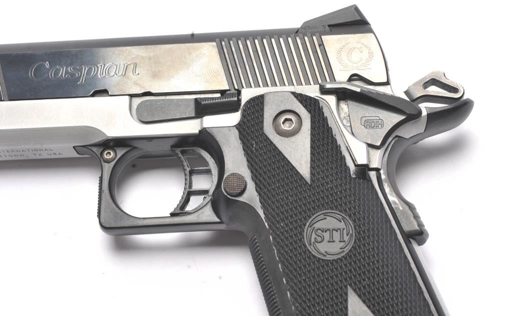 STI 2011 Caspian semi-automatic pistols, .45 ACP caliber, Serial #CM3065. The pistol is in fine overall condition with a 4” BAR-STO barrel. The Caspian marked slide retains approximately 95-96% of the blue finish withNovak sights. The STI frame is matte stainless marked, “STI INTERNATIONAL GEORGETOWN, TX USA” on the underside of the frame. The trigger and hammer are skeletonized with a beaver tail safety. Thepistol includes an RDIH cocking system with ambidextrous decocker. The checkered plastic grips are in very good condition with a checkered front strap. The bore is good and action are crisp on this desirable STI custom with one correct magazine. Est.: $2,500-$5,000. (Modern/PPT).