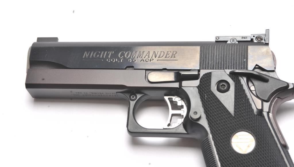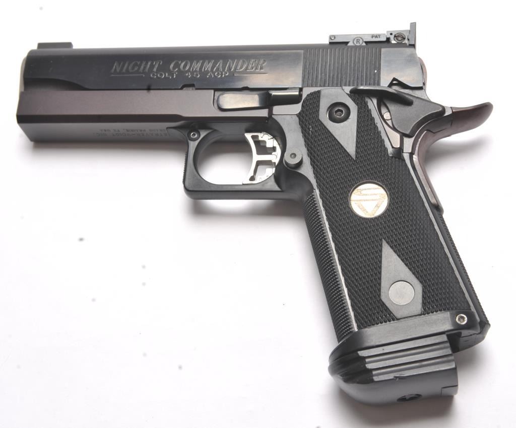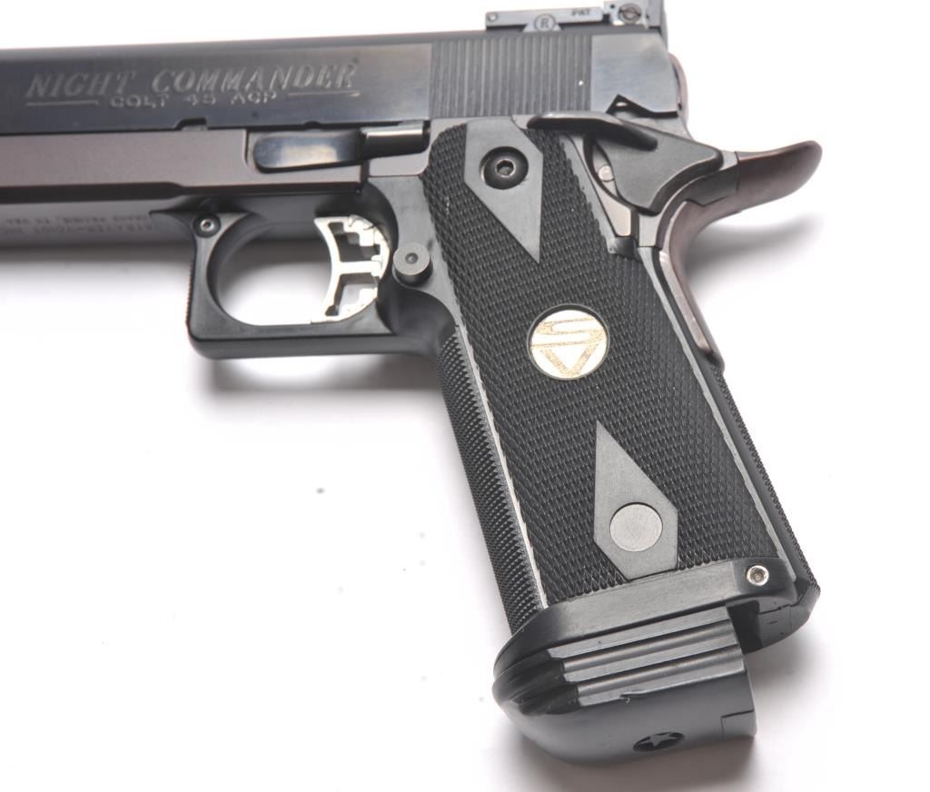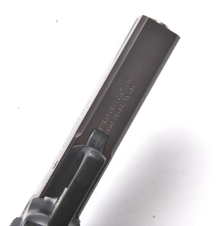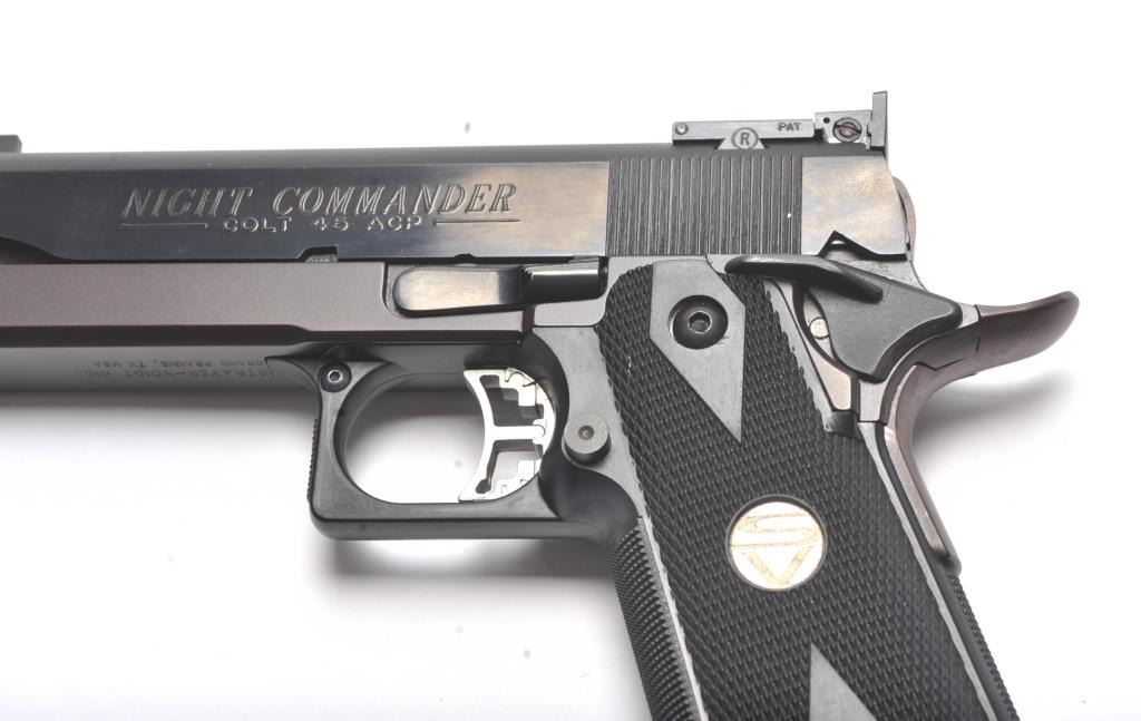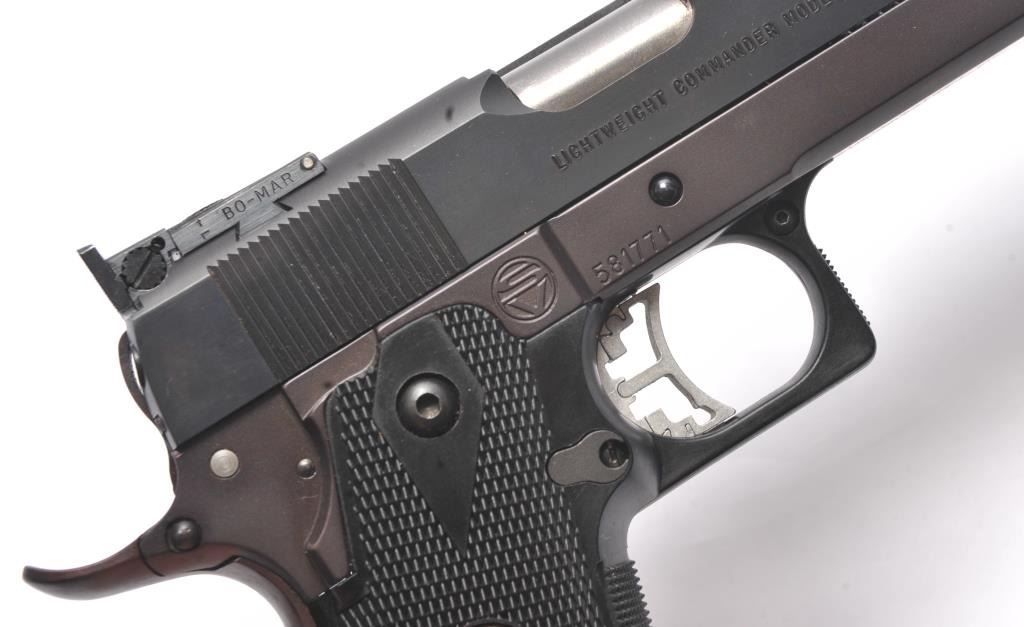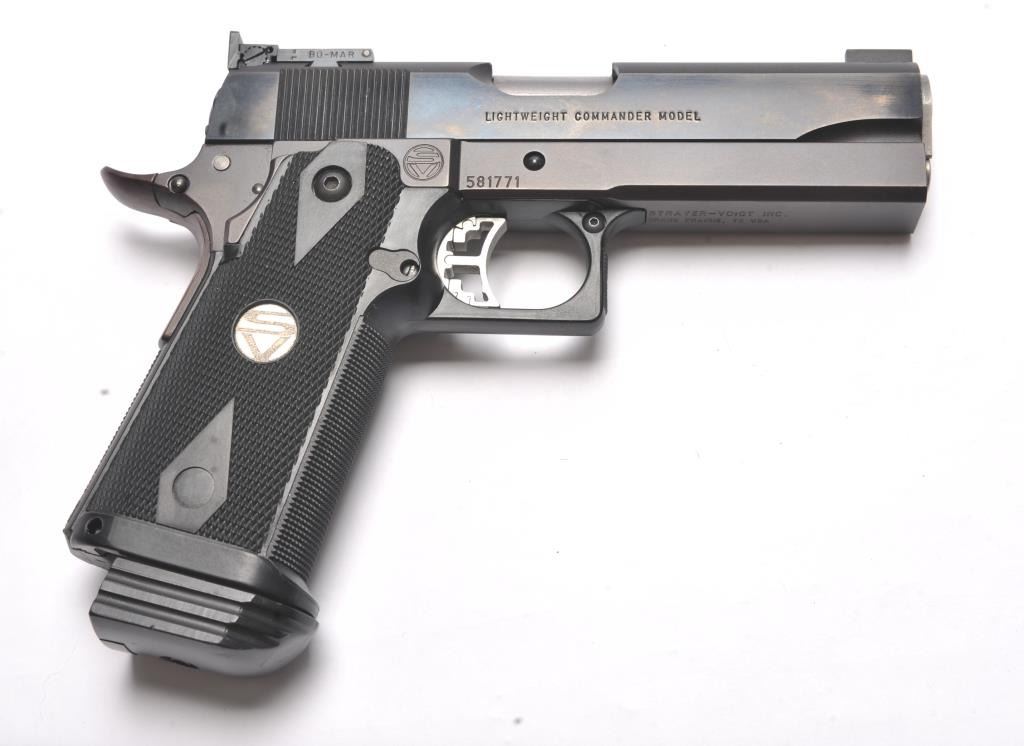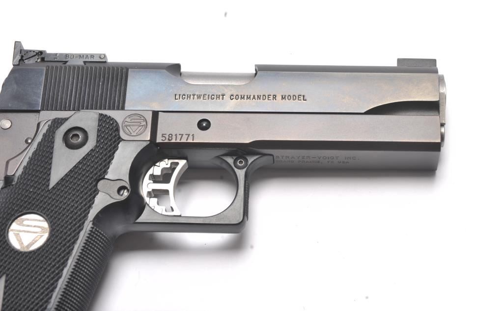 Strayer-Voigt Lightweight Commander Model semi-automatic pistol, .45 ACP caliber, Serial #581771. The pistol is in minty overall condition with a 4” barrel with a blade front and Bomar adjustable rear sights. The pistol retains approximately 99% of the blue finish. The slide is marked Colt Night Commander and the underside of the frame is marked,”STRAYER-VOIGT INC. GRAND PRAIRIE TX USA”. The checkered plastic medallion grips are in excellent condition with checkered front and back straps. The pistol also features a beaver tail safety and skeletonized trigger. The bore is very good and the action is crisp on this lightly usedLightweight Commander by Strayer-Voigt. The lot includes one correct hi-capacity magazine, not available to California residents or where prohibited. Est.: $2,500-$5,000. (Modern/PPT).