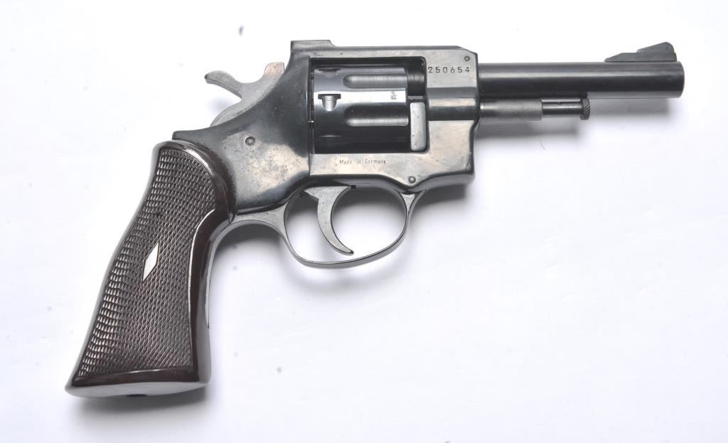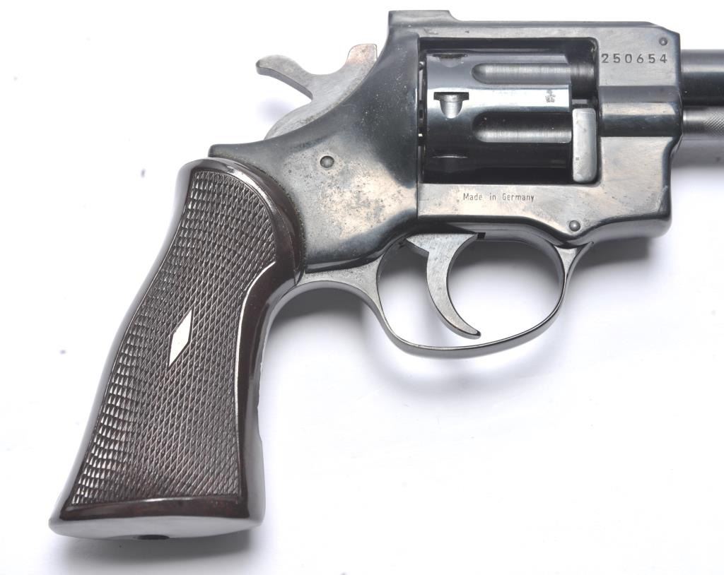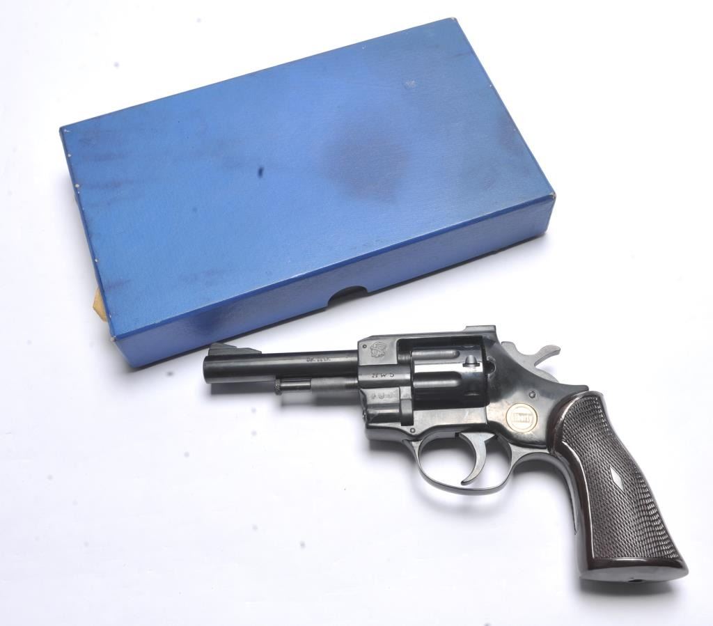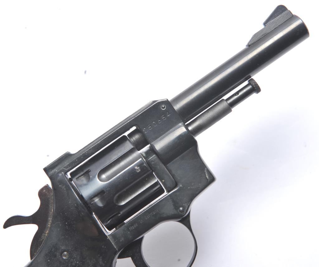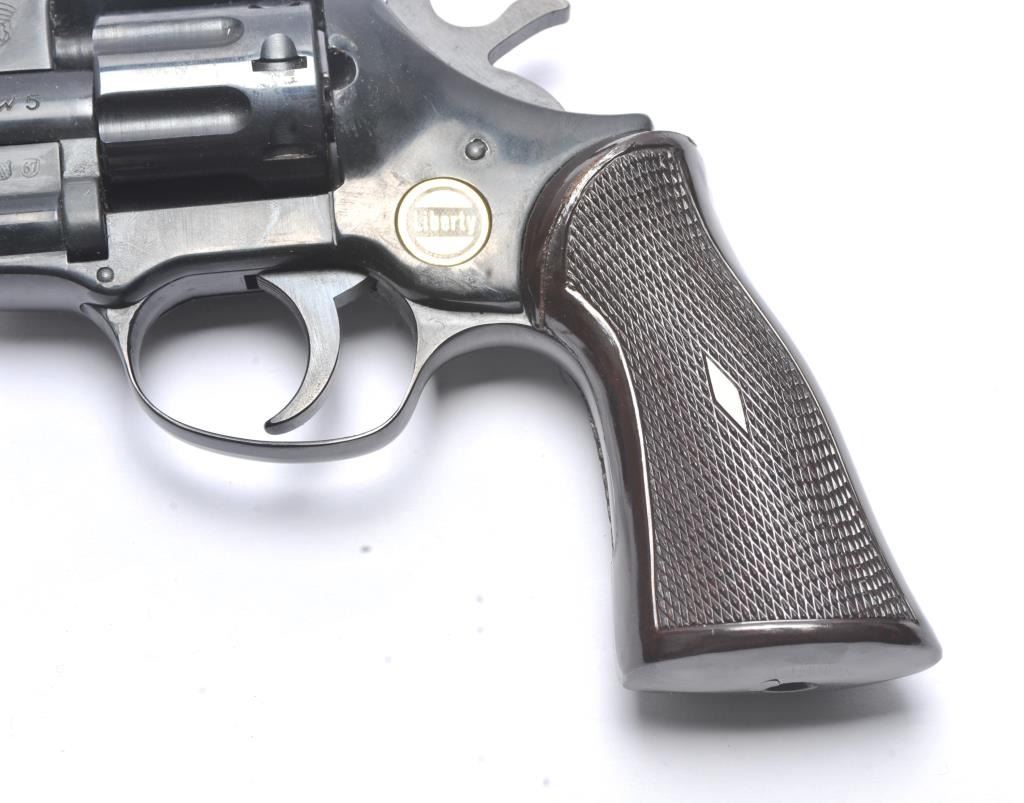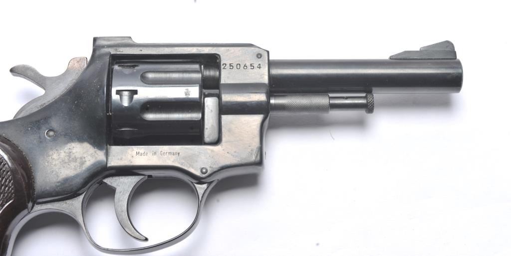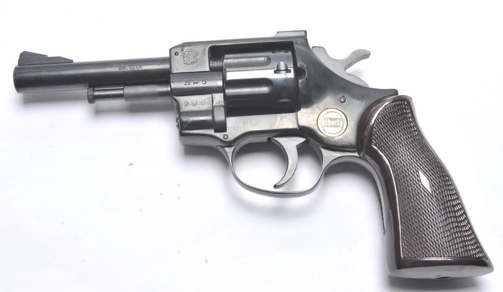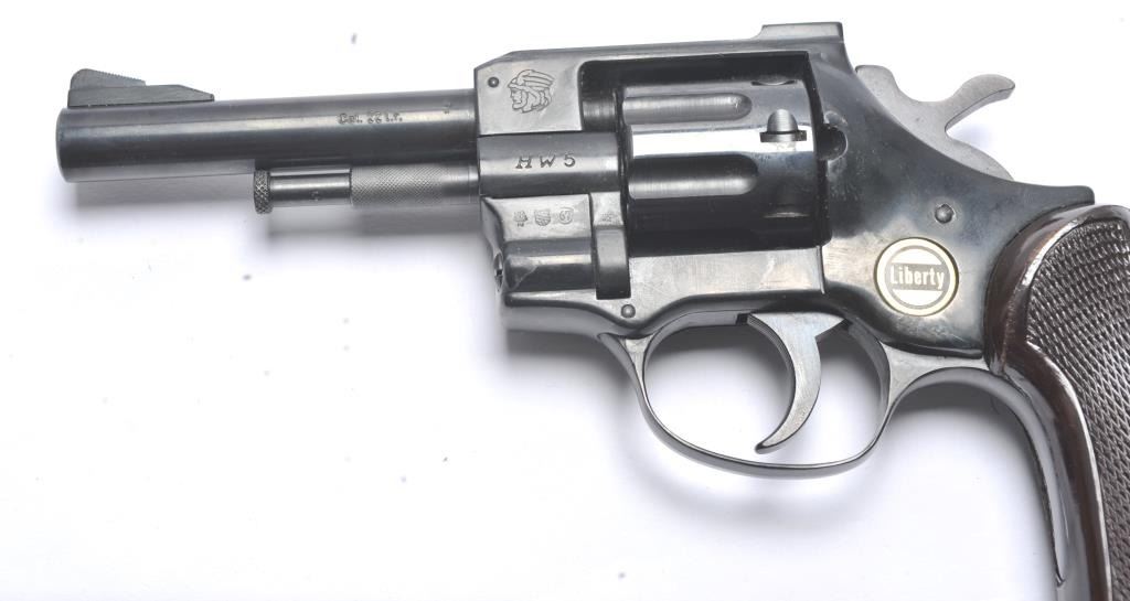Liberty Model HW 5 DA revolver, .22 Long Rifle caliber, Serial #250654. The pistol is in very good overall condition with a 4” barrel with a ramped blade front and fixed rear sights. The pistol retains the majority of the blue finish. The pistol shows numerous proofs, “MADE IN GERMANY” on the frame and no visible import marks. The checkered plastic grips are in very good condition. The bore is good and the actionis crisp. The lot includes the original factory cardboard box with matching end label. Est.: $150-$300. (C+R/PPT).