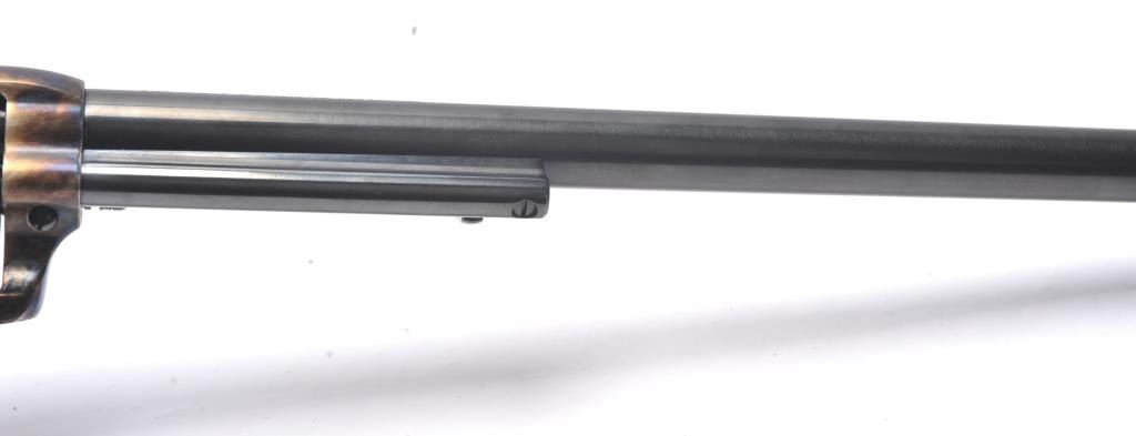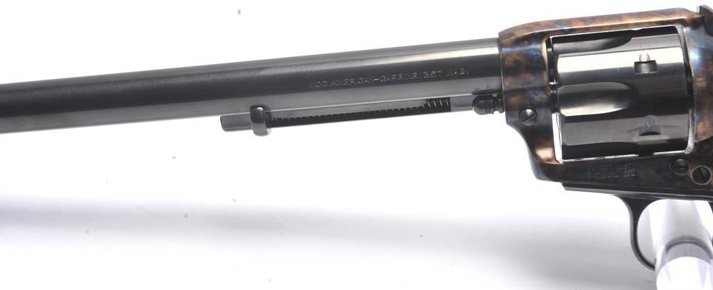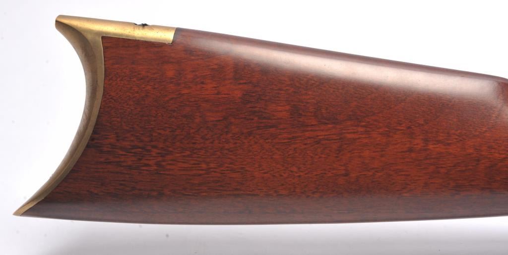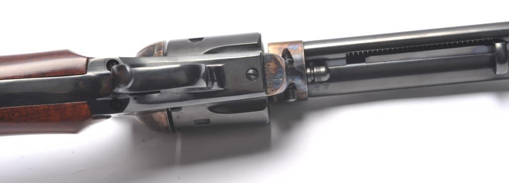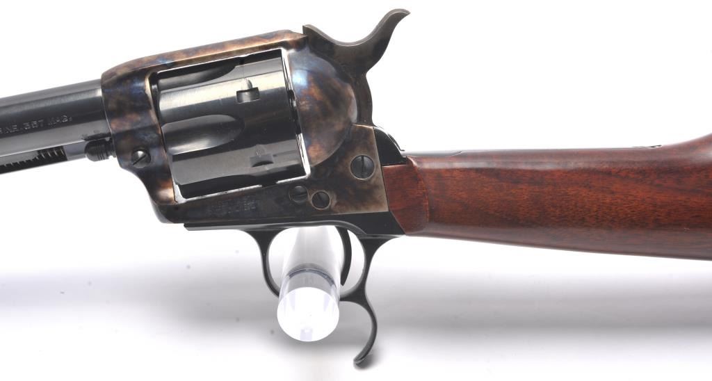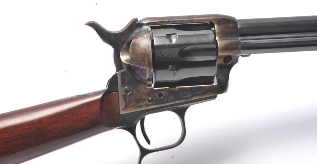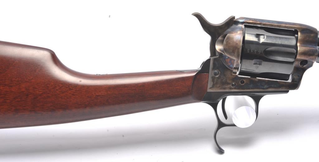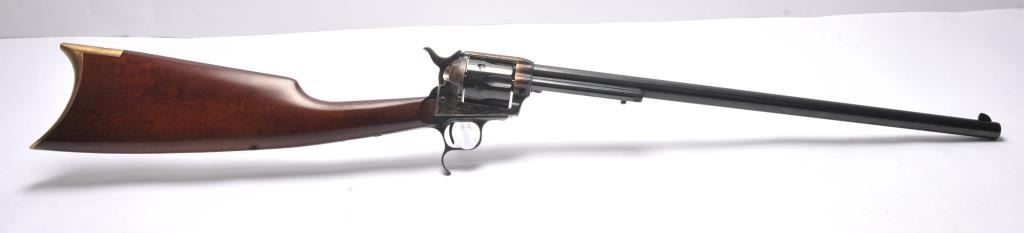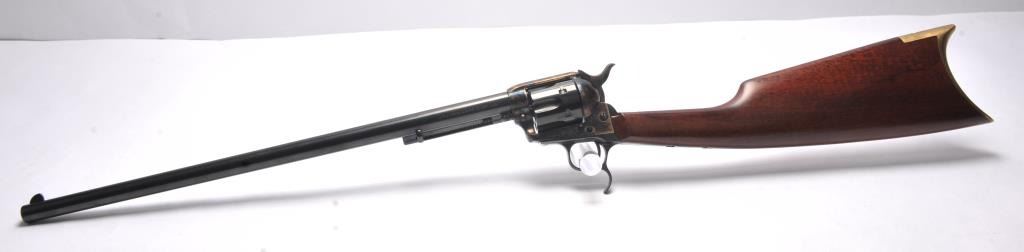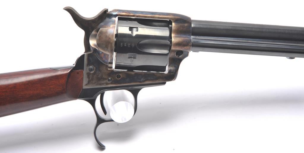 Uberti American Carbine, .357 Magnum caliber, Serial #U64969. The carbine is in near excellent condition with an 18” barrel marked, “TAYLOR’S & CO. WINCHESTER VA.” On top. The carbine retains approximately98-99% of the blue finish with bright vivid case color on the frame and hammer. The smooth wood butt stock is in very good condition with a brass crescent buttstock. The bore is good and the action is crisp onthis lightly used reproduction revolving carbine. Est.: $600-$1,200. (Modern/PPT).