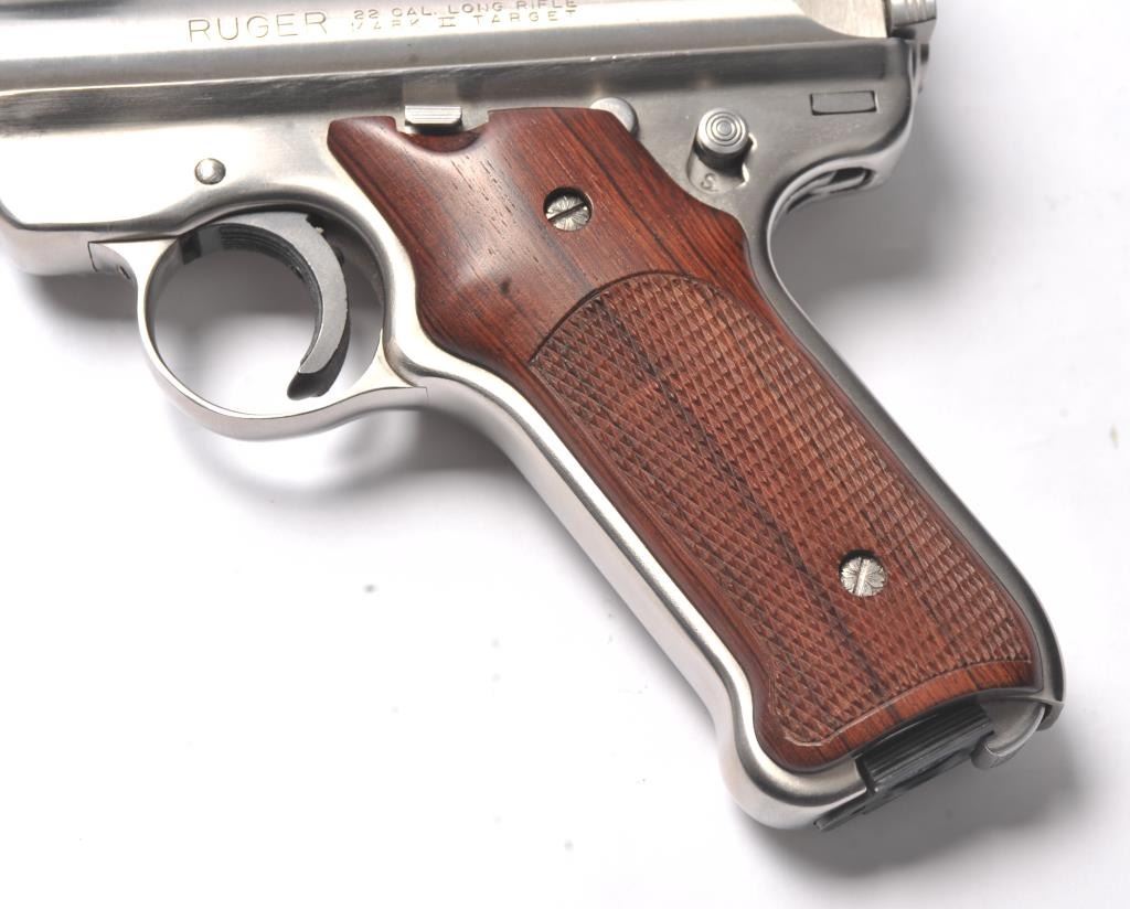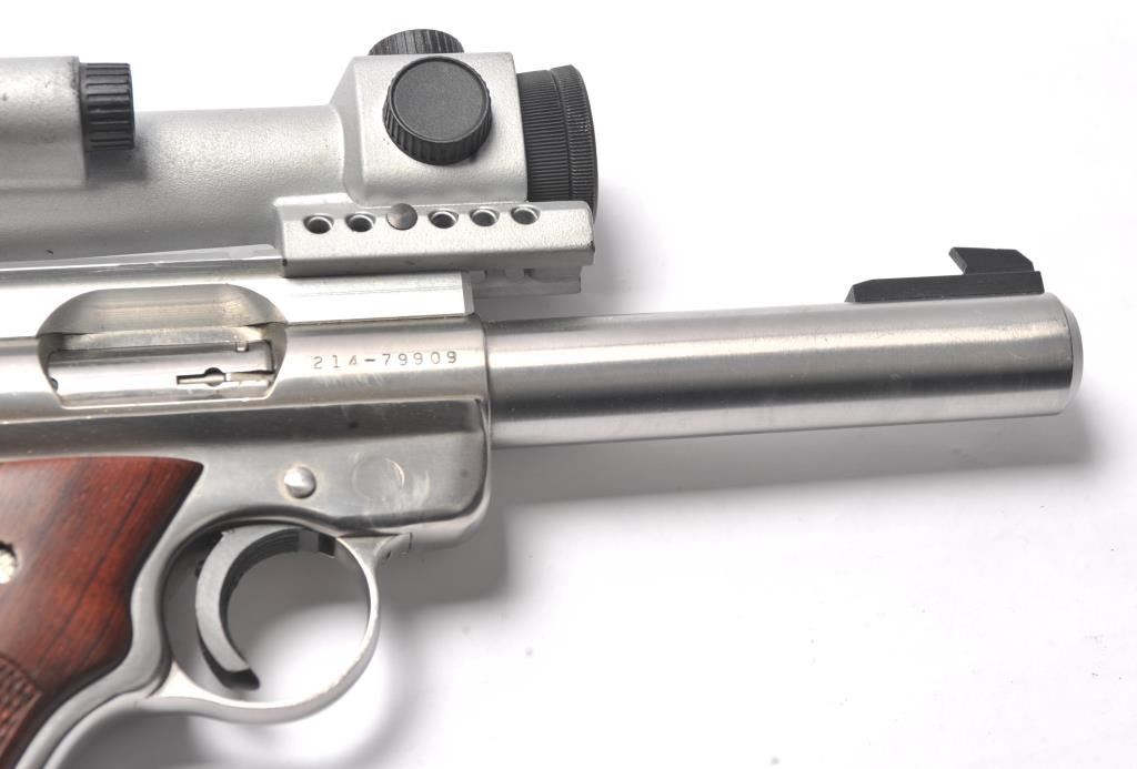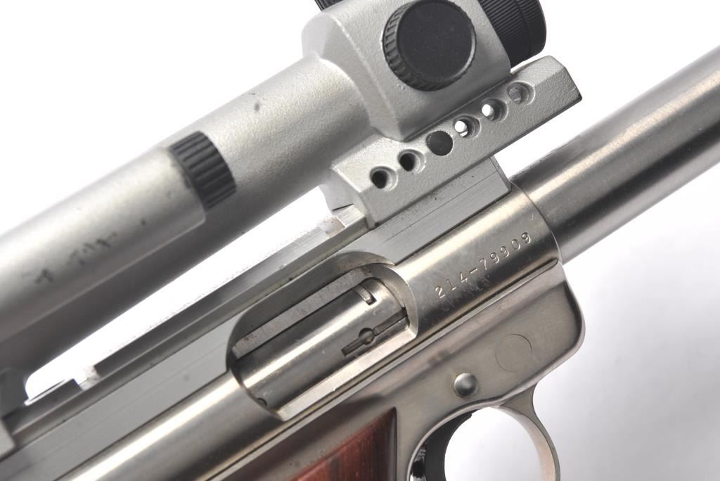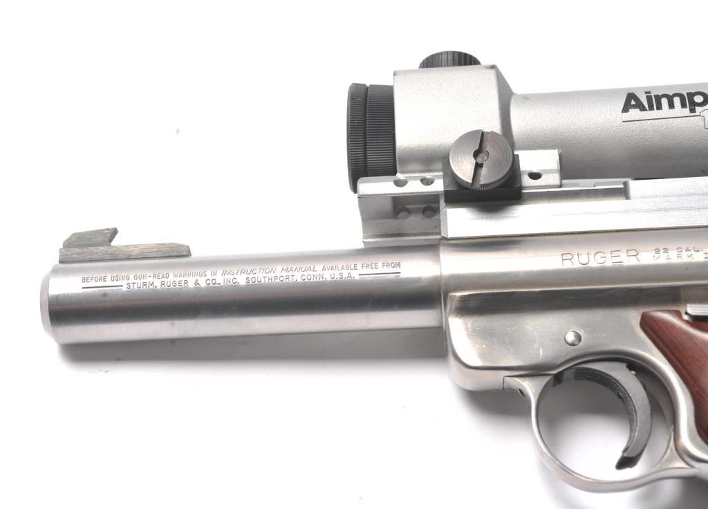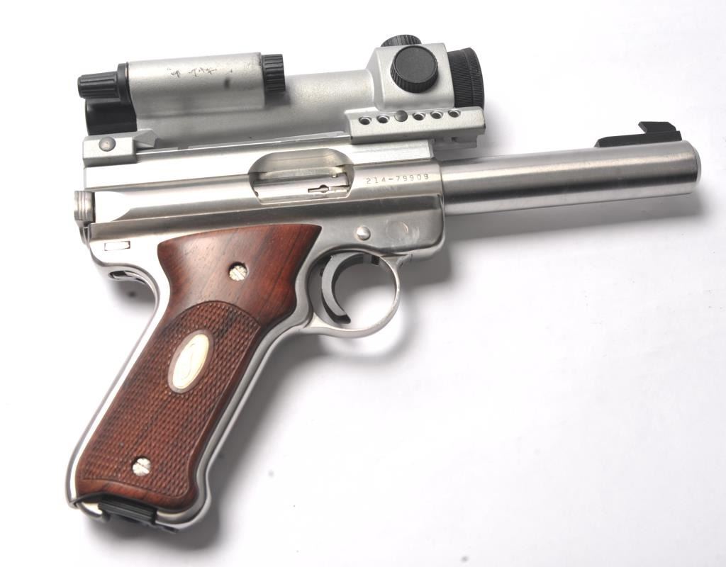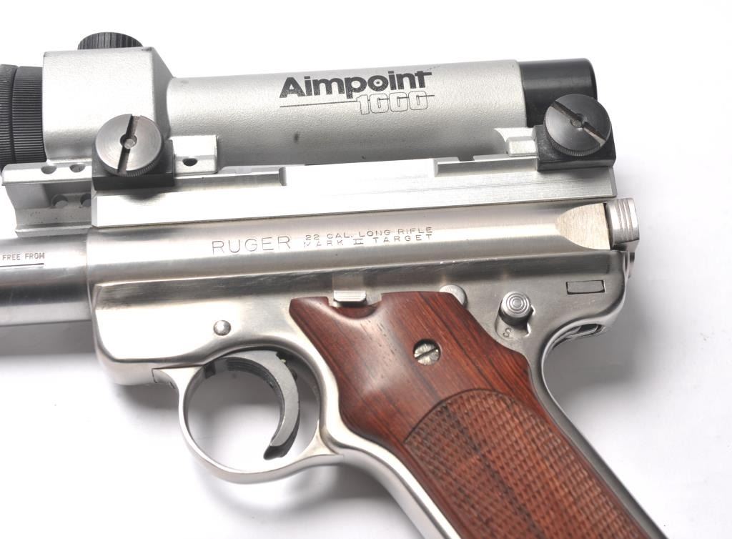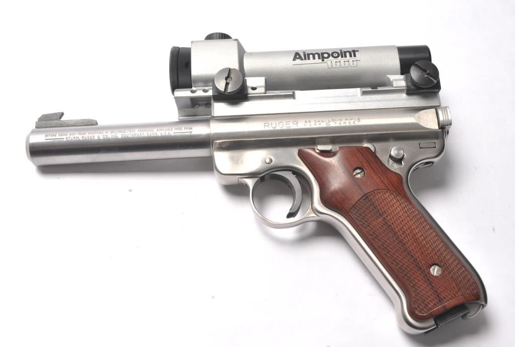 Ruger Mark II Target semi-automatic pistol, .22 Long Rifle caliber, Serial #214-79909. The pistol is in very good overall condition with a 6 ¾” bull barrel. The pistol retains a significant amount of matte stainless steel finish with scuffs and scratches from field use. The checkered wood grips are in very good condition with sharp checkering and an escutcheon plate on the right panel with an inscribed, “S”. The pistol is topped with an Aimpoint 1000 red dot sight. The bore is good and the action is crisp on this desirable heavy barreled Ruger. The lot includes the Ruger and Aimpoint owner’s manual and two correct Ruger markedmagazines. According to the consignor, the pistol has been upgraded with a custom trigger and action job. Est.: $500-$1,000. (Modern/PPT).