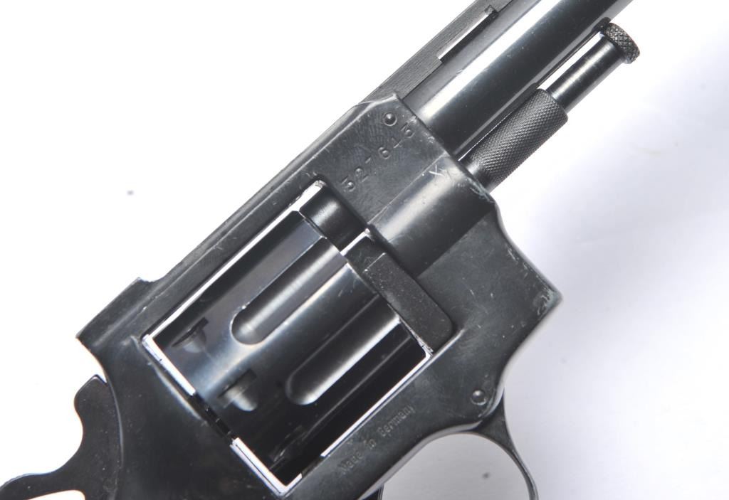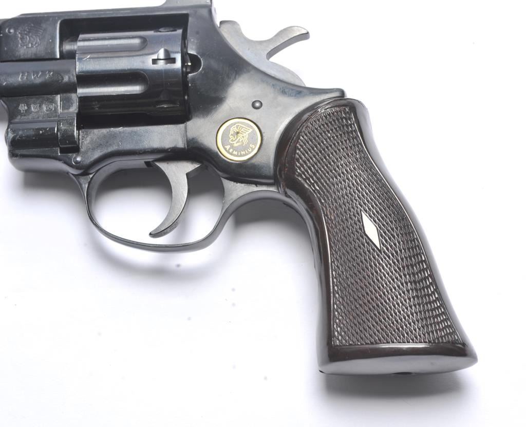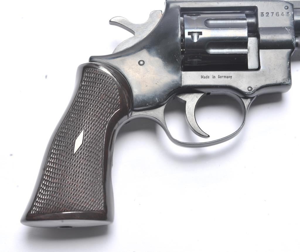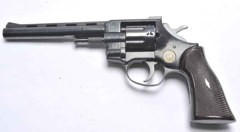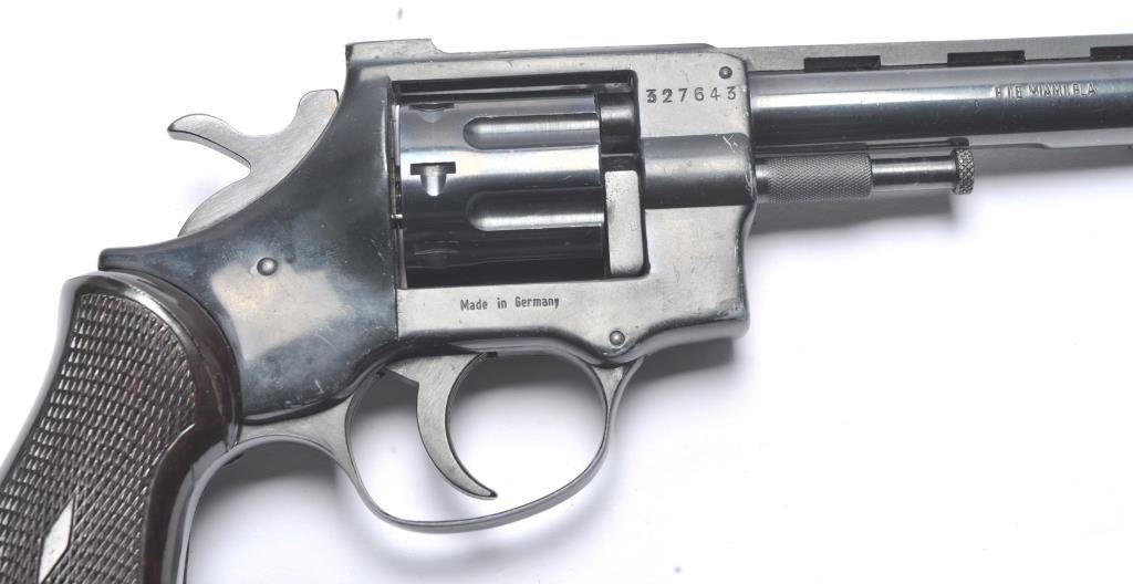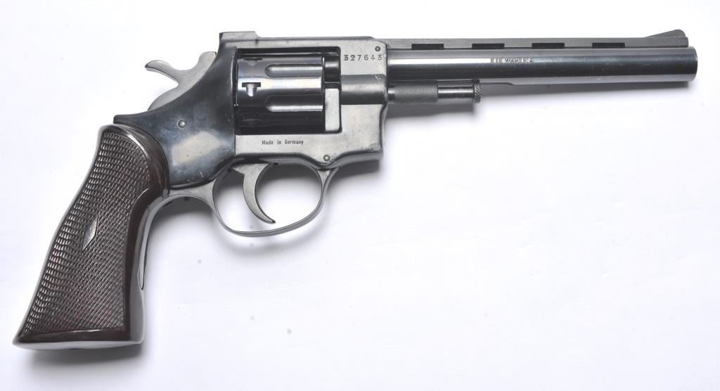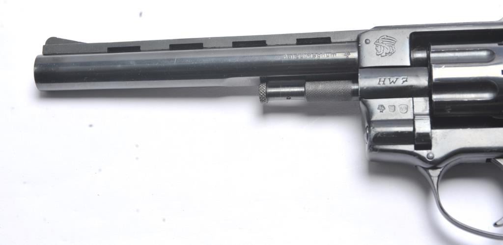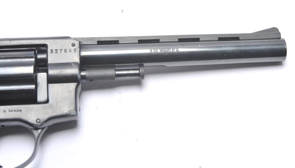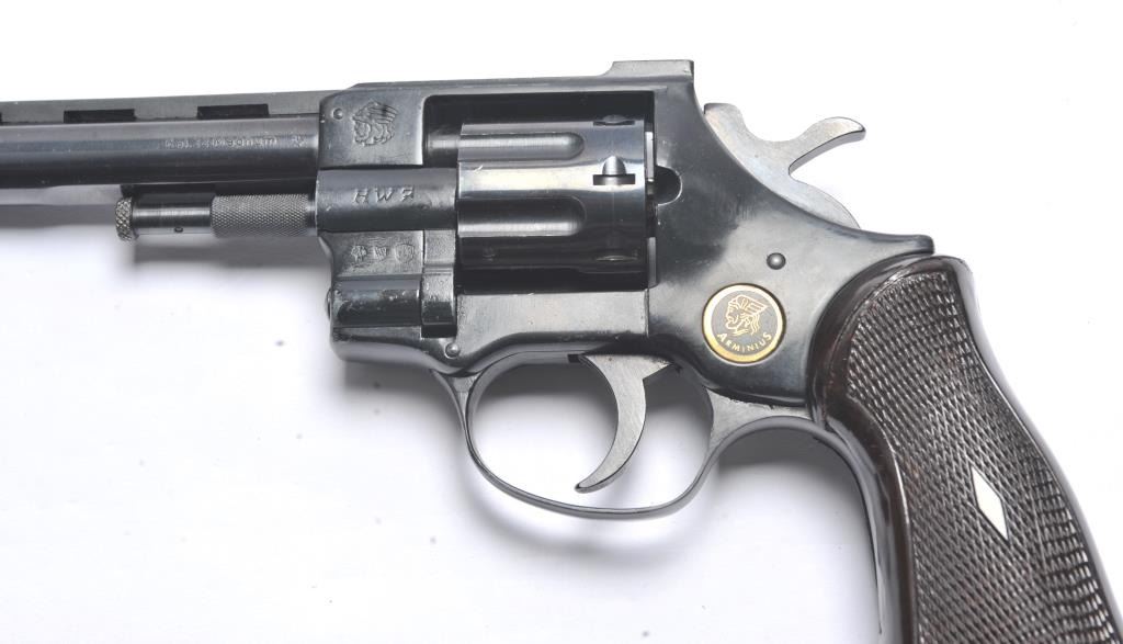 Arminius Model HW 7 DA revolver, .22 Magnum caliber, Serial #327643. The pistol is in very good overall condition with a 6” barrel with a ventilated rib, ramped blade front and fixed rear sights. The pistol retains asignificant amount of muted blue finish with small mars and wear at the muzzle. The pistol shows numerous proofs, an import mark on the barrel and is marked, “MADE IN GERMANY” on the frame. The checkeredplastic grips are in good condition. The bore is good and the action is crisp. Est.: $150-$300. (C+R/PPT).