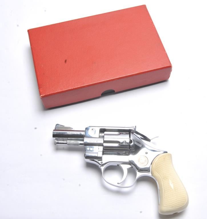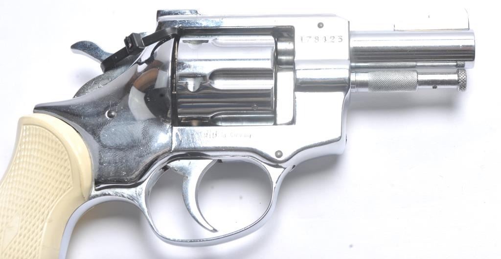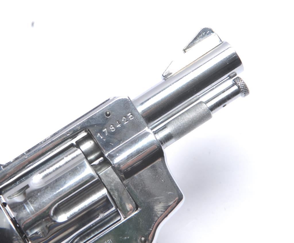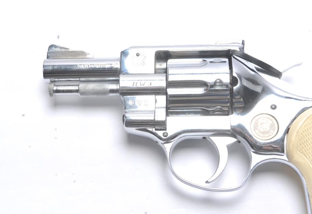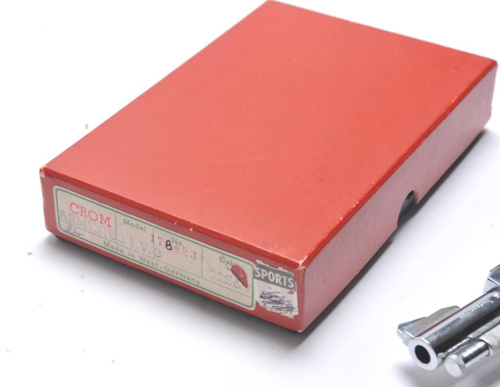Arminius Model HW 3 DA revolver, .32 S&W Long caliber, Serial #178425. The pistol is in fine overall condition with a 2 ¾” barrel with a ramped blade front and fixed rear sights. The pistol retains nearly all of the bright nickel finish. The pistol shows numerous proofs, “MADE IN GERMANY” on the frame and no visible import marks. The checkered plastic grips are in very good condition. The bore is good and the actionis crisp. The lot includes the original factory cardboard box with matching end label. Est.: $200-$400. (C+R/PPT).
