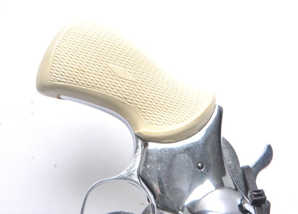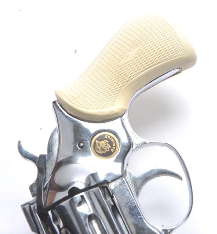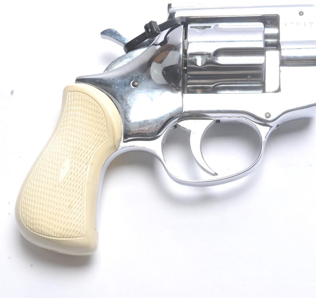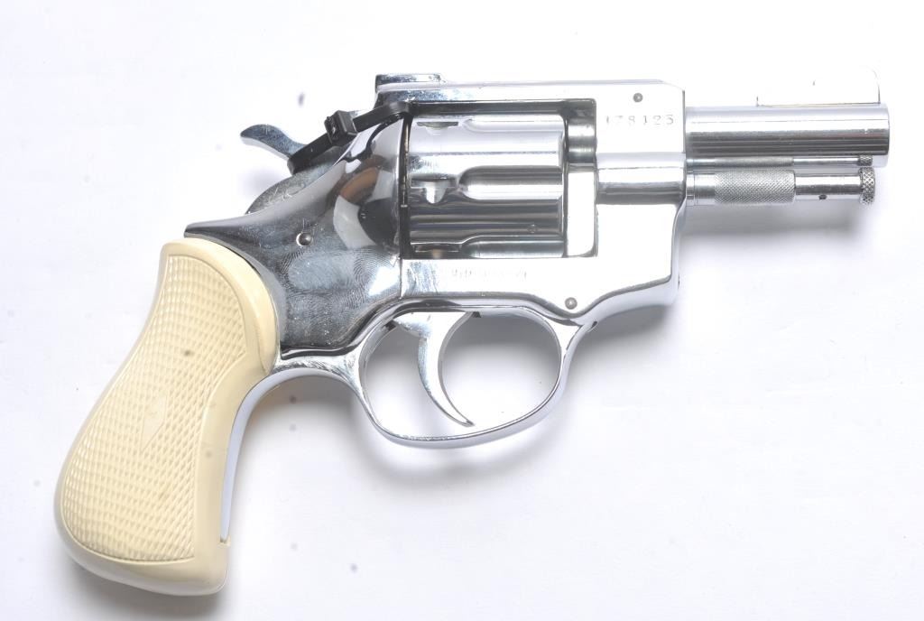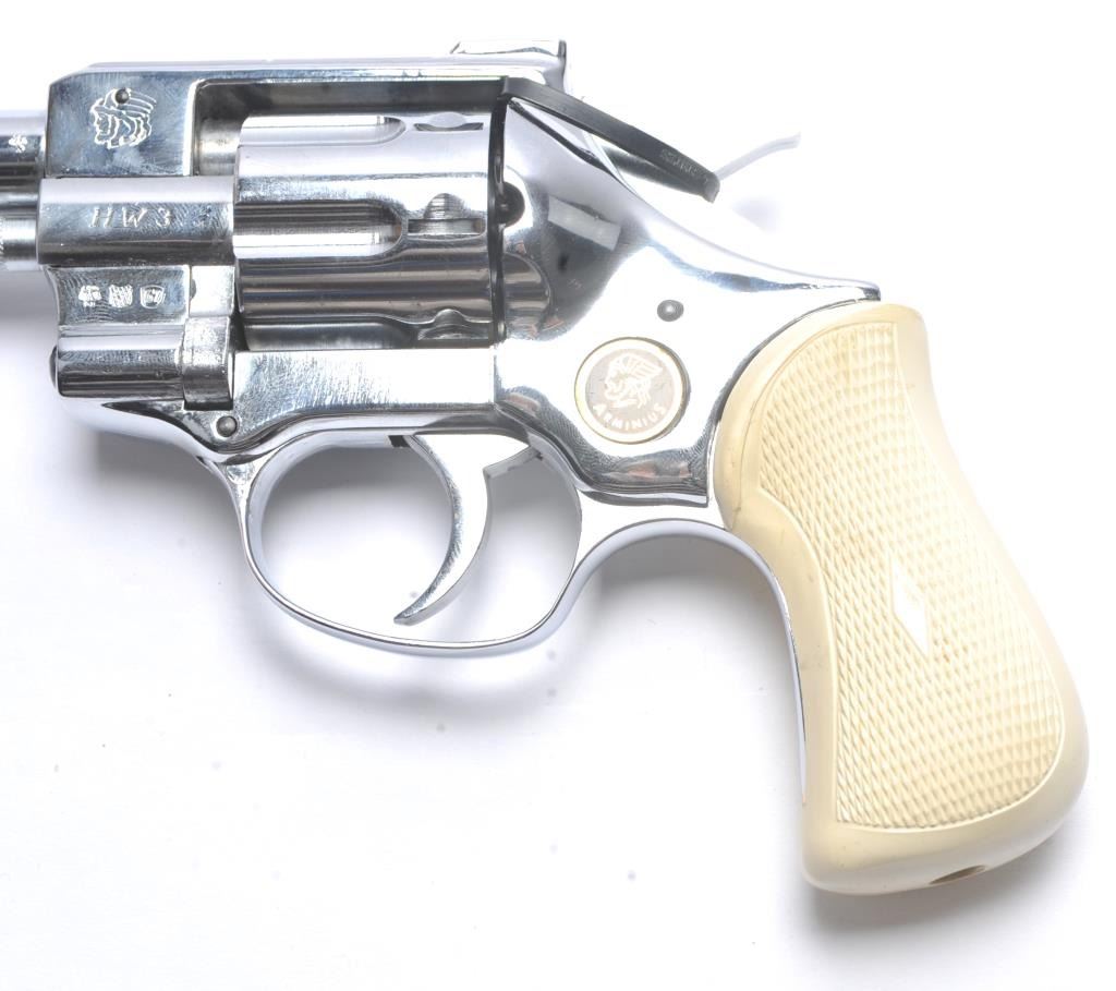 Arminius Model HW 3 DA revolver, .32 S&W Long caliber, Serial #178425. The pistol is in fine overall condition with a 2 ¾” barrel with a ramped blade front and fixed rear sights. The pistol retains nearly all of the bright nickel finish. The pistol shows numerous proofs, “MADE IN GERMANY” on the frame and no visible import marks. The checkered plastic grips are in very good condition. The bore is good and the actionis crisp. The lot includes the original factory cardboard box with matching end label. Est.: $200-$400. (C+R/PPT).
