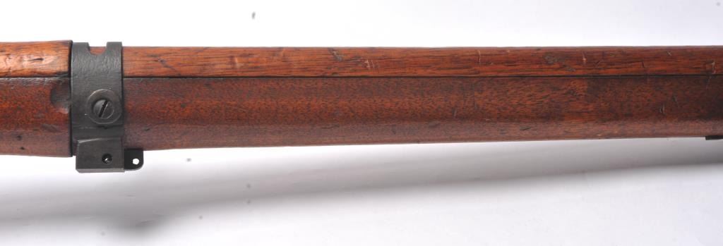 Arisaka Type 99 bolt action rifle, 7.7 caliber, Serial #12096. The rifle is in very good overall condition with a 26” barrel with the mum ground off and a crisp Tokyo Arsenal proof. The rifle has a protectedblade front and military style ladder rear sight with the airplane wings intact. The smooth wood stock shows moderate to heavy use with dents and compressions consistent with service use. The butt stock ends with asmooth steel butt plate. The bore is fair and the action is crisp on this WWII era Arisaka. Est.: $300-$600. (C+R).