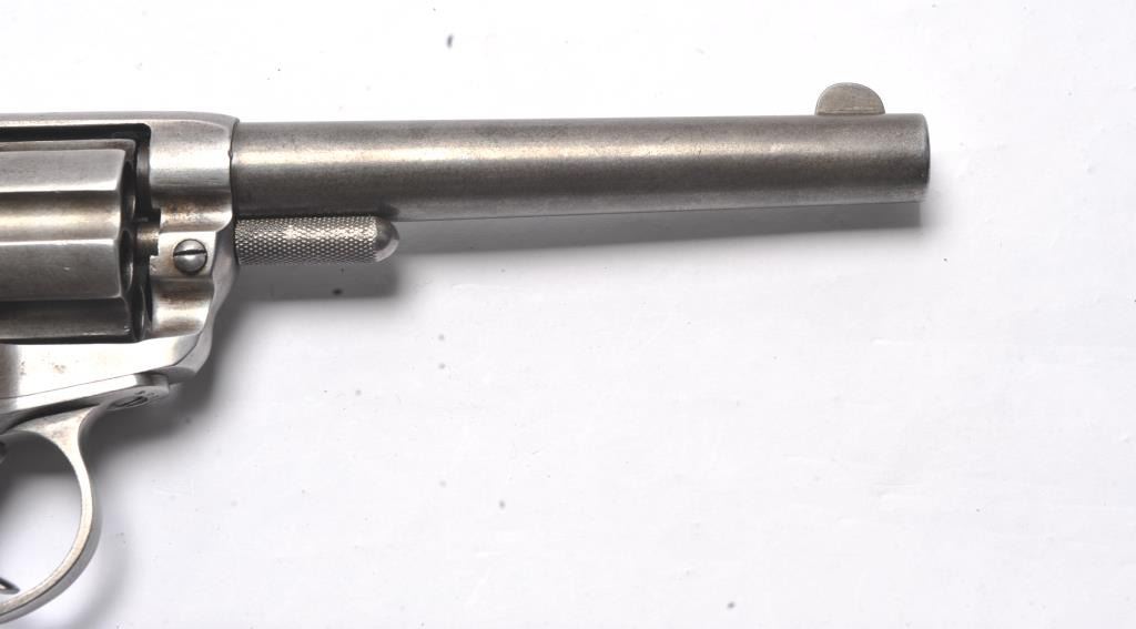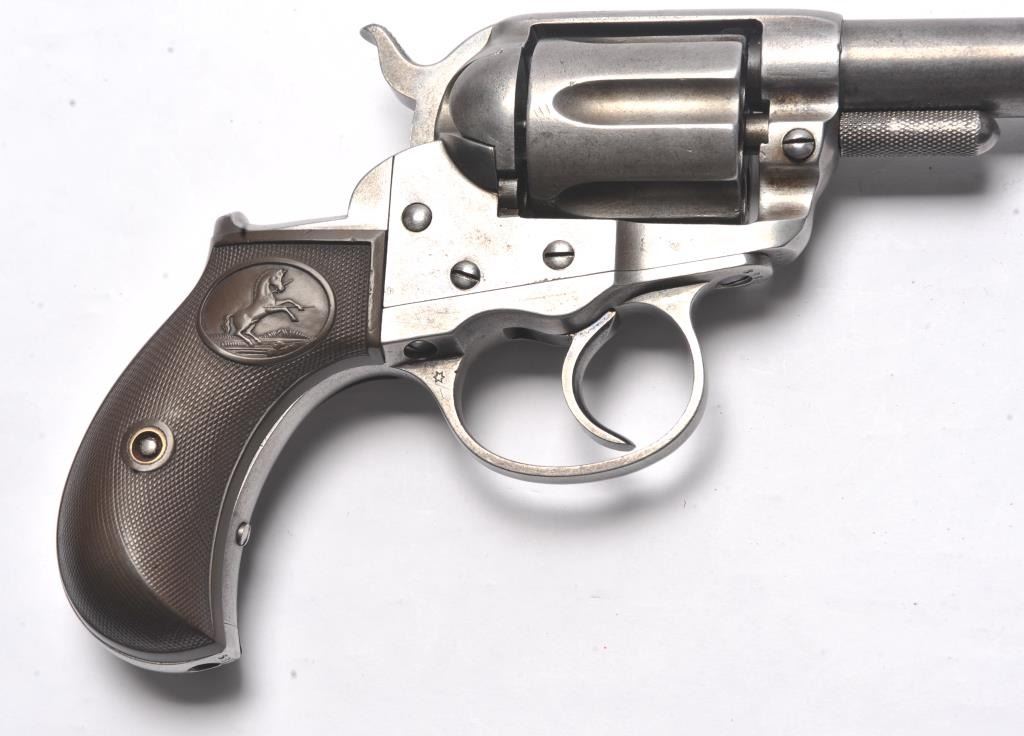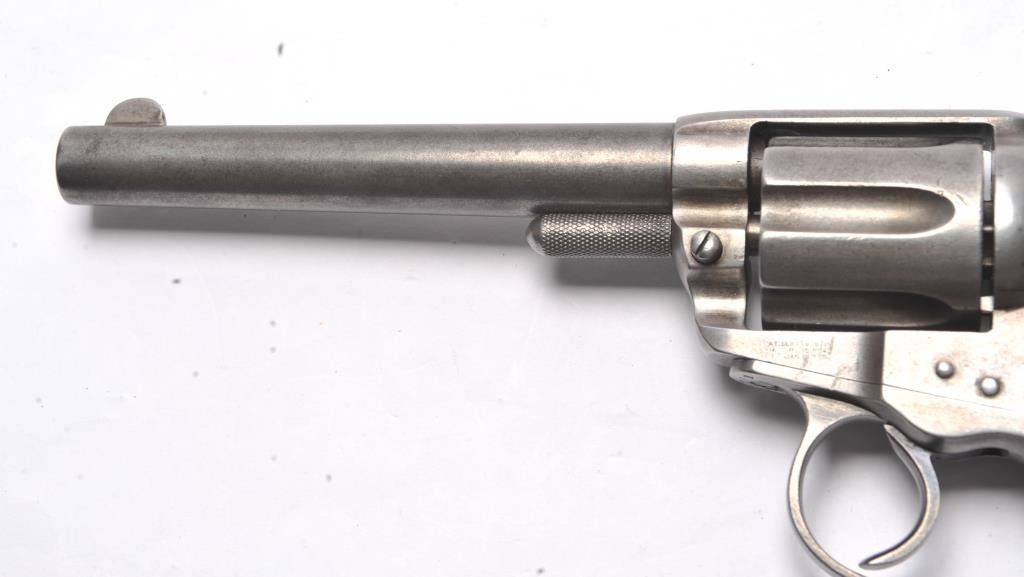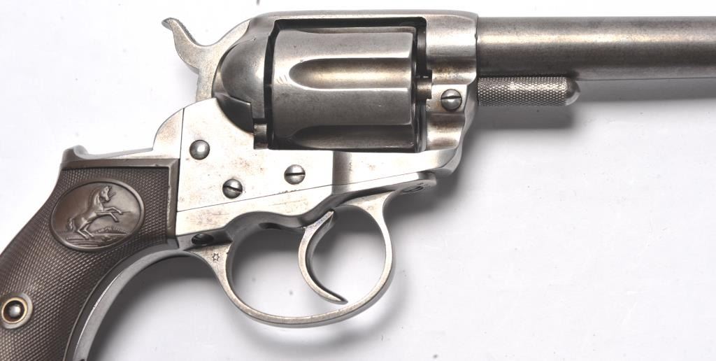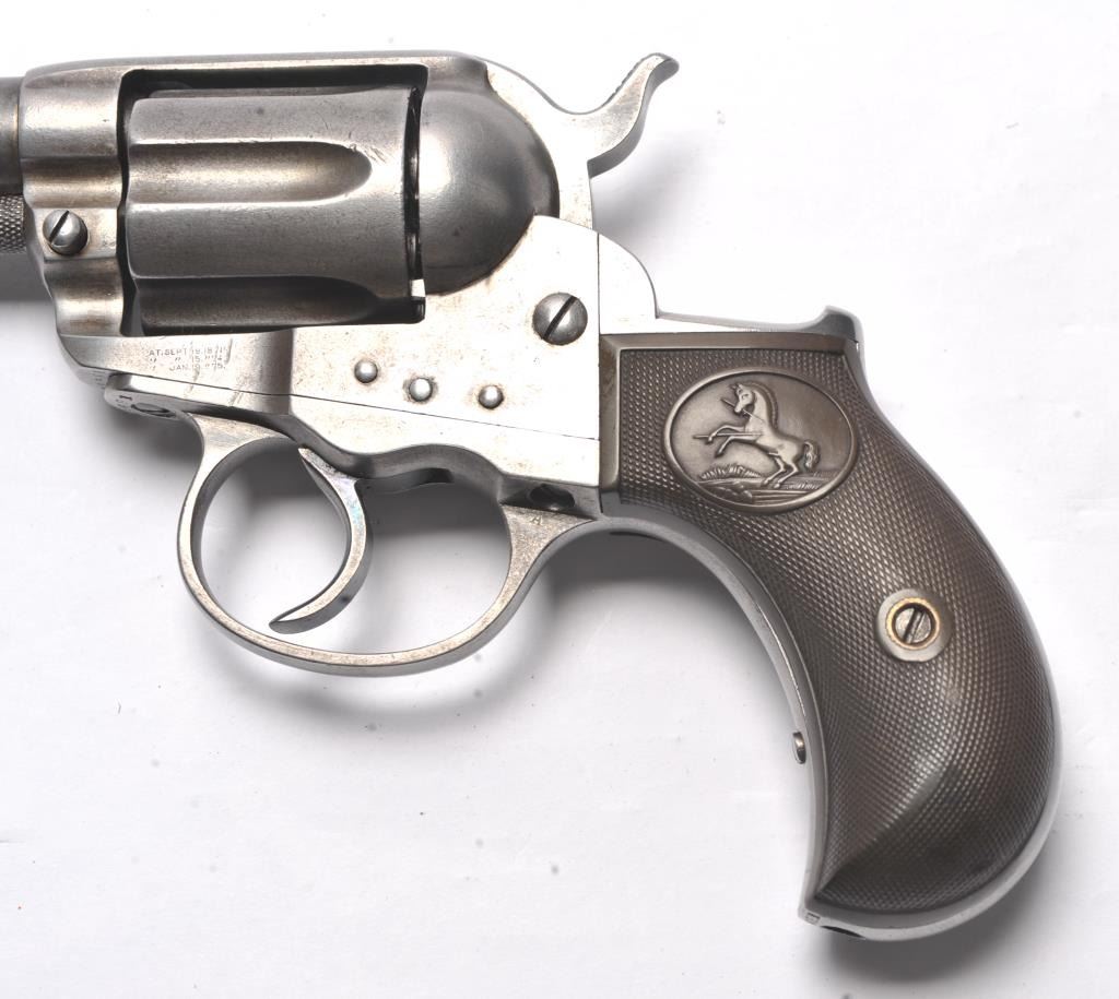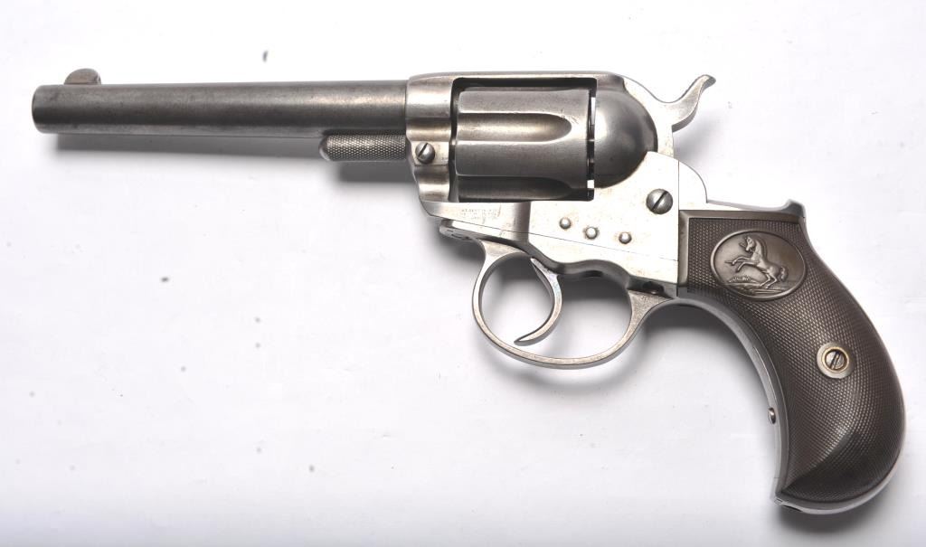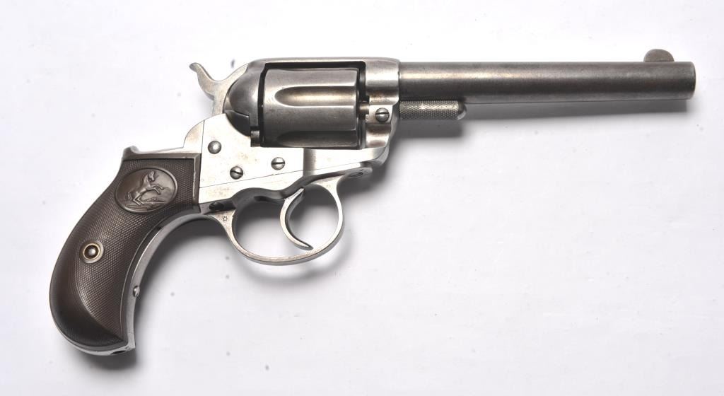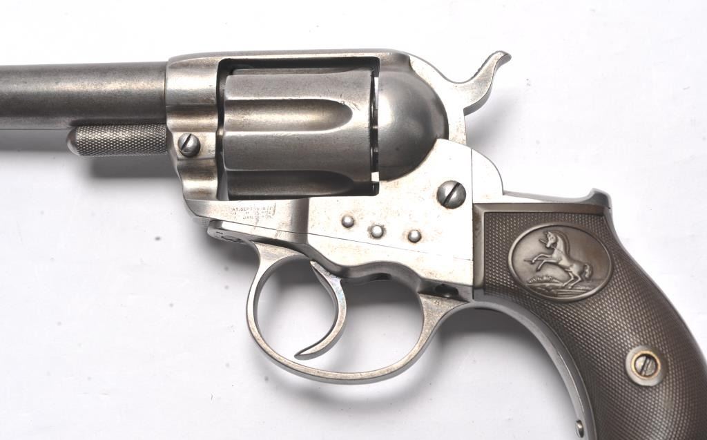 Colt Model 1877 DA Lightning revolver, .38 Colt caliber, Serial #58681. The pistol is in good overall condition with a 5” barrel and no ejector. The metal surfaces have gone to an even grey patina with a crisp barreladdress and silvered toning case hardening still evident on the frame. There is a star stamped on the right side of the trigger guard indicating return to the factory. The checkered hard rubber grips are in goodcondition and fit well. The action works however, the trigger does not return and will require repair. The bore is fair on this Model 1877, desirable with the long barrel without ejector. Est.: $600-$1,200.(Antique).