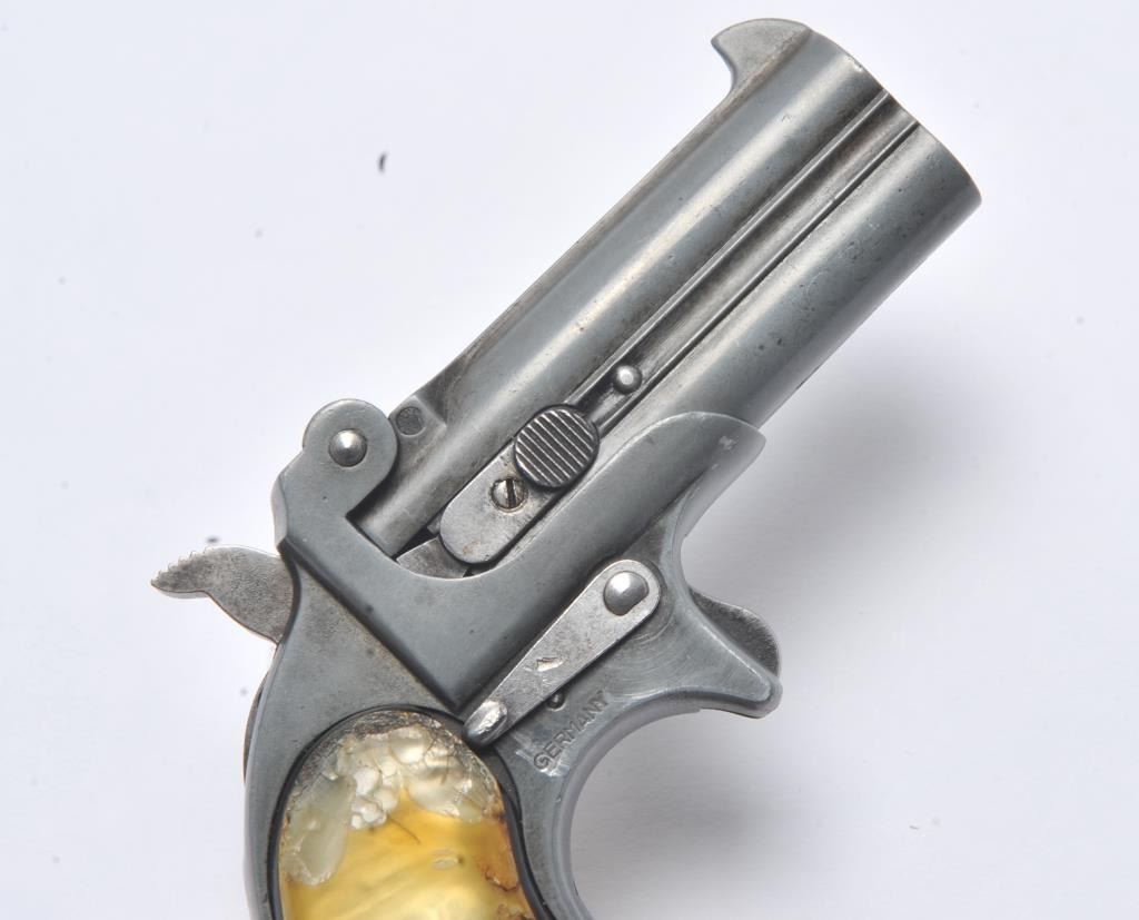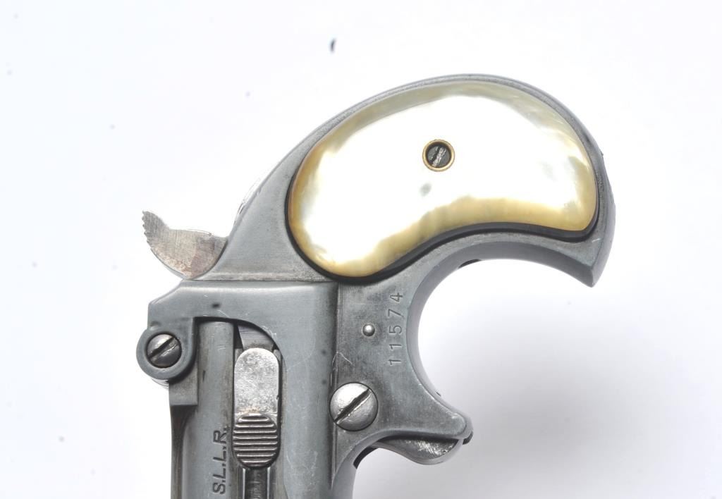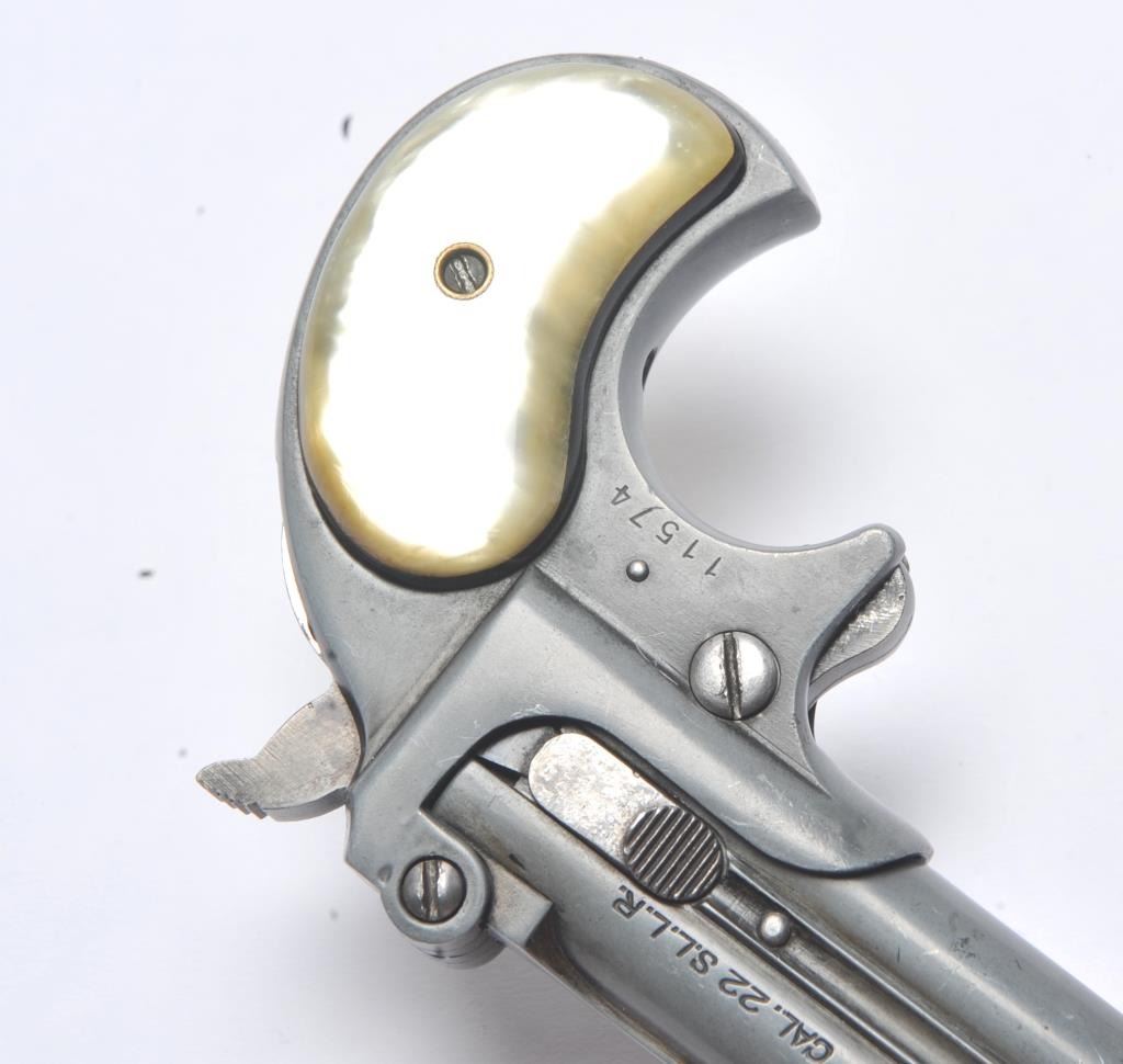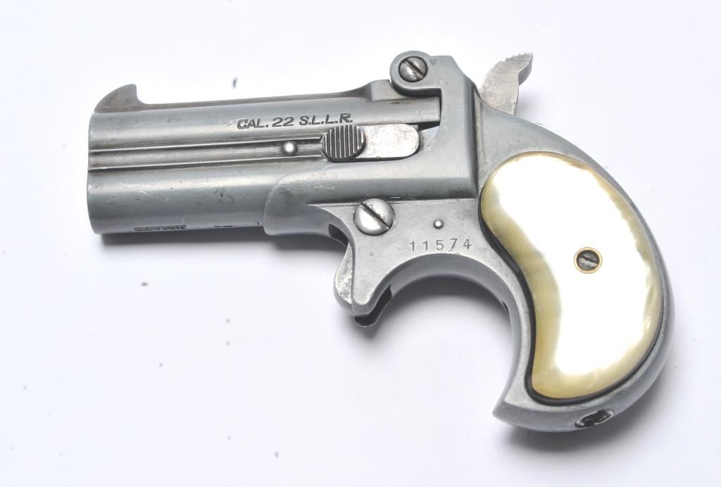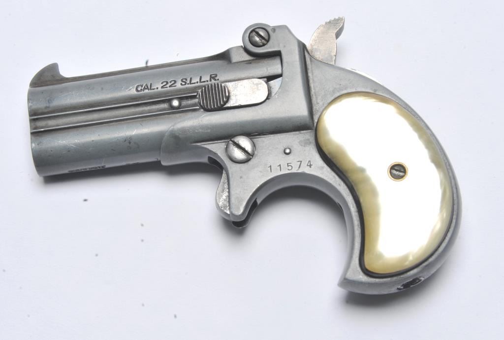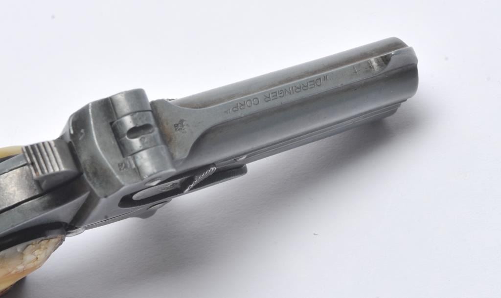 Derringer Corp double barrel O/U derringer, .22 S., L. or L.R. caliber, Serial #11574. The pistol is in good overall condition with 3” barrels. The pistol has gone to a medium grey patina. The smooth faux pearl grips are in good condition. The bores are good and the action functions. Est.: $100-$200. (Modern/PPT).