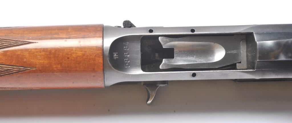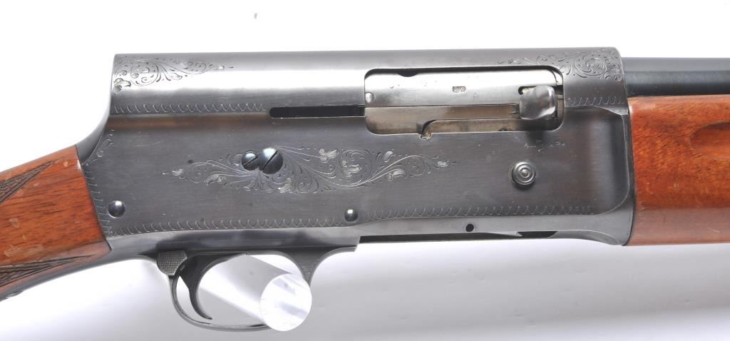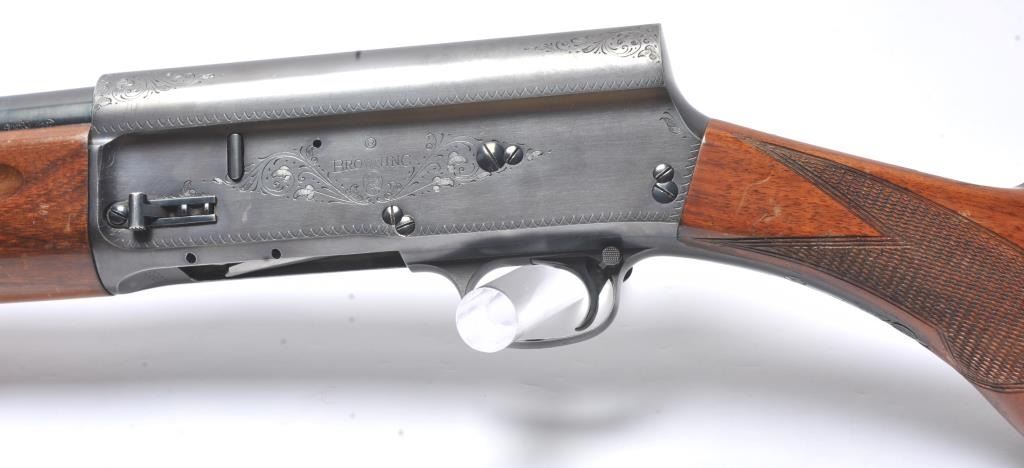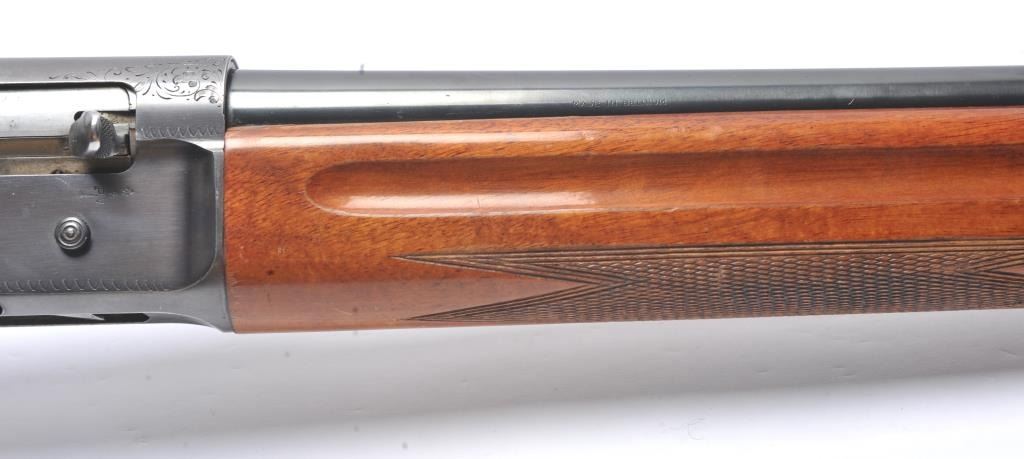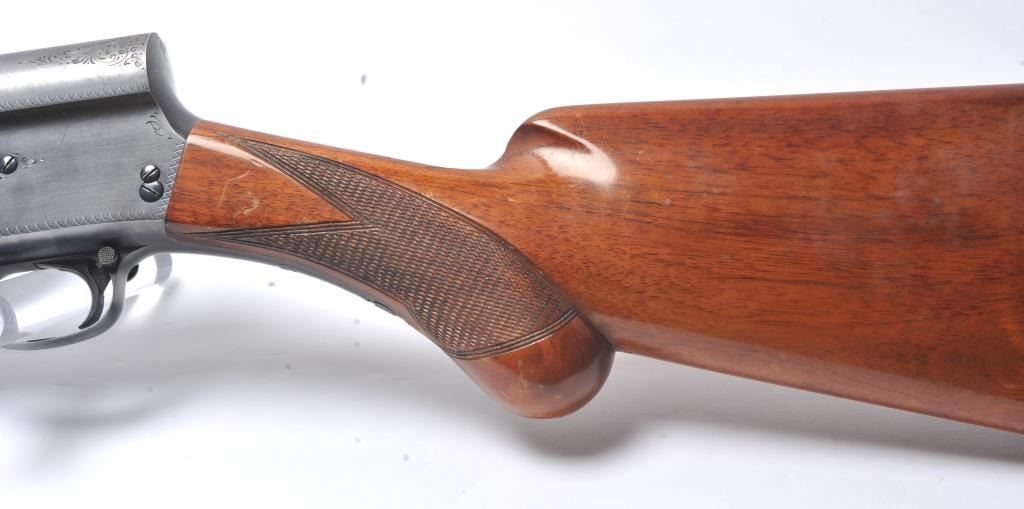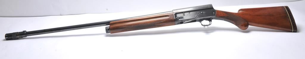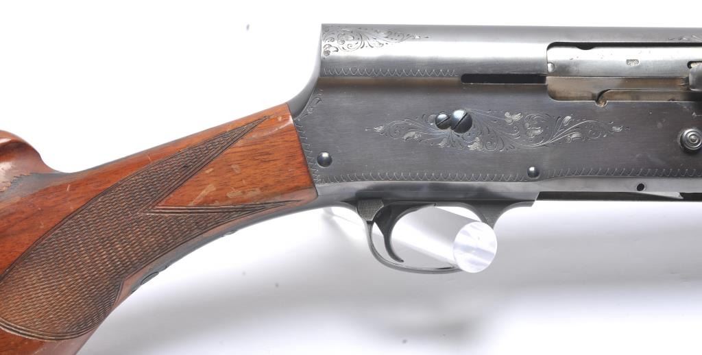 Browning Auto-5 semi-automatic shotgun, 12 gauge, Serial #58884. The shotgun is in very good overall condition with a 30” barrel including the adjustable poly-choke. The shotgun retains approximately 85-90% of themuted blue finish with light scratches and edge wear. The barrel is marked special steel and “MADE IN BELGIUM”. The checkered wood stocks are in very good condition with sharp checkering and some loss of finish.The butt stock features a round knob pistol grip and ends with a ventilated rubber recoil pad providing a 14 ½” LOP. The bore is good, the action is crisp and the markings are sharp on this desirable Belgian Browning. Est.: $400-$800. (C+R/PPT).