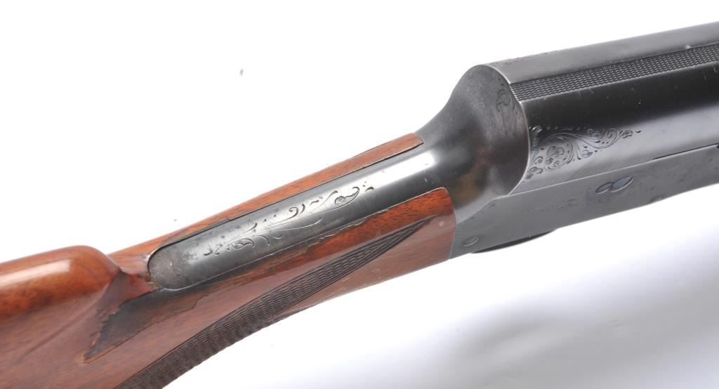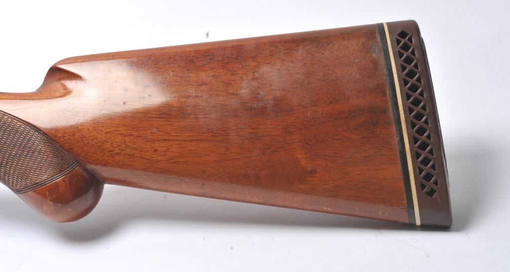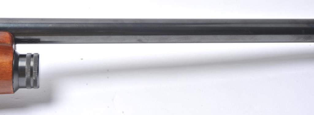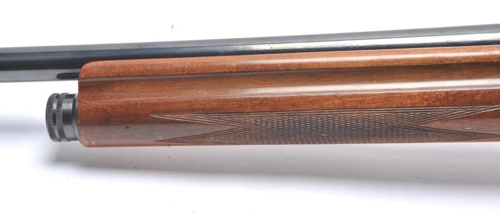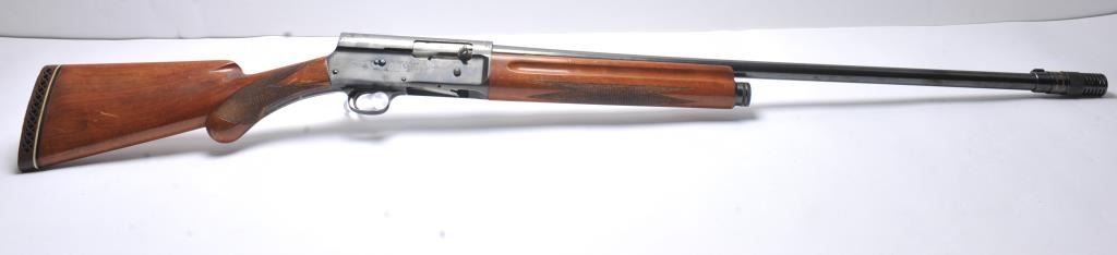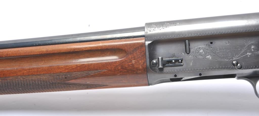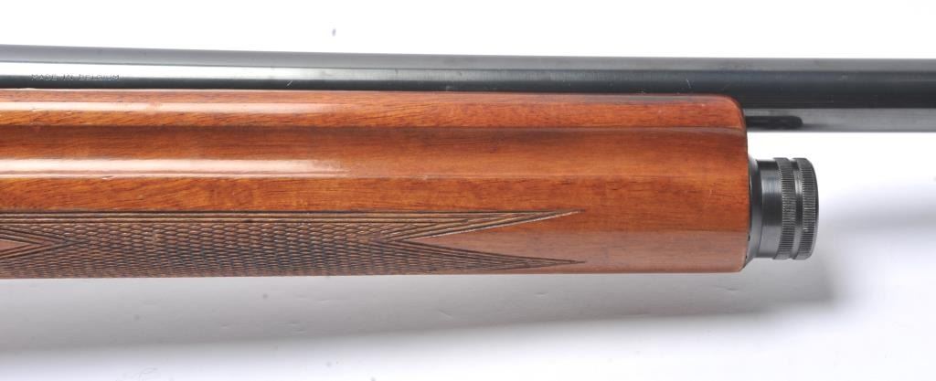 Browning Auto-5 semi-automatic shotgun, 12 gauge, Serial #58884. The shotgun is in very good overall condition with a 30” barrel including the adjustable poly-choke. The shotgun retains approximately 85-90% of themuted blue finish with light scratches and edge wear. The barrel is marked special steel and “MADE IN BELGIUM”. The checkered wood stocks are in very good condition with sharp checkering and some loss of finish.The butt stock features a round knob pistol grip and ends with a ventilated rubber recoil pad providing a 14 ½” LOP. The bore is good, the action is crisp and the markings are sharp on this desirable Belgian Browning. Est.: $400-$800. (C+R/PPT).