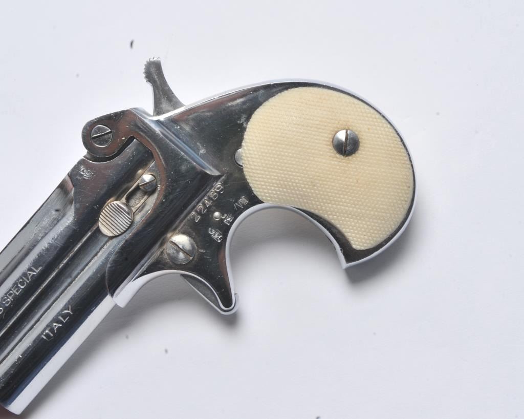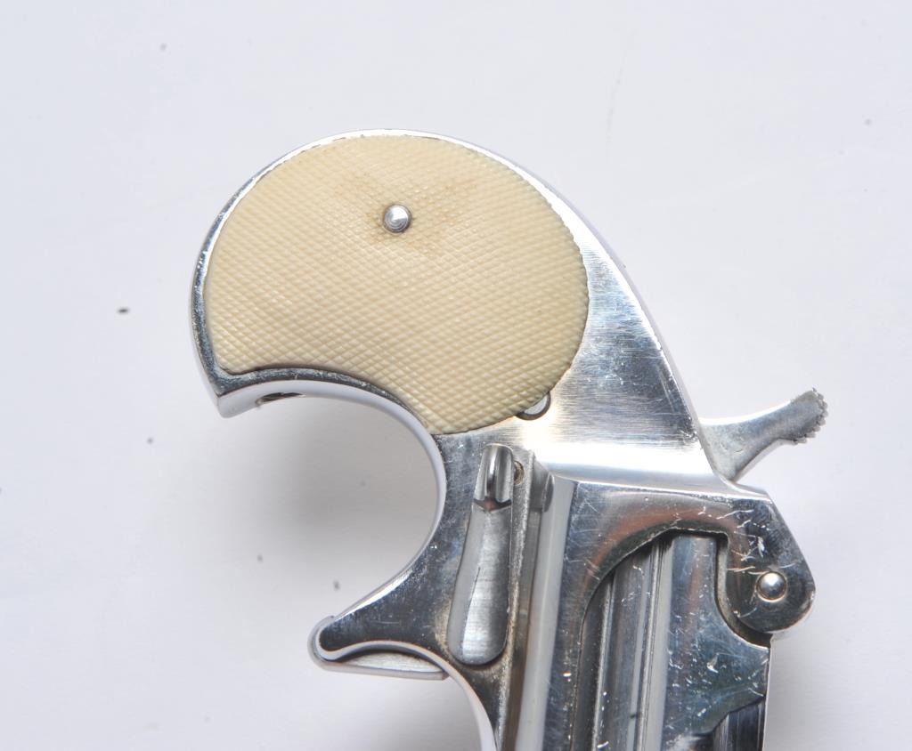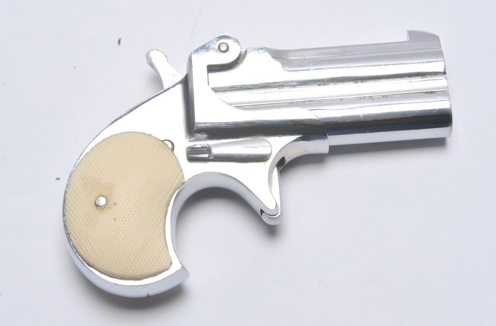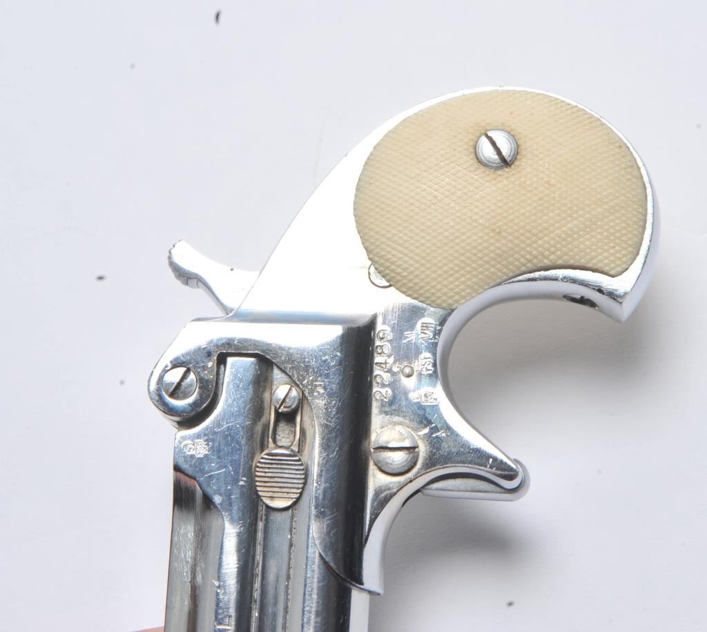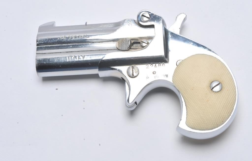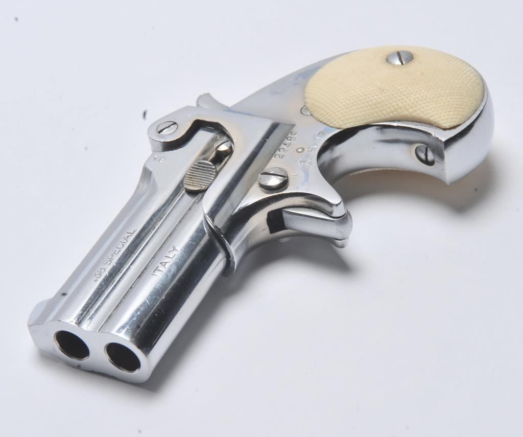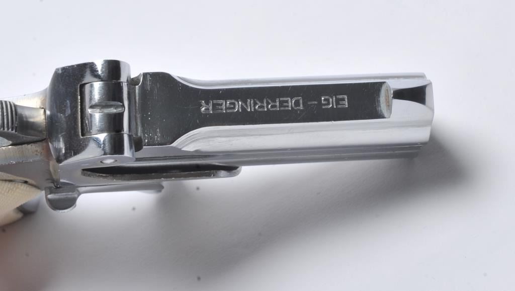 EIG double barrel O/U derringer, .38 Special caliber, Serial #22489. The pistol is in very good overall condition with 2 ¾” barrels. The pistol retains the majority of the polished nickel finish with small andscratches consistent with carry and use. The checkered plastic faux ivory grips are in good condition. The bores are good and the action functions. Est.: $100-$200. (Modern/PPT).