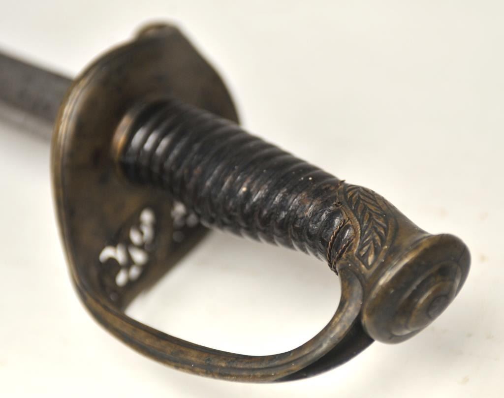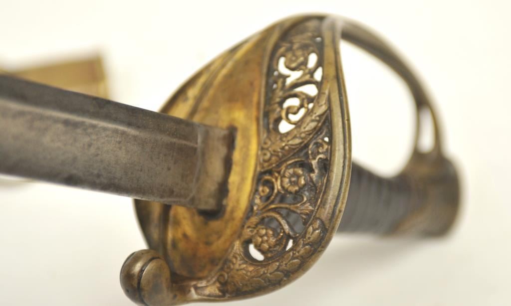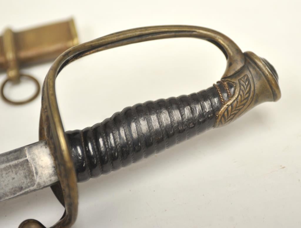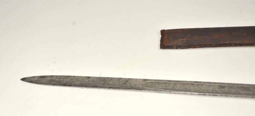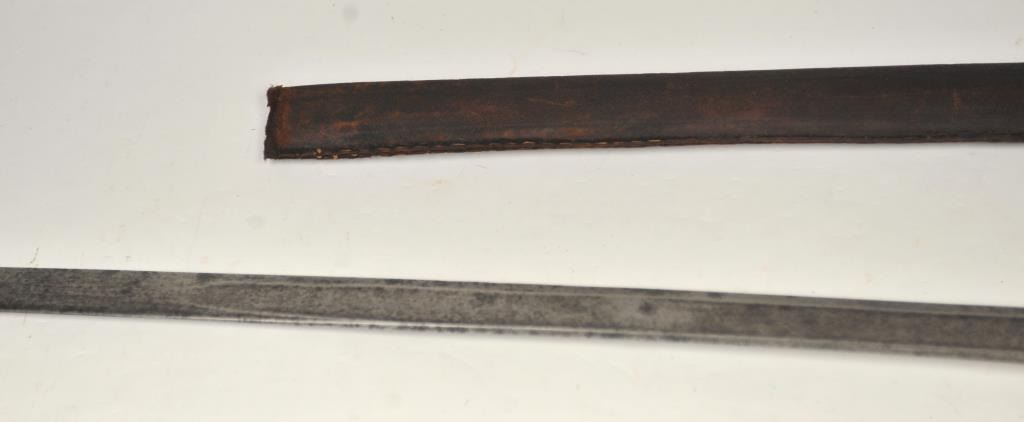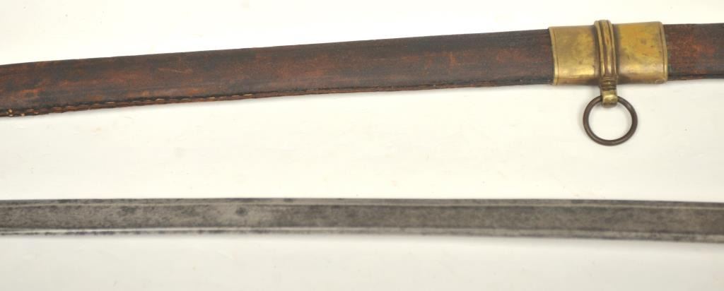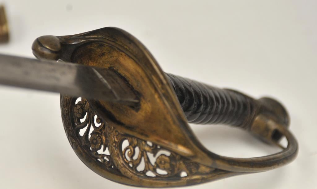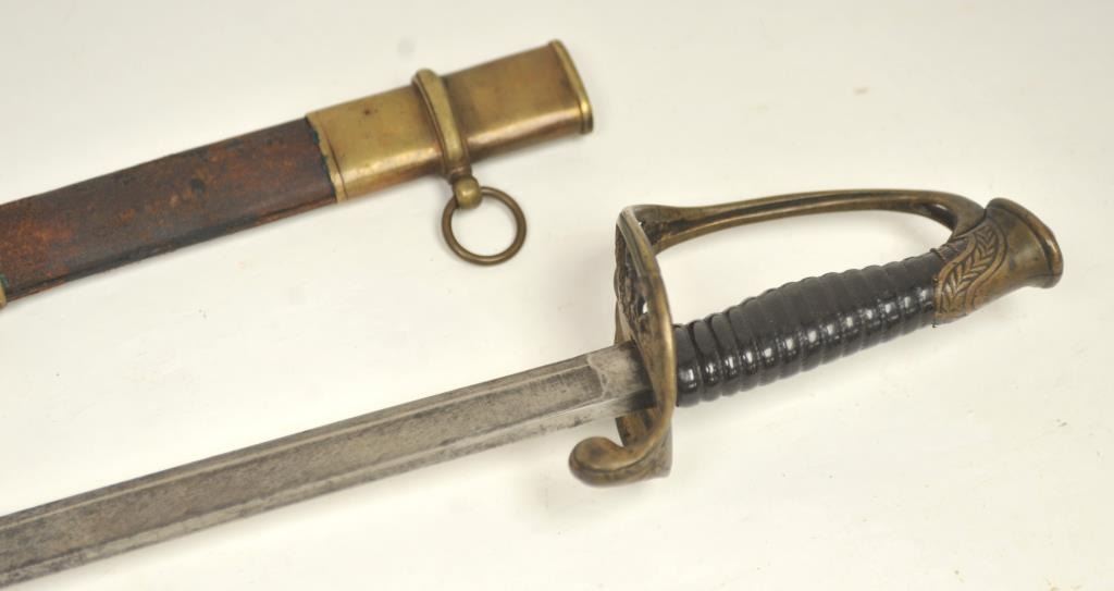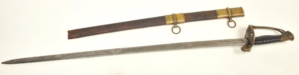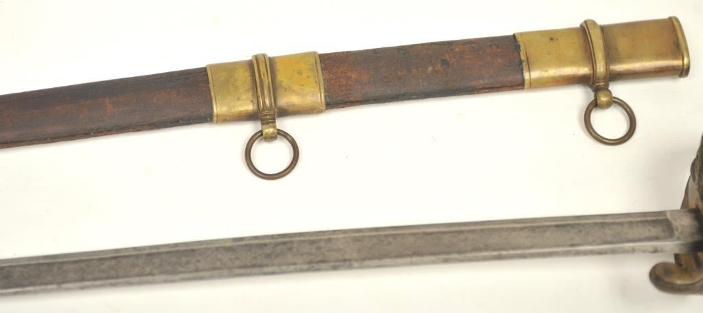 “Thomas Griswold New Orleans” marked Confederate Officer’s sword with scabbard. Measures 37” overall with a 30 ½” blade. Good condition with minor pitting and erosion on blade. The hilt shows an uncleaned patina and leather grips is good missing most of its wire wrap. The period scabbard shows two hangers with good patina and missing end plus drag. The remaining leather is re-stitched and well matched to the sword. Provenance:“Rusty” White collection 1990s. Our notes indicate he obtained from Stanley Defenthal. Est.: $7,000-$14,000