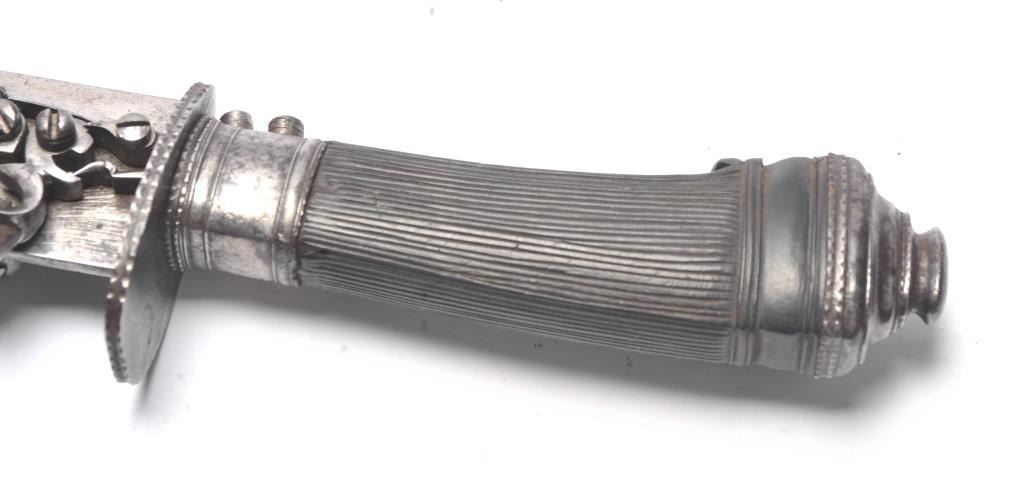 Rare double barrel flintlock knife pistol signed “Pierto Bruni” on the barrels who worked in Milan circa approximately 1796-99. The weapon measures 24” overall with 18” clipped point blade similar to bowie knife.The barrels and mechanisms mounted on each side of the blade and mechanism exposed and fired by button triggers mounted behind the hilt. Fluted ebony grip with matching decoration on the guard and butt cap. Thecondition is very good overall with all original parts and works well. The barrels measure approximately 3 ½” and are approximately .36 caliber smoothbore. A sophisticated and exceptional oddity weaponformerly in the “Dick and Taylor Bowen” collections. (Antique) Est.: $3000-$6000