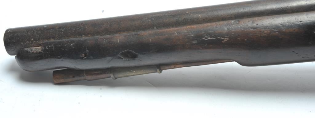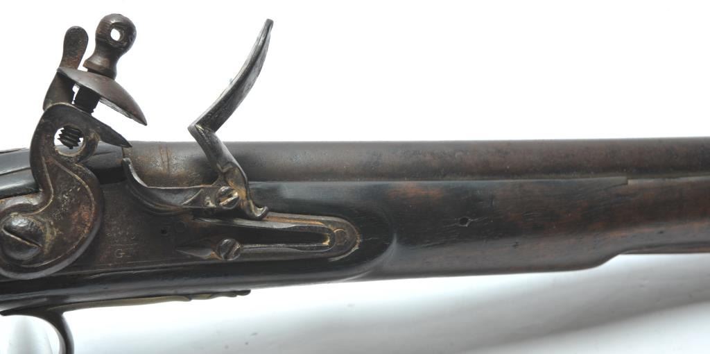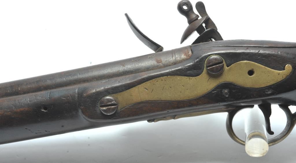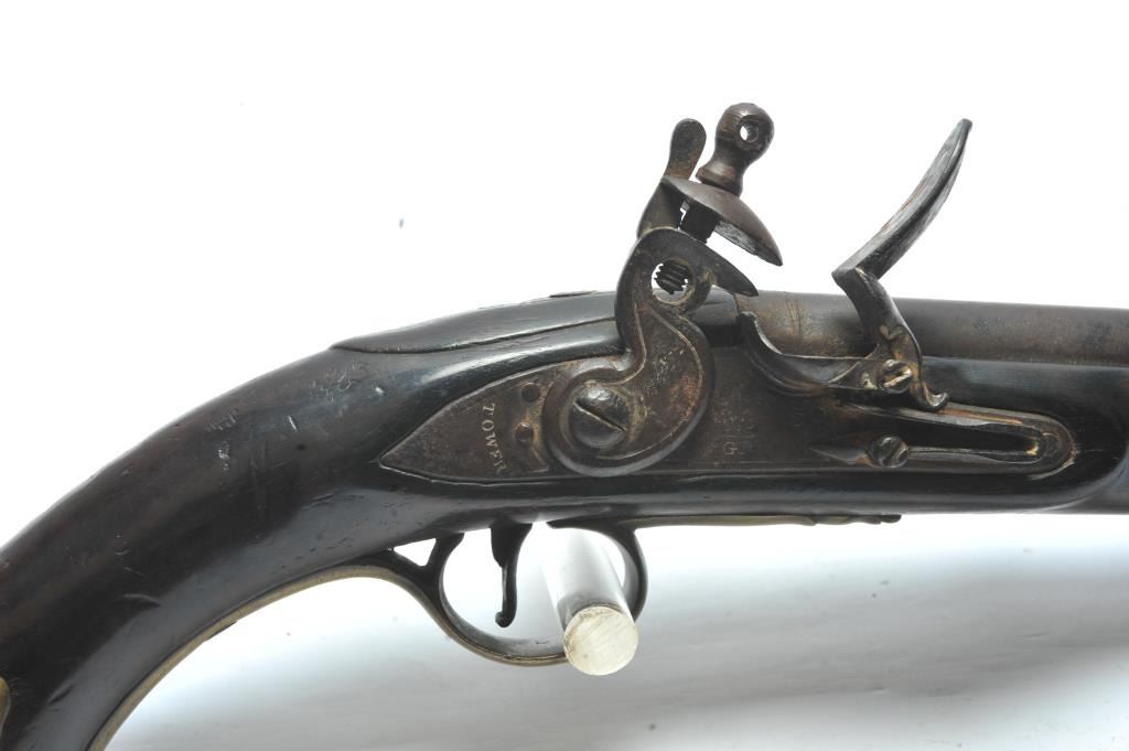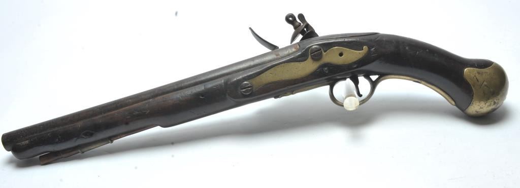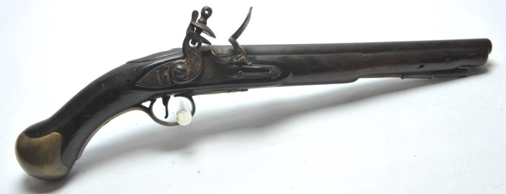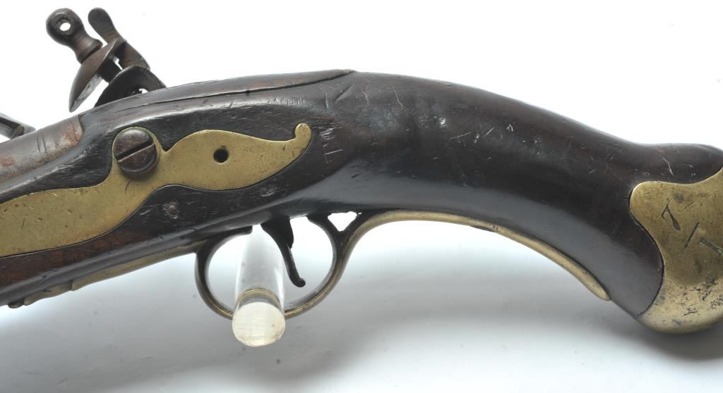 British Navy Issue Sea Service Flintlock Pistol Pattern of 1777 (U.S. Revolutionary War Era) with 12” barrel in .54 caliber smoothbore. Brass mounted with Tower marked lock showing “G R” and crown with Britishproofs. Number 7 over 1 on the left side of the butt along with many small inspections and marks in the stock with 10 behind the tang in the wood. Original flintlock parts with heavy dark brown patina showing somerust erosion consistent with age and naval use. The belt hook was purposely removed. The stock is very good with minor losses and some imperfection. The ramrod has broken and is to short but of the same period. The lockworks very well. Very possibly could have been used in naval engagements in America during Revolutionary War era where the copper bottom. British fleet had a great advantage over America and French hulled slower ships.Est.: $1750-$3500