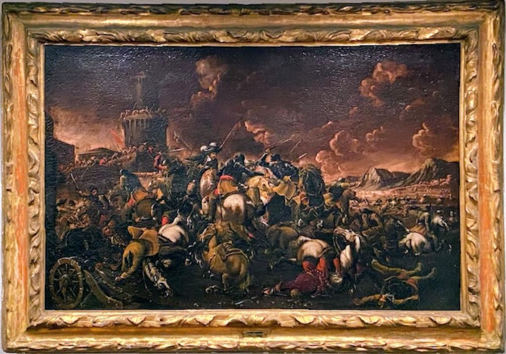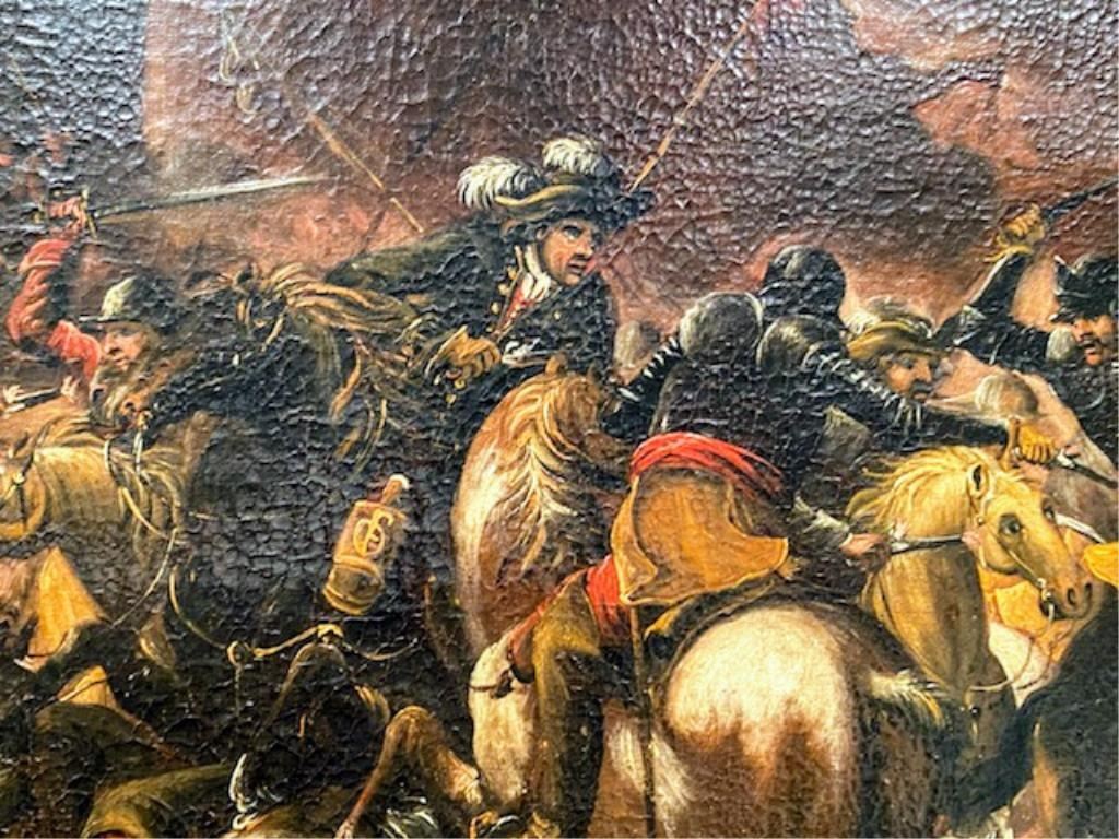 16th century style battel scene painting in oil on canvas unsigned. Measures 23” x 29” showing minor condition issues. Painted 19th to early 20th century. Est.: $900-$1800