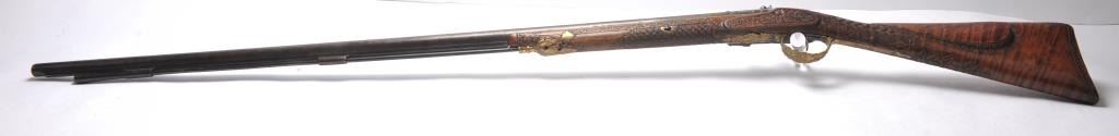 Ornate flintlock musket circa early 19th century with fancy gold inlay and elaborate and well carved Caucasian striped walnut stock showing a “Fiddleback” grain. The floral and geometric carving in the stock is unlike any other pattern we have examined in 50 years of cataloging. The quality of the carving is exceptionally good and extensive in its coverage. The trigger guard and fore end cap are en suite to the wood carving in their design and gilt brass. The butt plate is simple sheet brass and gilt to match. The barrel shows extensive rose and colored gold inlays that have a far eastern look. The lock is original flintlock with correct small parts gold inlaid in matching designs. The lock works well and a period rod is included. The barrel is approximately 40” and 55” overall in 28 GA or about .54 caliber smoothbore with sight on breech end. The metal condition is very good plus with minor normal aging. The stock is also very good plus with crisp carving showing one loss of wood at top of the edge of the stock 2”-3” forward and 1/16 to ¼” which is not immediately apparent. An impressive and well decorated arm made from the area of Turkey to the Far East as it has strong Asian influence in design motifs. (Antique) Est.: $1250-$2500