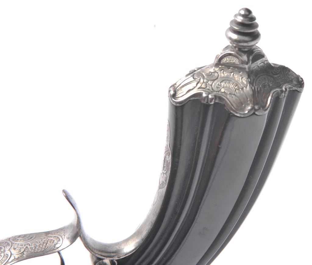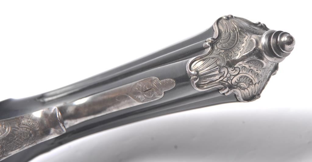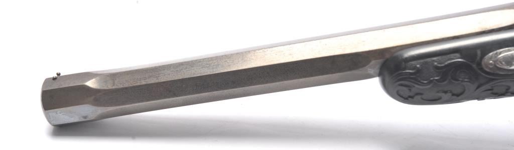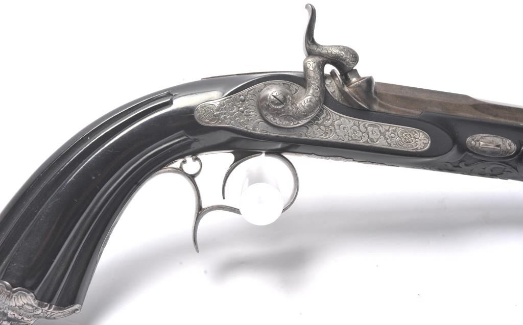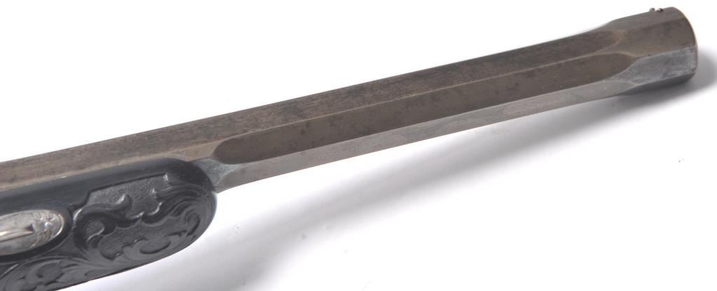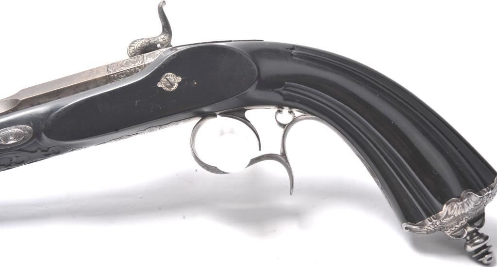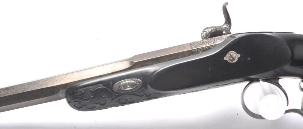 Fancy French style dueling pistol signed “Fque De Le Page Fres, A Liege Mion A Paris Rue D’ Enghien” in etched letters at the rear of breech. Richly stocked in ebony showing floral engraved mounts, fluted barrels andfancy carving and fluting in half stock design. Measures 16 ½” overall with a 10 ½” barrel of .50 caliber rifled. Good action and good to very good condition overall. (Antique) Est.: $800-$1600