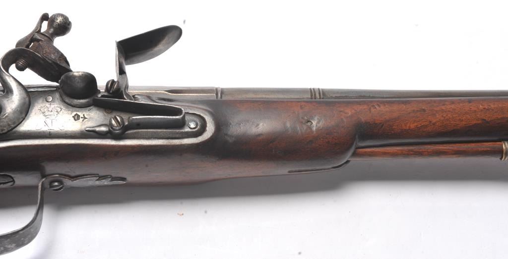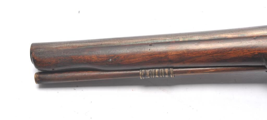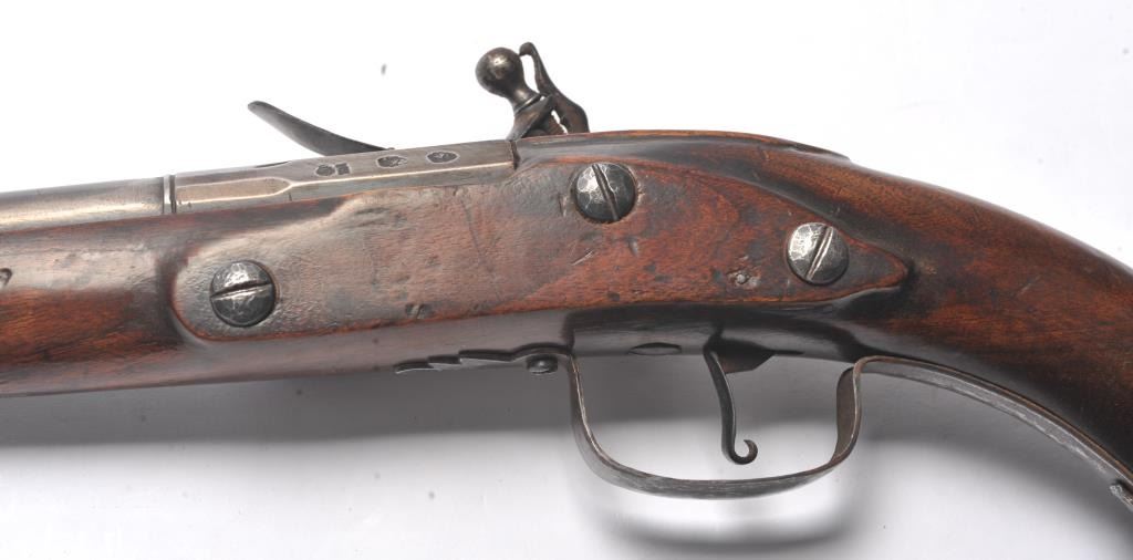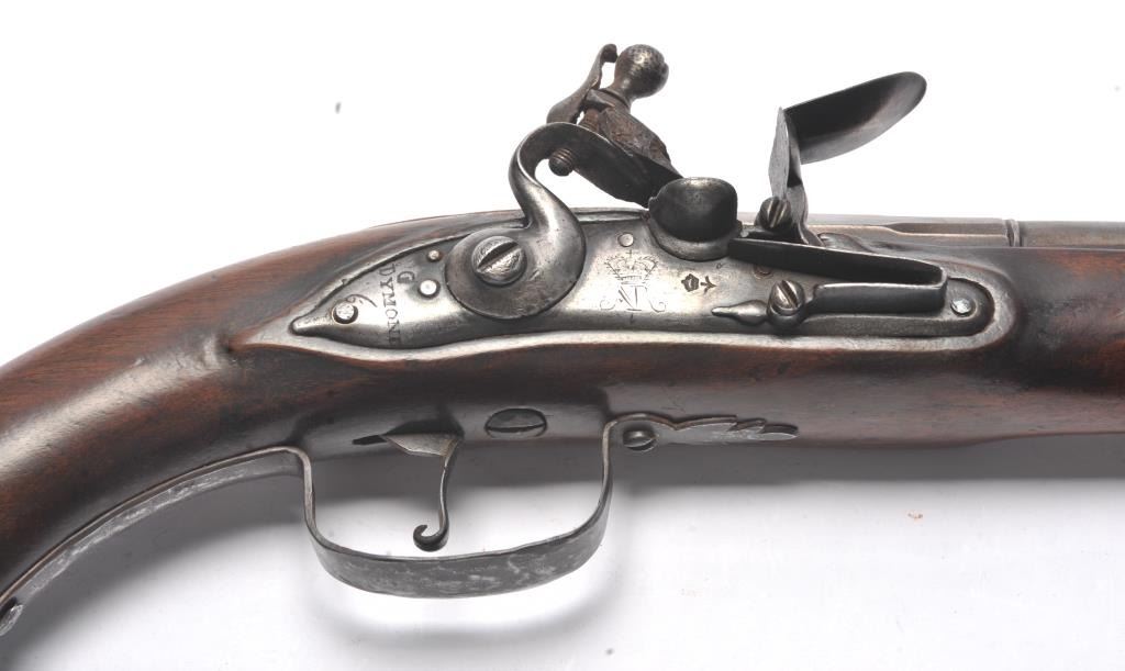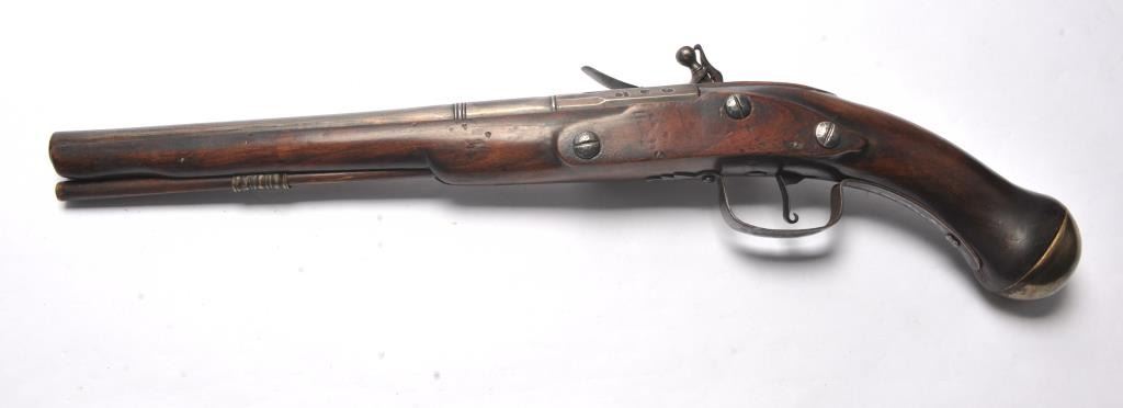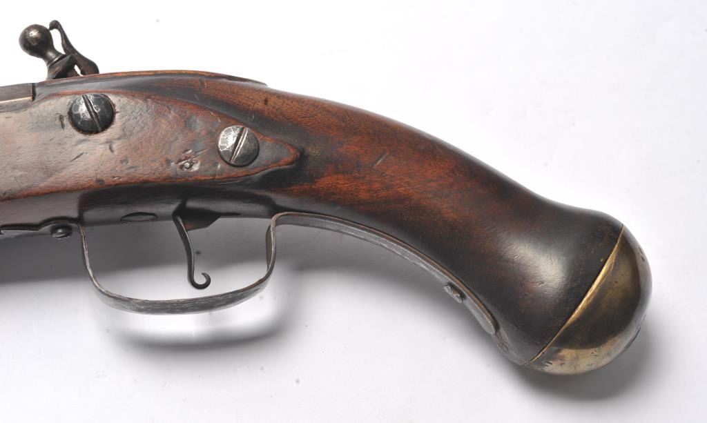 Early British Flintlock Military Pistol from Queen Anne era (Circa 1702-1714) showing “A R” and crown at the center of the lock with proofs on the barrel and below pan and signed “Dymon” on the rear of the lock plate. Shows very early flintlock feature of unbridled pan, banana shaped lock, 3 screws in the lock with no side plate or escutcheons along with steel trigger guard with brass butt cap and 1 ramrod Ferrell (No rear Ferrell in foreend). Screw in front of the trigger to a fix barrel into the stock. Measures 20” overall with a 11 ½” barrel of approximately .54-.56 smoothbore caliber. Very good metal surfaces with correct lock parts of original flintlock era. The stock is also very good with light cleaning and minor imperfections. Rare and a desirable early English flintlock military pistol. Correct style ramrod. (Antique) Est.: $3500-$7000