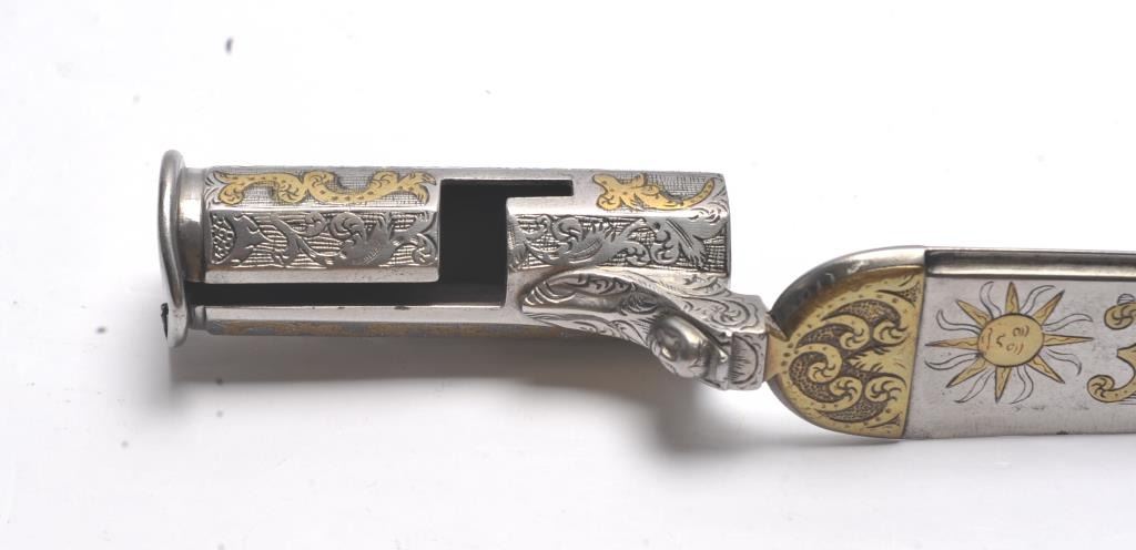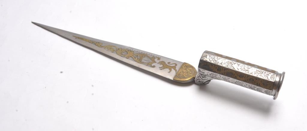 Stunning Bayonet for 17th to 18th century musket with ornate engraving, chiseled face and brass inlays of lion and scrolls. Measures 13 1/8” overall with a 9 ¾” blade and 3 ¼” socket for approximately 12 boremusket. Also inlay of sun and scrolls. Either Spain or Italy in our opinion as to location of manufacture. The condition is near fine. Provenance Bob Mandell who thought it was best of its type. Est.: $700-$1400