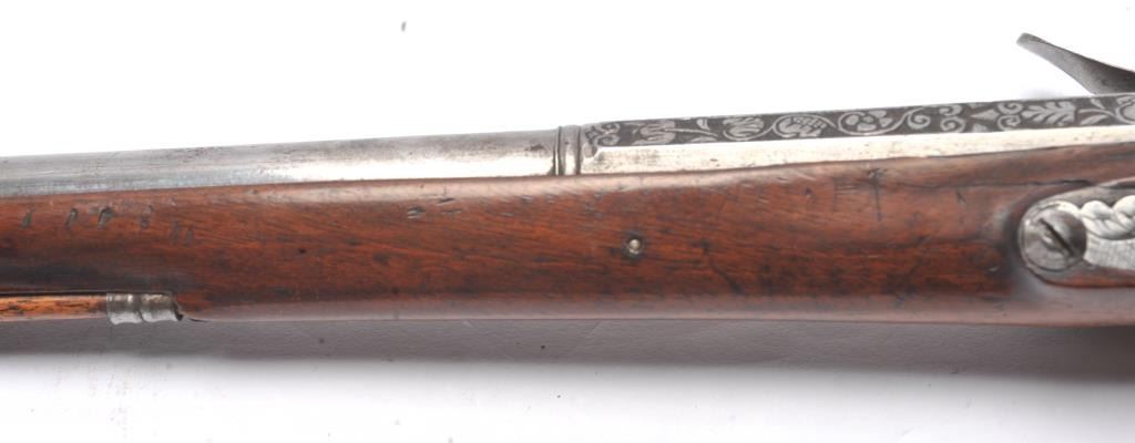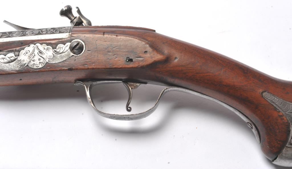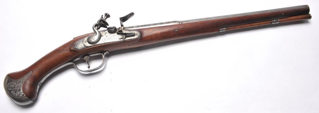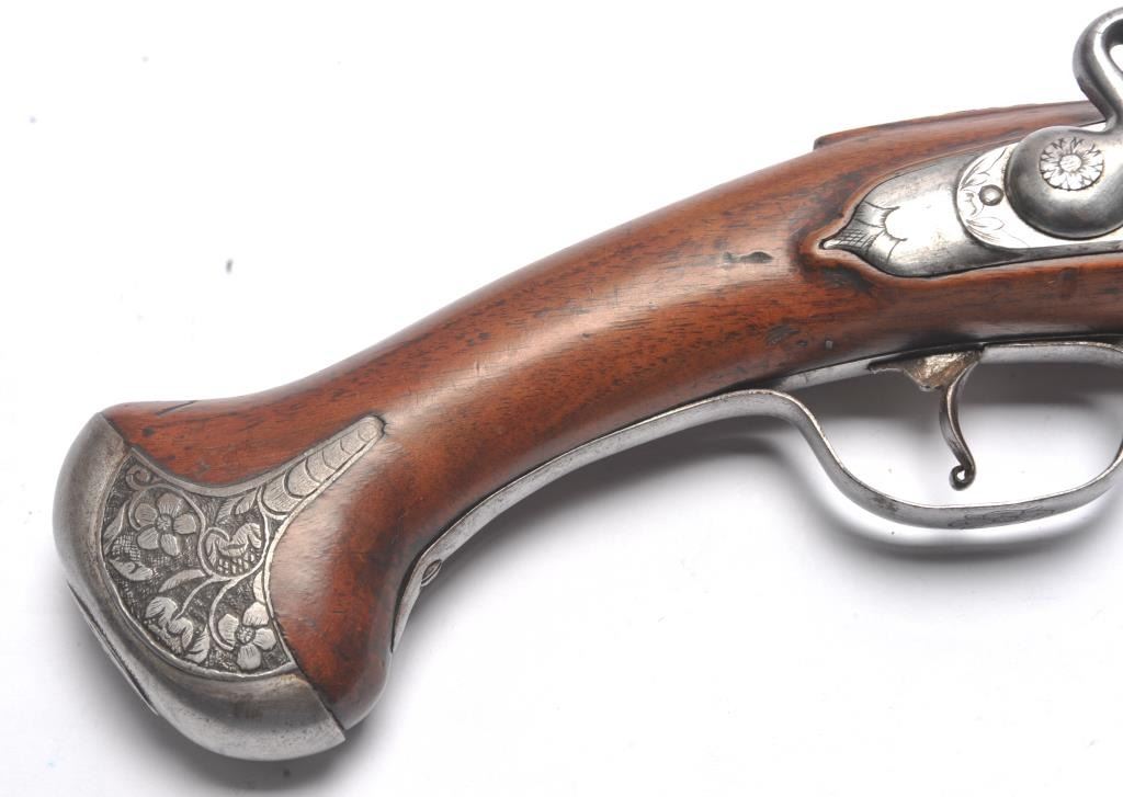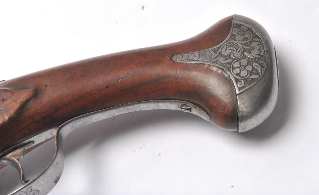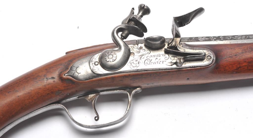Early Flintlock Holster Horseman’s size pistol signed “Leonard Cleuter” (Mastricht Holland) circa about 1660-1690. Measures 22” overall with a 15 3/8” barrel of approximately .52 caliber smoothbore. Floralchiseling on the lock and barrel with engraving style to match on the lock. Plain original stock with serpents and face engraved on side plate. Original flintlock configuration with all correct small parts.Correct style ramrod that’s possibly original to the period. Near fine condition with some minor aging but exceptional for its age. (Antique) Est.: $3000-$6000