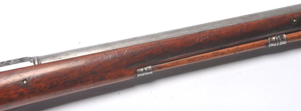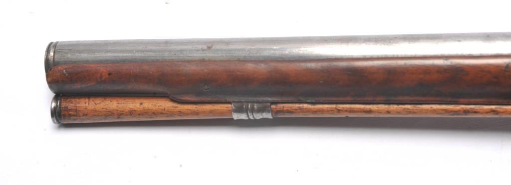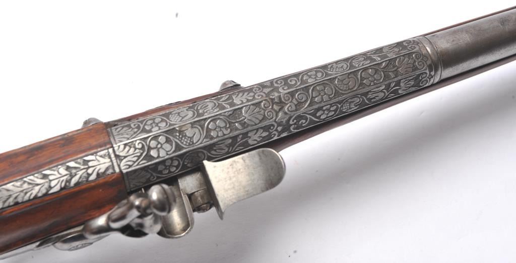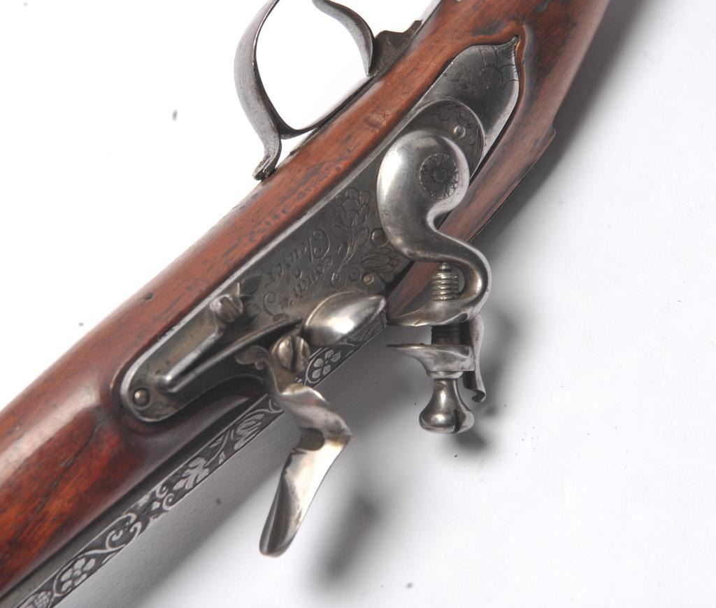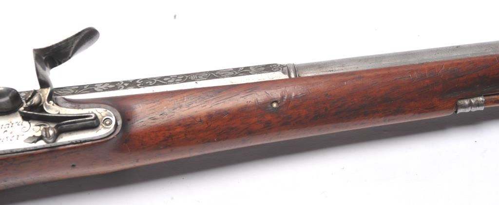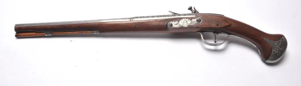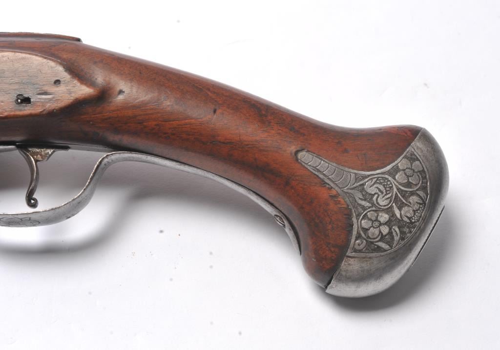 Early Flintlock Holster Horseman’s size pistol signed “Leonard Cleuter” (Mastricht Holland) circa about 1660-1690. Measures 22” overall with a 15 3/8” barrel of approximately .52 caliber smoothbore. Floralchiseling on the lock and barrel with engraving style to match on the lock. Plain original stock with serpents and face engraved on side plate. Original flintlock configuration with all correct small parts.Correct style ramrod that’s possibly original to the period. Near fine condition with some minor aging but exceptional for its age. (Antique) Est.: $3000-$6000