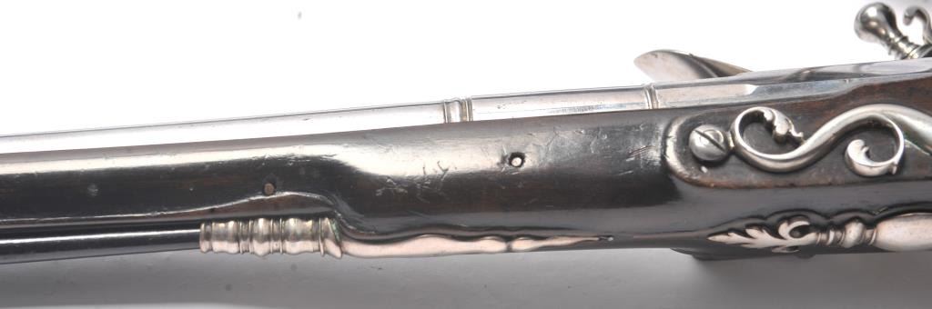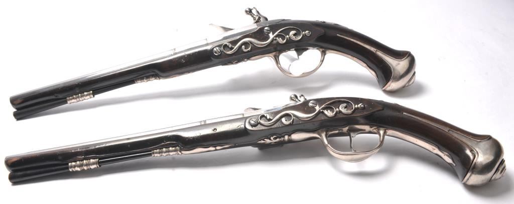 Pair of early silver mounted flintlock Horseman’s pistols about 1720-1750. Measures 19 ¾” overall with 11 3/8” barrels of approximately .52 caliber smoothbore. The styling is continental probably French toSouthern Germany. The pair are in very good condition showing a European museum type cleaning with good crisp edges on the barrel and stocks are also lightly refreshed. Correct style ramrods. Pair of Horseman’stype pistols that are fully silver mounted are scarce to rare. (Antique) Est.: $3000-$6000
