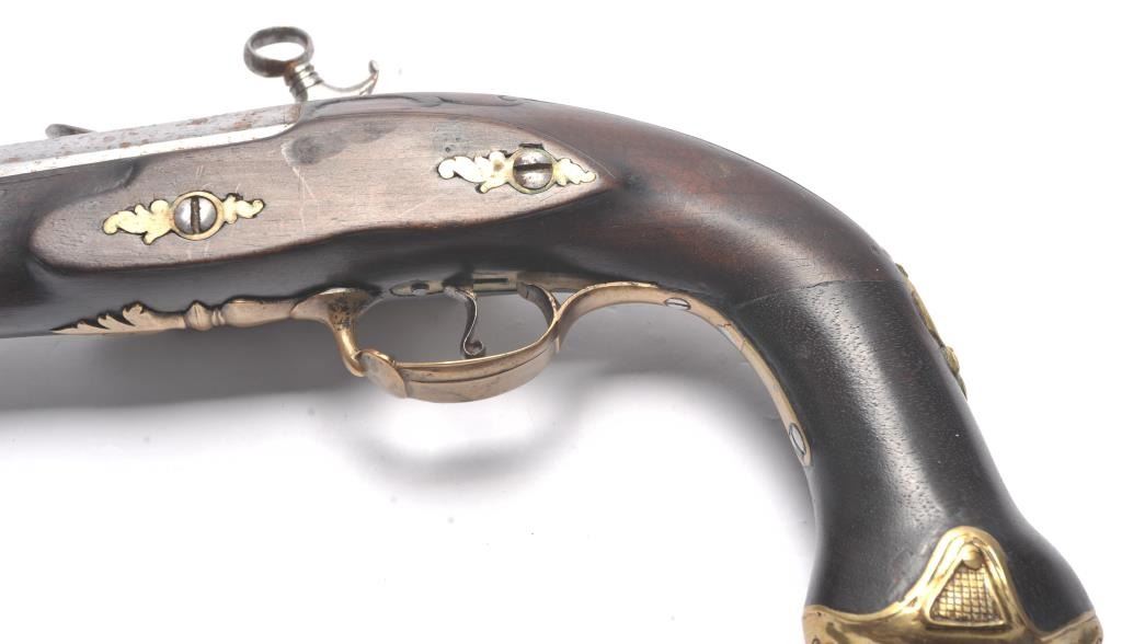 Miquelet Flintlock Pistol with brass mounts and lion head butt cap probably a guard unit circa early 19th century. The barrel shows a maker’s cartouche depicting a horse with beast head and serpent. The stock shows anold break and restoration to the wood at wrist. There is some fresh rust and erosion. The action operates well and in need of T.L.C., cleaning and minor conservation. No ramrod. Measures 13” overall with a 7 1/8”barrel of .62 caliber smoothbore. Origin Spain or Italy in our opinion. (Antique) Est.: $600-$1200
