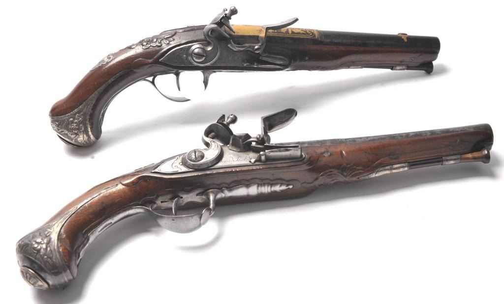Pair of French silver mounted flintlock pistols signed “Jean Seuts” on the locks circa approximately 1760-1790 probably St. Etienne. Measures 13 ¼” overall with 7 ½” barrels of approximately .62 calibersmoothbore. The barrels show most of their original blue and gold Damascus decorated barrels. The stocks are raised carved in florals at the wrist and fore ends. The silver mounts show a small rooster touch mark and good definition and very little wear. Original flintlock parts and actions work well. Original to the period horn tipped ramrods. Very good condition overall with some minor erosion and pitting on the barrels and some imperfections along with normal age and wear to the stocks. (Antique) Est.: $2500-$5000
