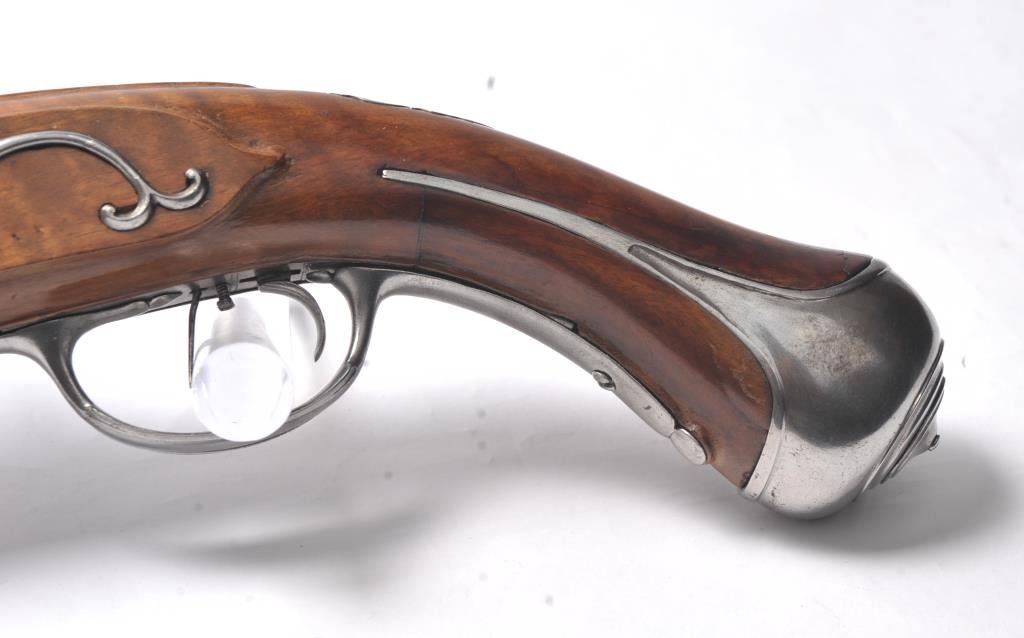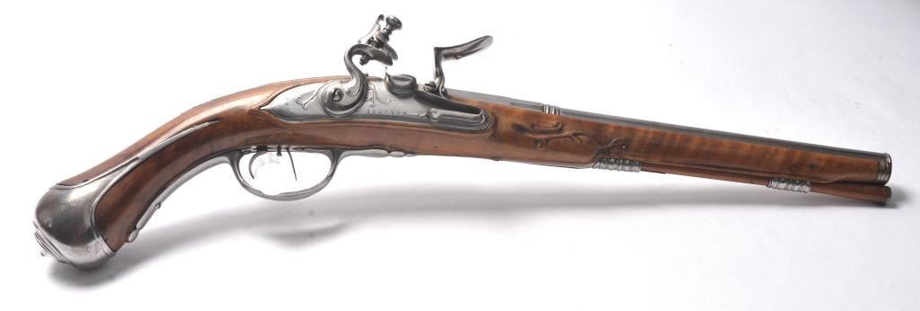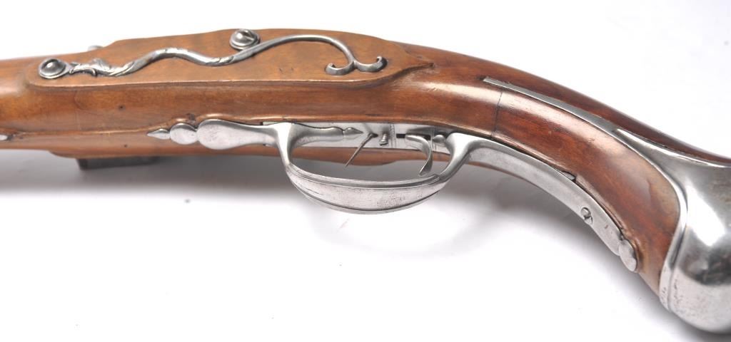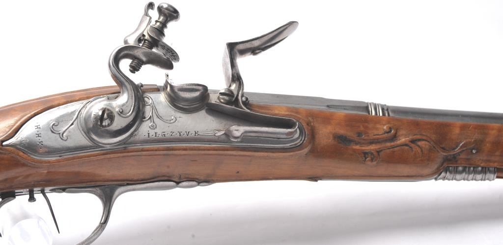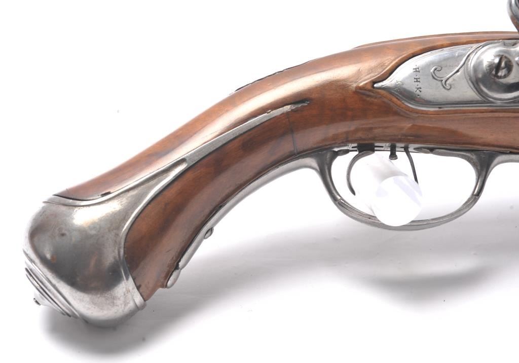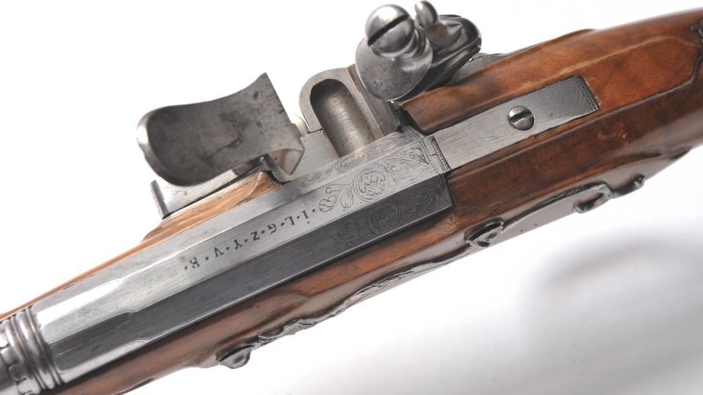 Unusual flintlock pistol signed in cypher with double set triggers and steel mounts. Measures 20 ¼” overall with a 12 ¼” barrel of approximately .62 caliber smoothbore. The lock is marked “I.L.G.Z.Y.V.B.” at the center and “H.H.K.” at the rear. The breech is marked “I.L.G.Z.Y.V.E.” in block letters hand engraved. Early serpentine side plate with long straps and elongated rear escutcheon. It is my opinion that this pistol and its mate(See Lot #184 this auction) were made in the 17th century and restocked approximately 100 years later during use. The stock is a light colored maple or fruitwood and is raised carved with minor cracks and refinishing.Original flintlock parts with minor cleaning but very good metal. The action functions and triggers work and set. We are selling each pistol as a separate lot and no buyer’s option. (Antique) Est.: $1250-$2500