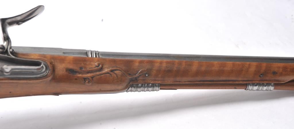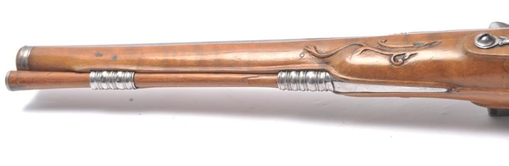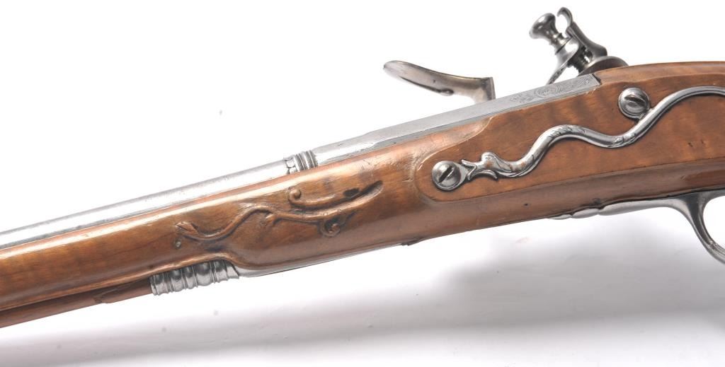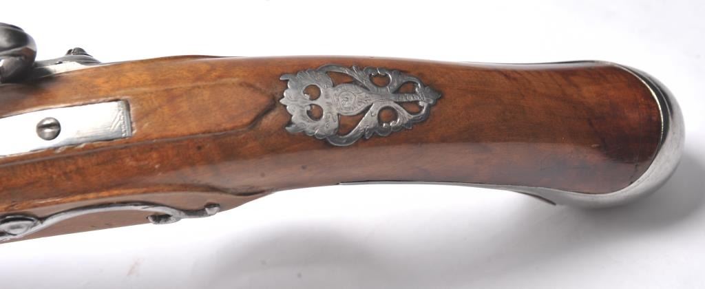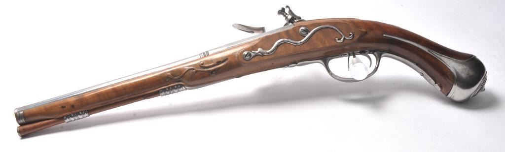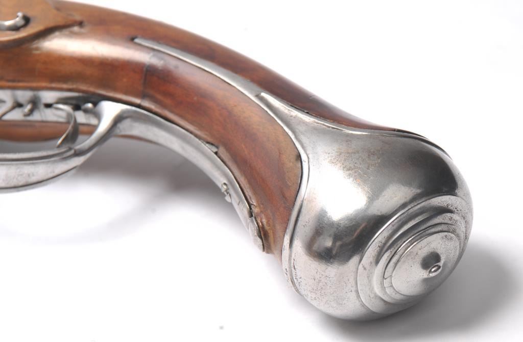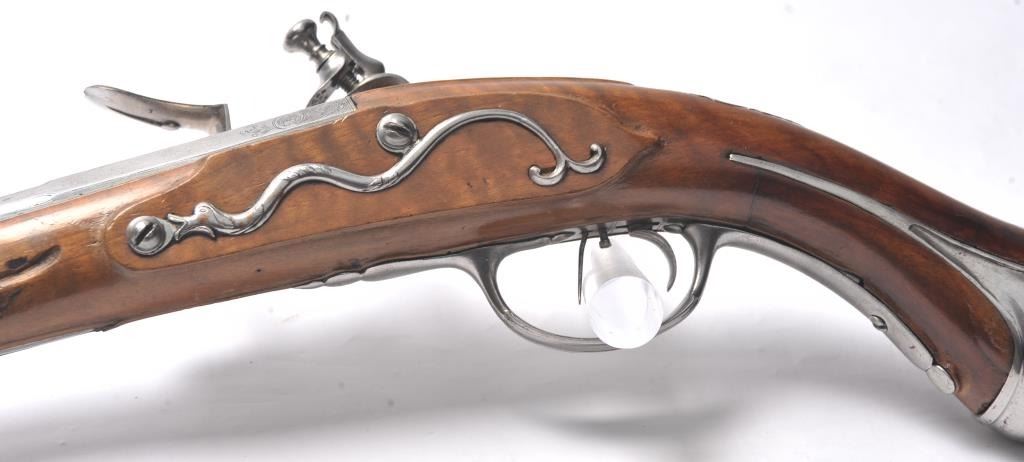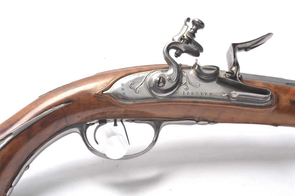 Unusual flintlock pistol signed in cypher with double set triggers and steel mounts. Measures 20 ¼” overall with a 12 ¼” barrel of approximately .62 caliber smoothbore. The lock is marked “I.L.G.Z.Y.V.B.” at the center and “H.H.K.” at the rear. The breech is marked “I.L.G.Z.Y.V.E.” in block letters hand engraved. Early serpentine side plate with long straps and elongated rear escutcheon. It is my opinion that this pistol and its mate(See Lot #184 this auction) were made in the 17th century and restocked approximately 100 years later during use. The stock is a light colored maple or fruitwood and is raised carved with minor cracks and refinishing.Original flintlock parts with minor cleaning but very good metal. The action functions and triggers work and set. We are selling each pistol as a separate lot and no buyer’s option. (Antique) Est.: $1250-$2500