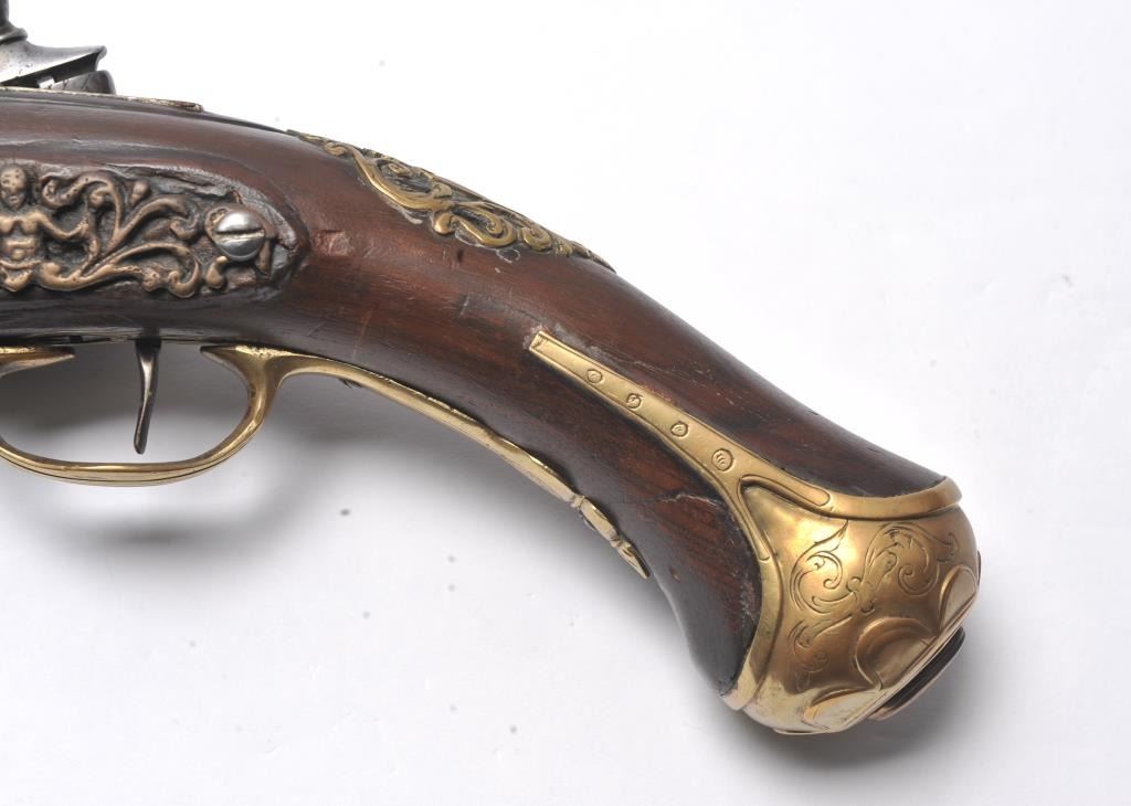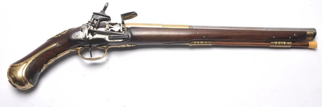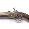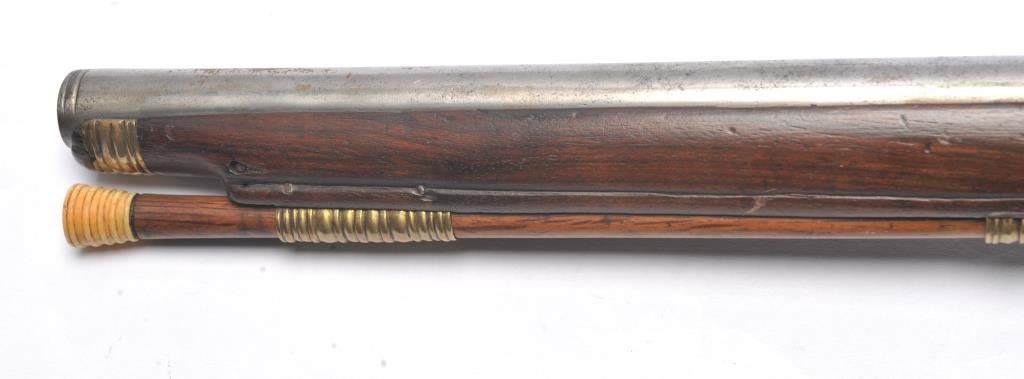 Massive Miquelet Flintlock Size Pistol with half brass sheathed barrel and brass mounts. Measures 22” overall with a 15 1/8” barrel of .60 caliber smoothbore. A small maker’s cartouche at the breech in silver and shows a crown and 3 fancy intertwined initials that we cannot decipher other than “R”. Shows an old re-stocking and very good plus condition overall with light cleaning leaving crisp edges. Lock works well. The biggest miqueletpistol we have seen in decades. (Antique) Est.: $1000-$2000