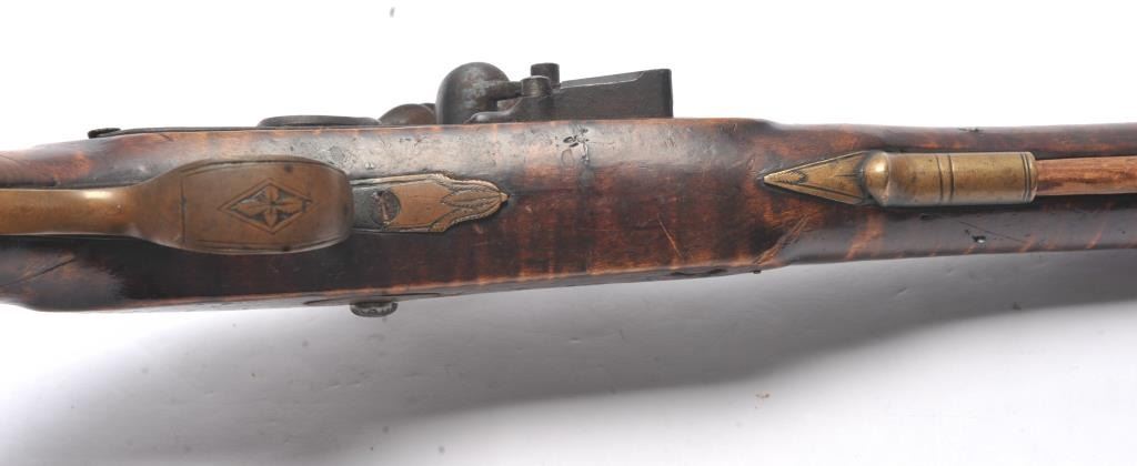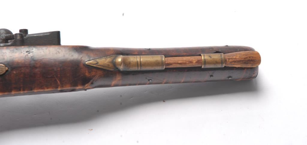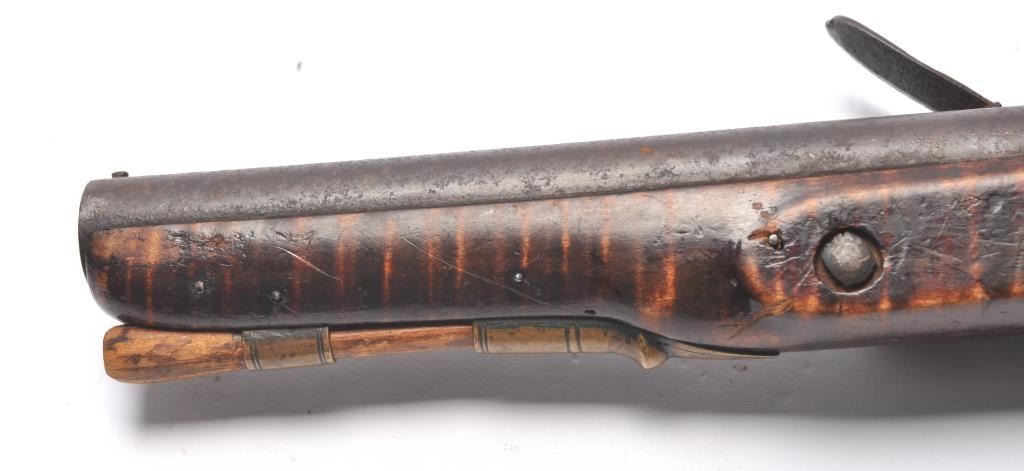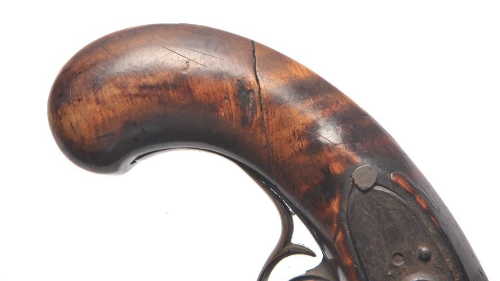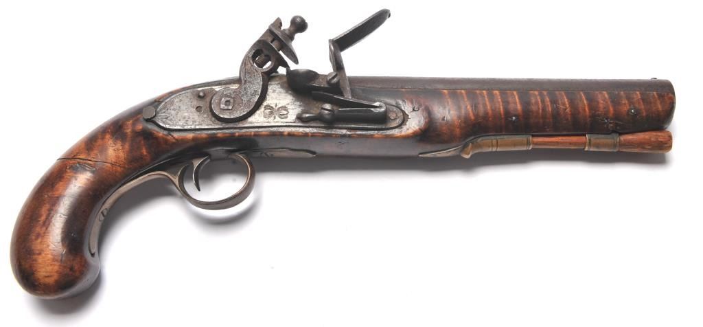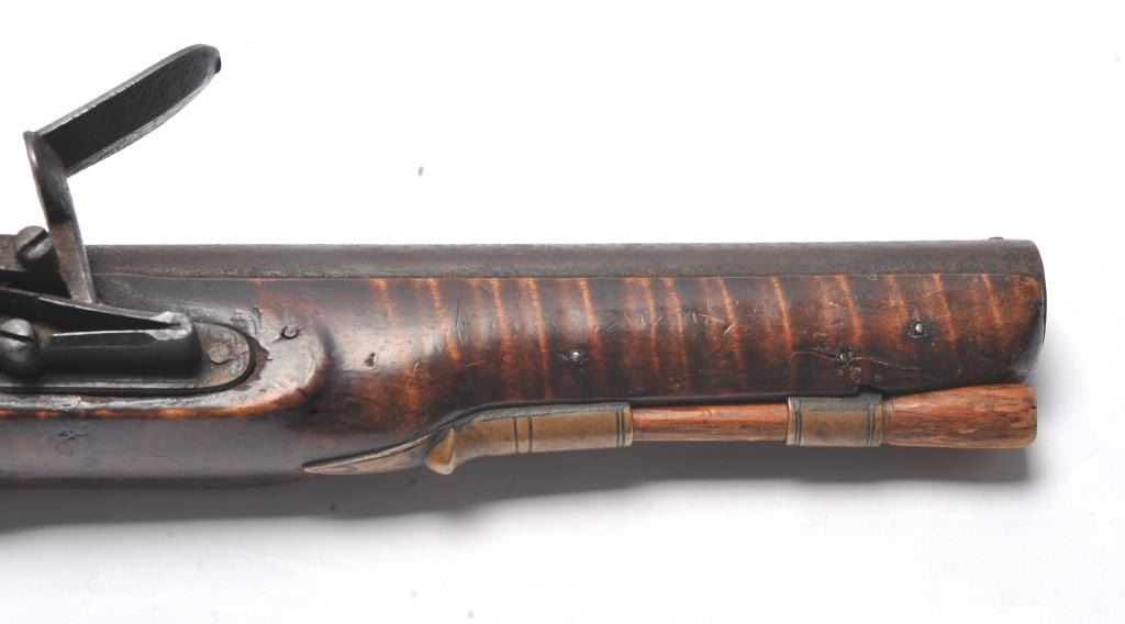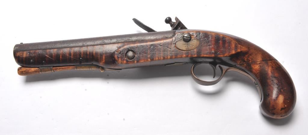 Early American Flintlock “Kentucky” style pistol with stripped walnut stock. Unsigned in “Out of the Attic” uncleaned condition. Measures 13 ½” overall with a 7 7/8” heavy round barrel that is rifled and approximately .54-.56 caliber. Simple engraved brass mounts that are purely American in their native design. The lock and barrel show a dark almost black patina and all original flintlock parts. There is a typical starengraved half down the barrel and floral like 2 tulips at the center of the lock. The stock is inlaid with a small plaque professionally inscribed “A. Joy”. The stock shows an old break and brass plate securedwith screws to repair. The lock has been secured by two metal studs or bolts that are old forged repairs. The flintlock parts are all original to the period and the hammer screw has been sheared off long ago duringuse and has not been repaired. The stock other than the aforementioned break and repair is good to very good with considerable original varnish showing minor losses, openings around pins, and even aging. A hand