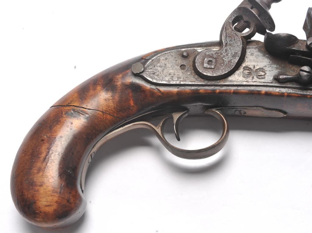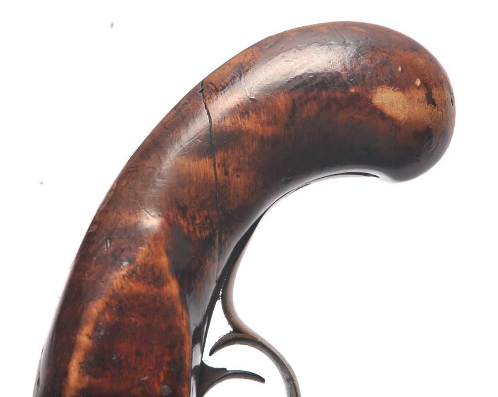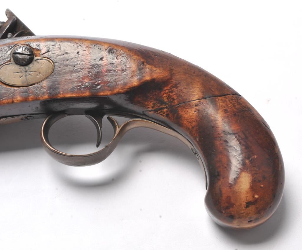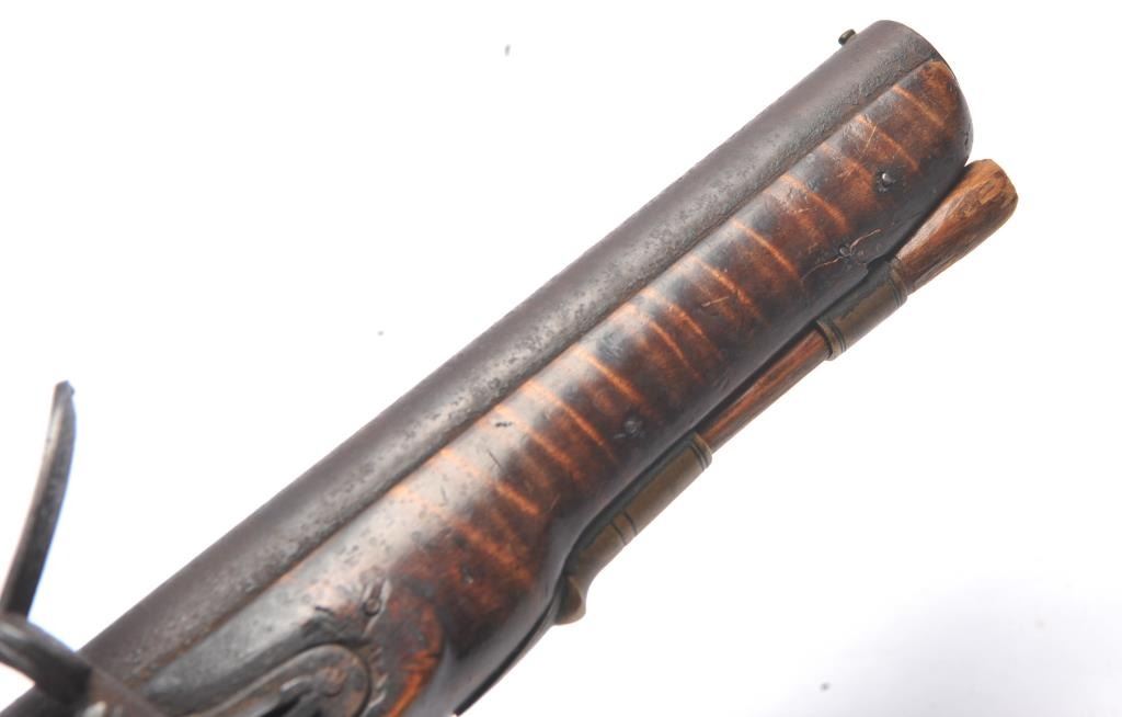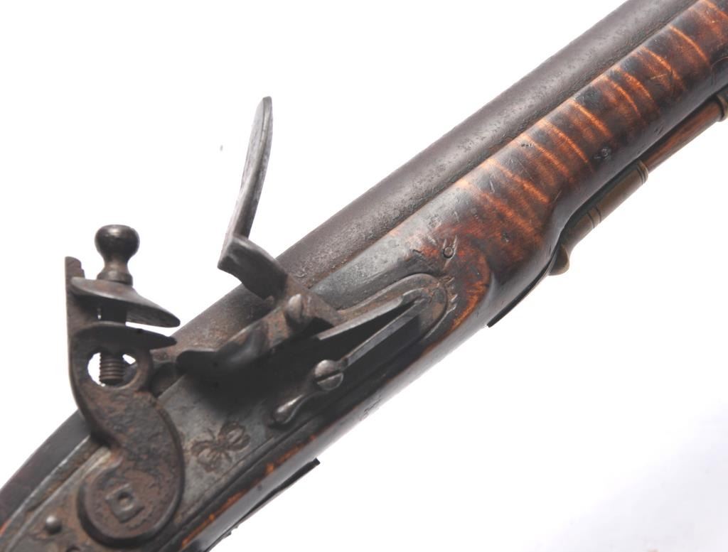 Early American Flintlock “Kentucky” style pistol with stripped walnut stock. Unsigned in “Out of the Attic” uncleaned condition. Measures 13 ½” overall with a 7 7/8” heavy round barrel that is rifled and approximately .54-.56 caliber. Simple engraved brass mounts that are purely American in their native design. The lock and barrel show a dark almost black patina and all original flintlock parts. There is a typical starengraved half down the barrel and floral like 2 tulips at the center of the lock. The stock is inlaid with a small plaque professionally inscribed “A. Joy”. The stock shows an old break and brass plate securedwith screws to repair. The lock has been secured by two metal studs or bolts that are old forged repairs. The flintlock parts are all original to the period and the hammer screw has been sheared off long ago duringuse and has not been repaired. The stock other than the aforementioned break and repair is good to very good with considerable original varnish showing minor losses, openings around pins, and even aging. A hand