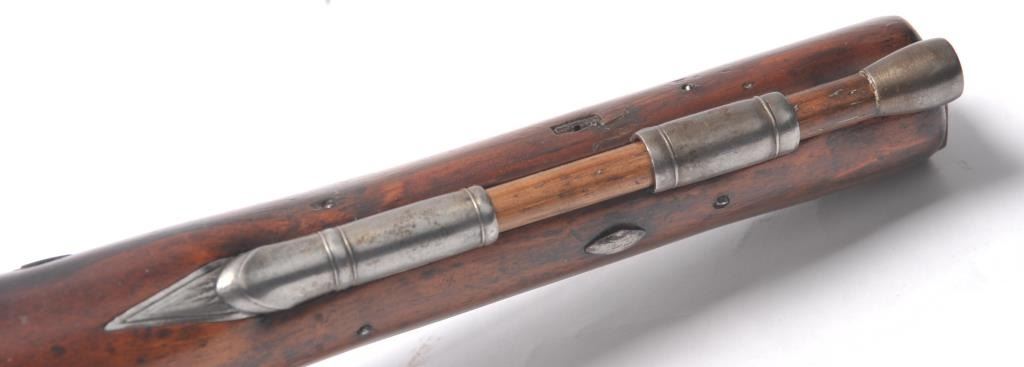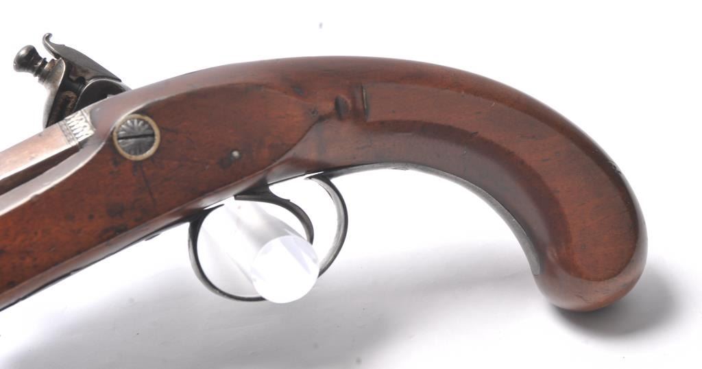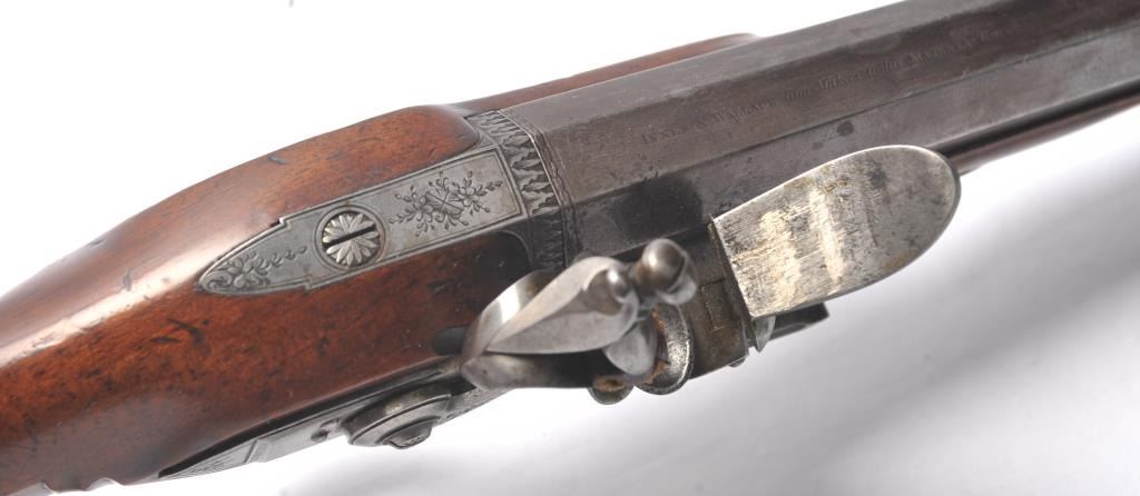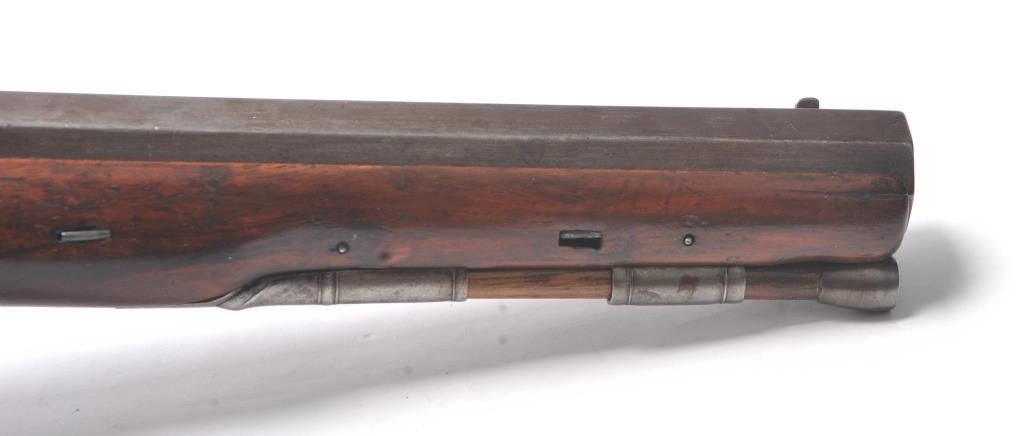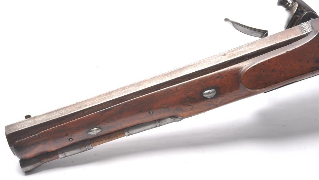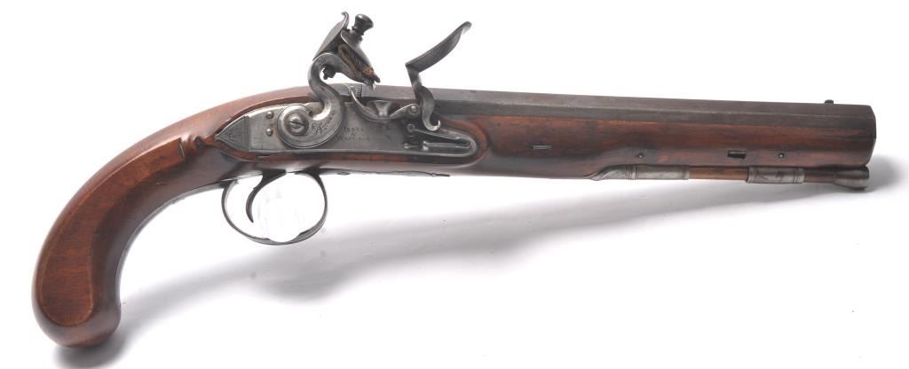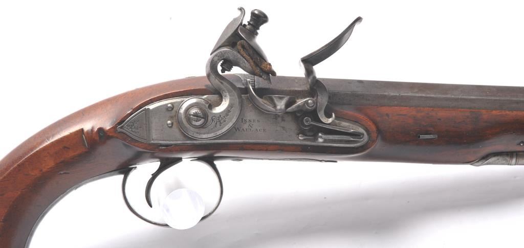 Scottish flintlock dueling pistol signed “Innes & Wallace Gun Makers to His Majesty EdinR (Edinburgh). The pistol remains in very good plus condition with considerable brown showing on the barrel and lightly cleaned but crisp metal surfaces. The full stock is very good plus to almost fine with only minimal marks and light aging. The markings are sharp and all original flintlock parts. Correct style ramrod, Waterproof pan circa1800-1830s. Measures 14 ½” overall with a 9” octagon barrel of approximately .62-.64 caliber smoothbore. (Antique) Est.: $800-$1600