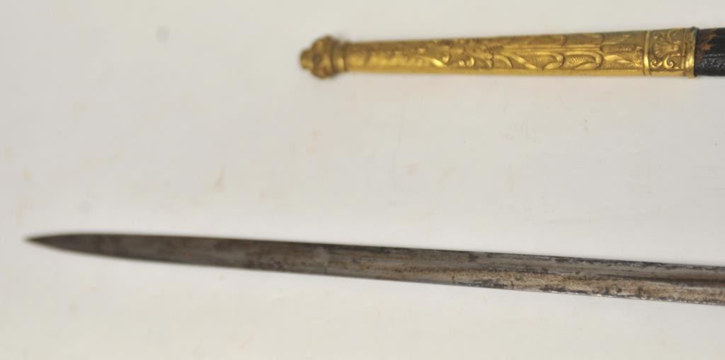 Exceptional French Presentation Naval Officer’s Sword with blued and gilt blade reading “Escadre D Evolutions 1876-1877” and “Les Officers De Letat Major General A Lamiral Peyron”. The reverse of guard reads“27 Mars 1877”. The blade is gold damascened with blued backgrounds and marked “Msn. Fournier, Letilluer Succr. Paris”. Turned horn grip with fancy gilded mounts in naval motifs. Very good plus to near fine condition with minor aging and small imperfections. Researchable. Est.: $600-1200