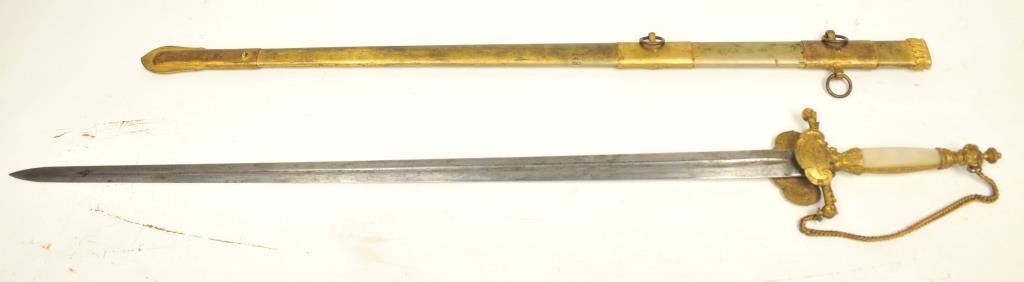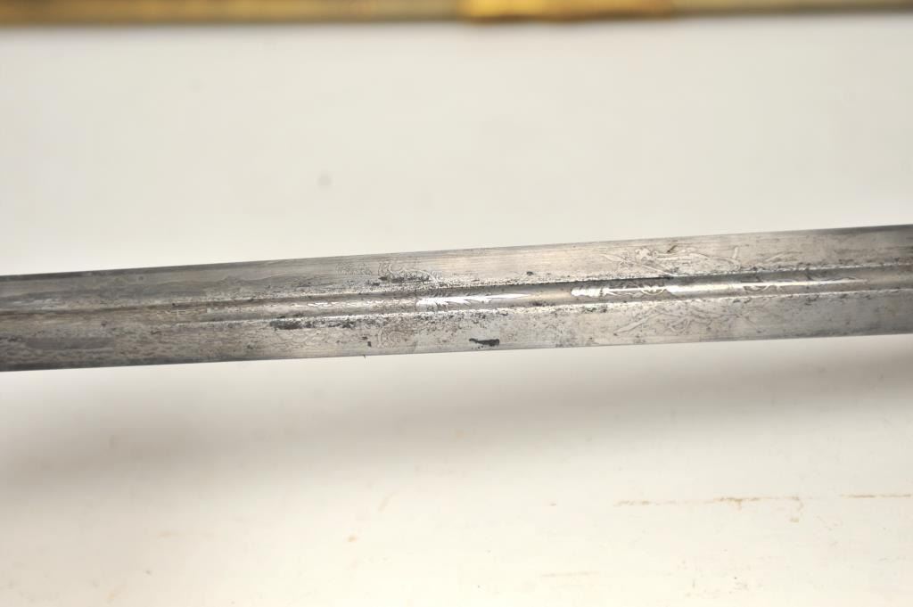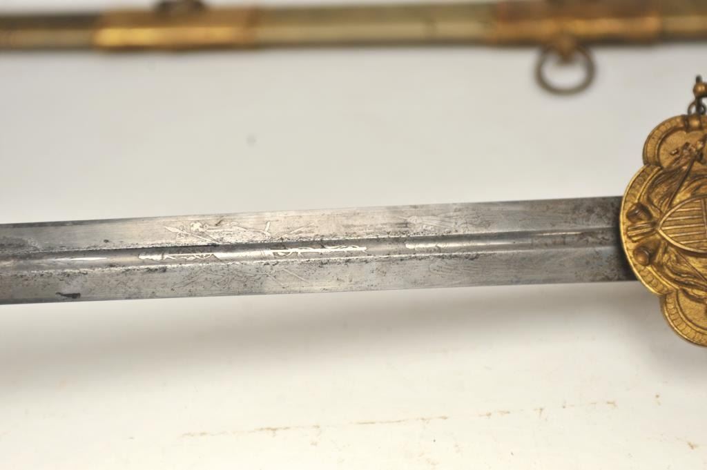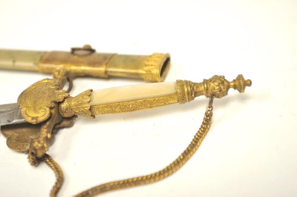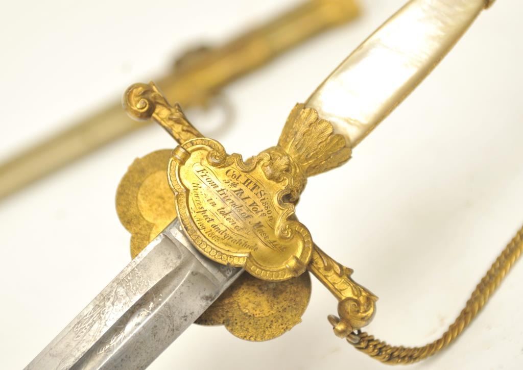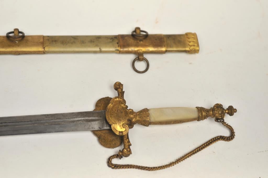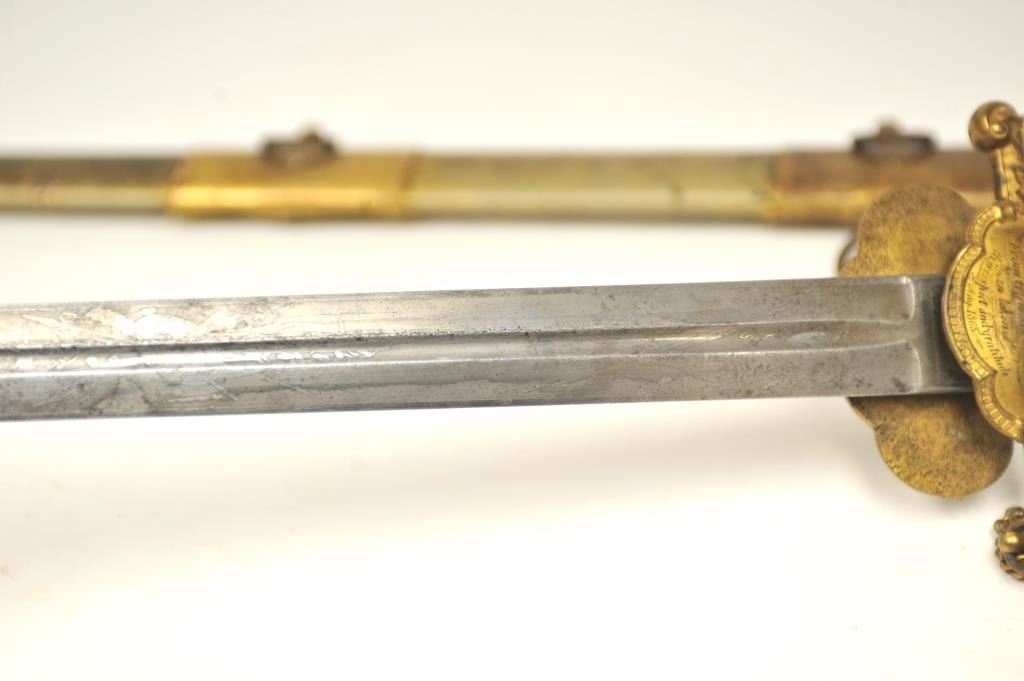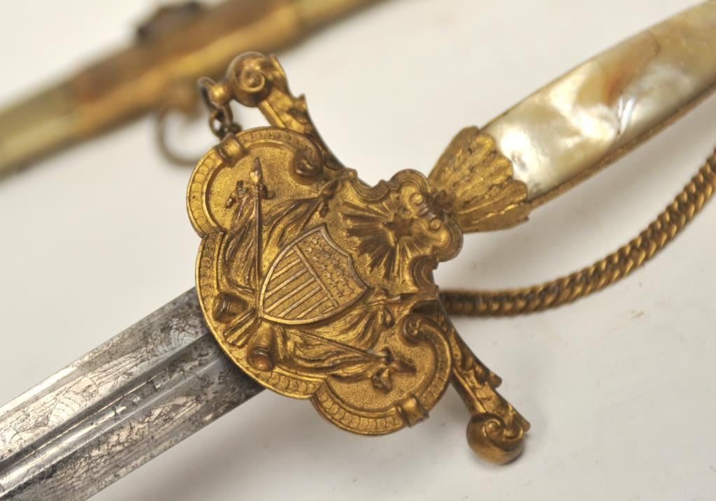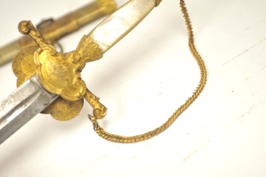 U.S. Militia style officer’s sword of very high grade with ornate gilt brass mounts and pearl grip inscribed “Col. H.T. Sisson 5th R.I. Vol, From Friends of Mass. 44th, In Token of Respect and Gratitude, Aug, 1863”.Also included in this lot is a similarity inscribed silver tea service presented upon same occasion in its original case. The condition of etched blade and sword are very good plus with minor erosion and normalaging. Provenance: Mike Shotwell Collection 1990s. Est.: $7,000-$14,000