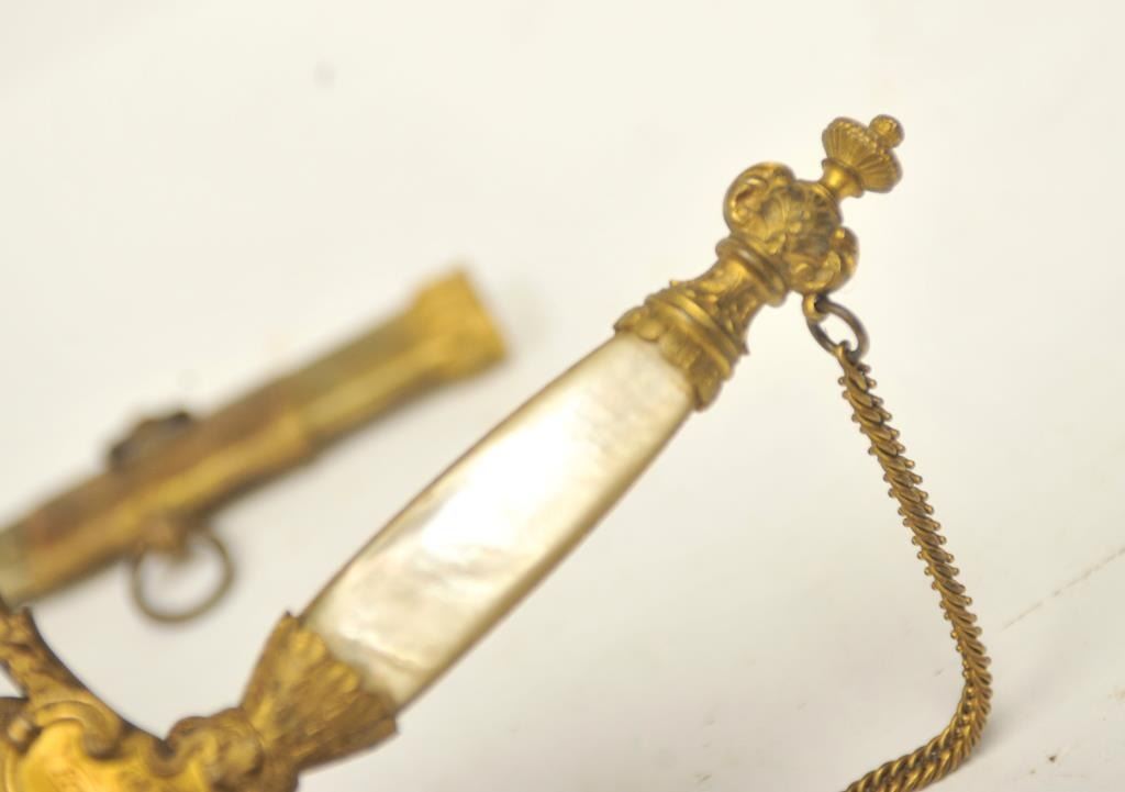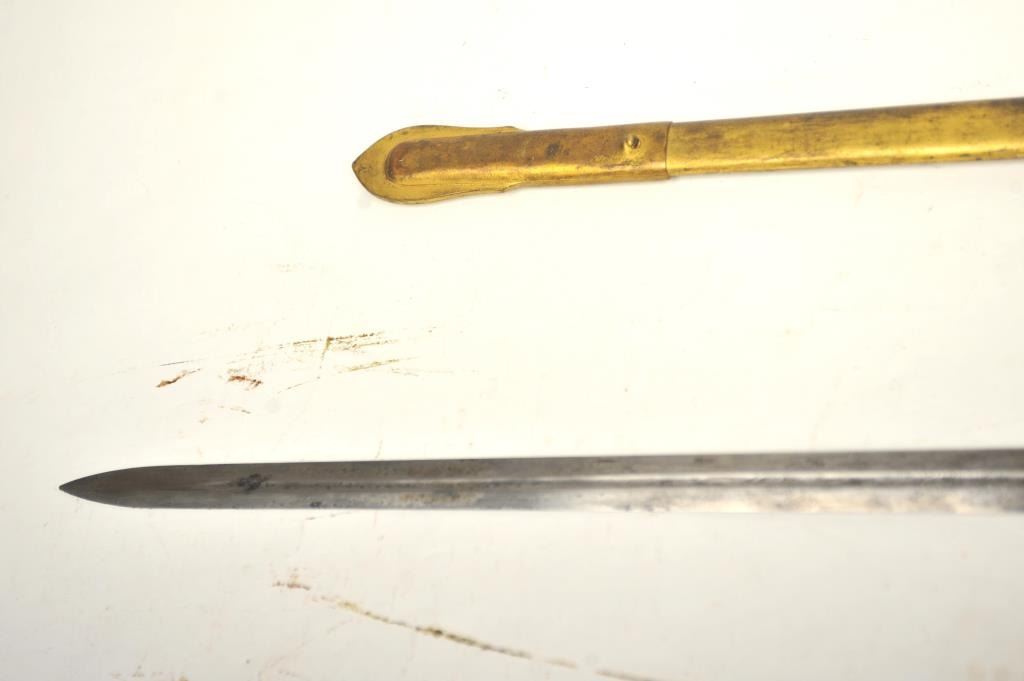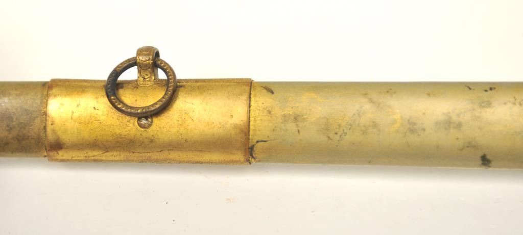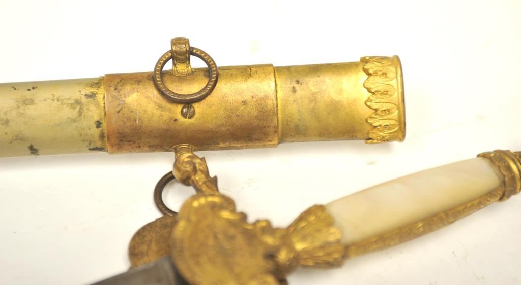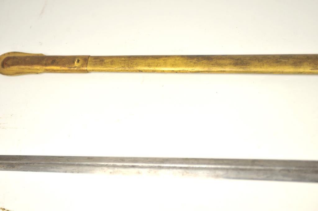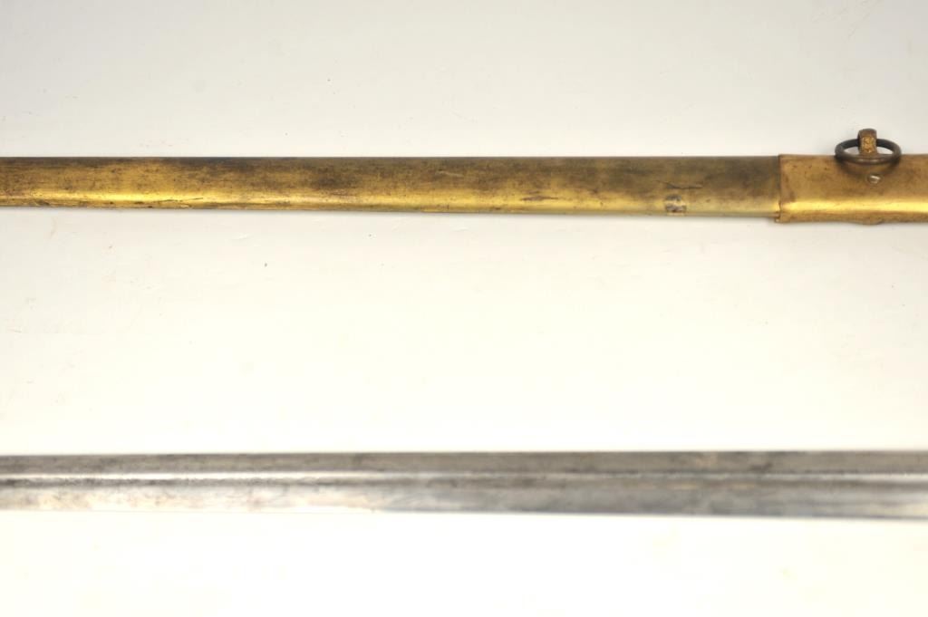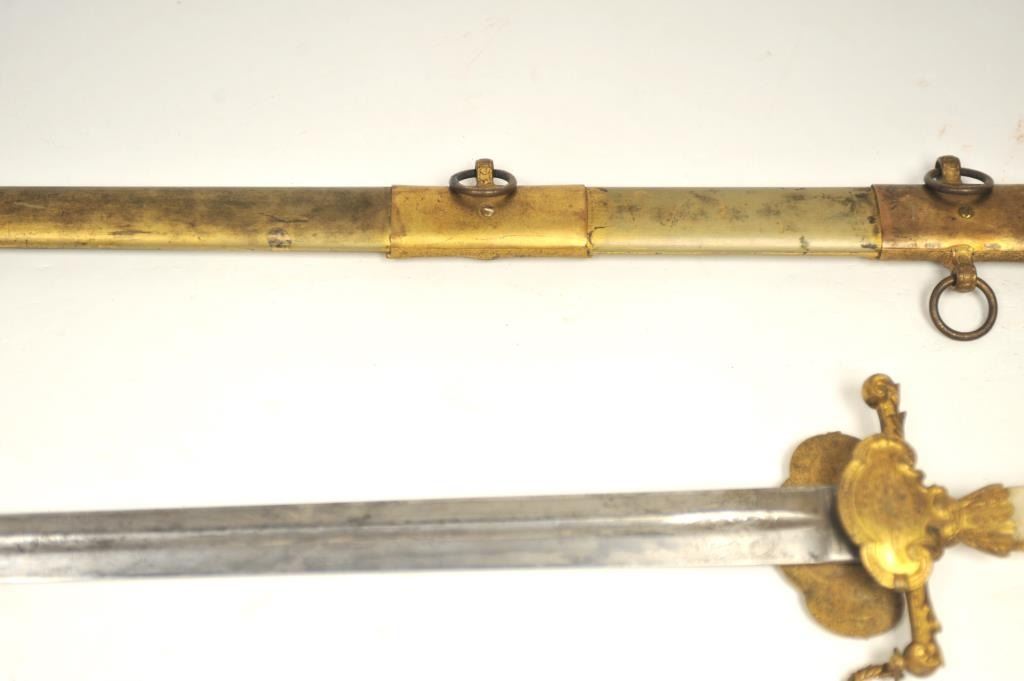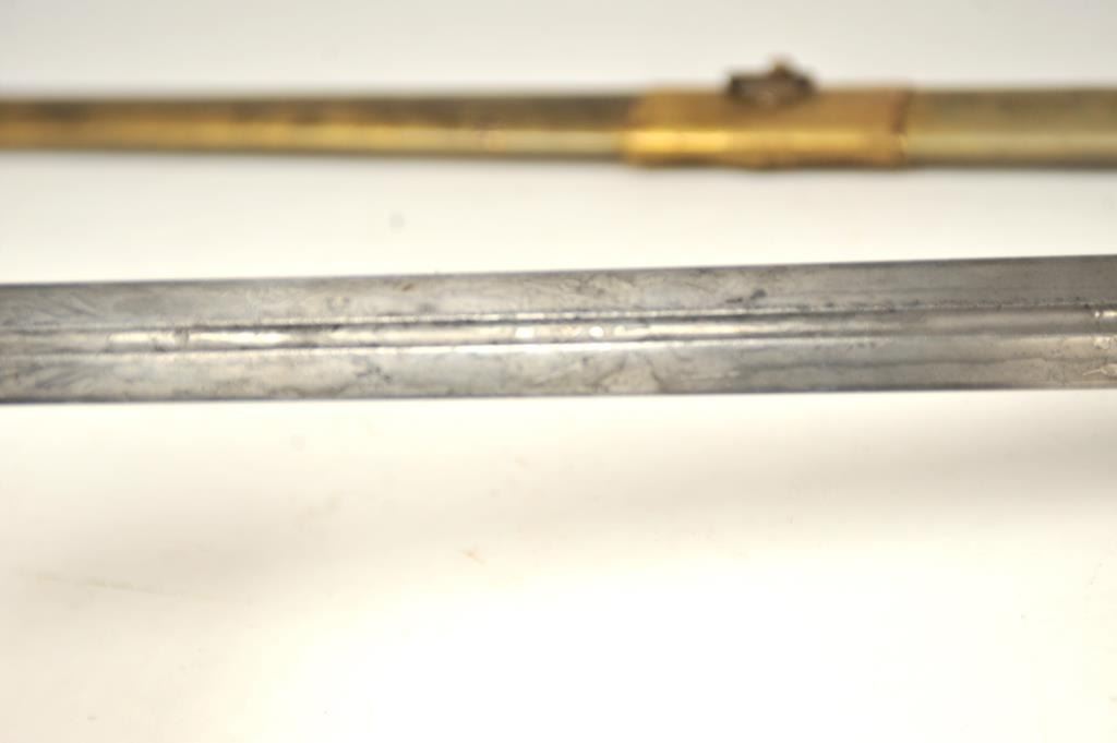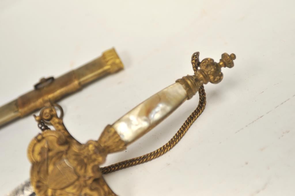 U.S. Militia style officer’s sword of very high grade with ornate gilt brass mounts and pearl grip inscribed “Col. H.T. Sisson 5th R.I. Vol, From Friends of Mass. 44th, In Token of Respect and Gratitude, Aug, 1863”.Also included in this lot is a similarity inscribed silver tea service presented upon same occasion in its original case. The condition of etched blade and sword are very good plus with minor erosion and normalaging. Provenance: Mike Shotwell Collection 1990s. Est.: $7,000-$14,000