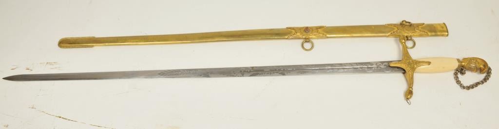 Presentation Grade Ames militia officer’s sword for high ranking officer’s. The sword shows ivory grip and fancy mounts with star on the hilt, Roman helmet pommel, Union shield, and jeweled (red stones mayberubies?) in panel at second hanger of bird. The scabbard is marked Ames. Fine to excellent overall condition with most bright polish on “Minty” blade. Est.: $900-$1800