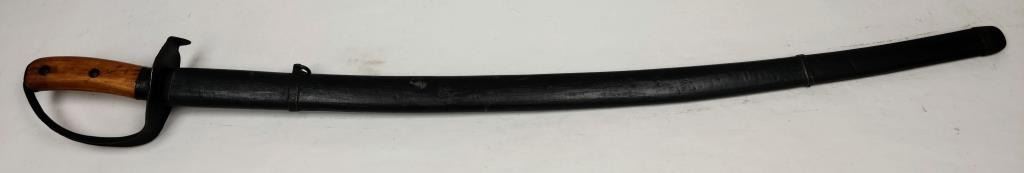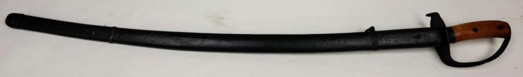 Interesting and large cavalry sword possibly Chinese circa 1910-1930 with 37” very thick blade and 43” overall. Light wood grip with 2 rivet type studs spring release like Japanese 20th century military sword. Lightcarved wood scabbard with thin metal Asian style drag and mounts. The condition is fine to excellent. Completely unmarked. Est.: $500-$1000
