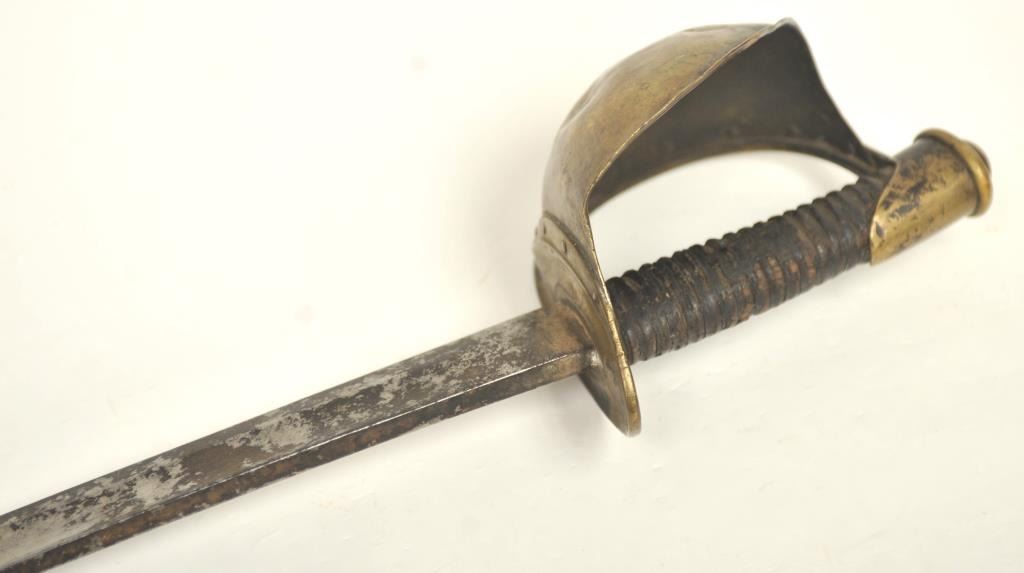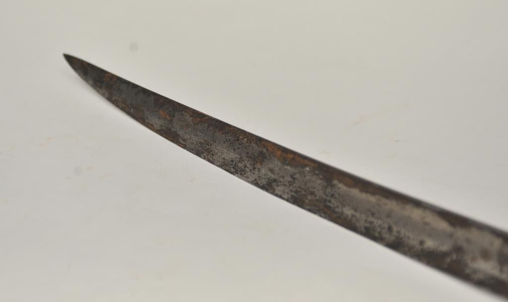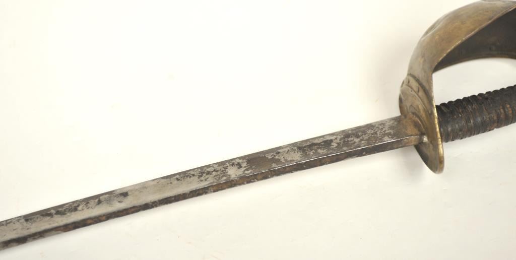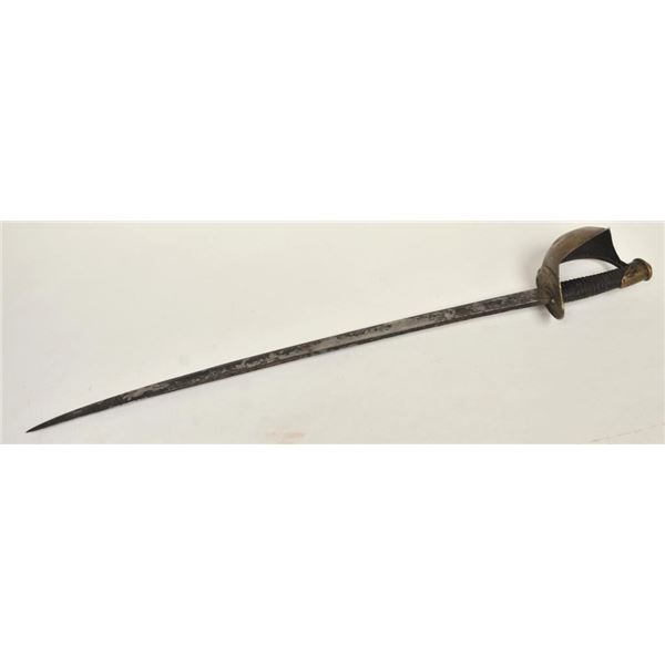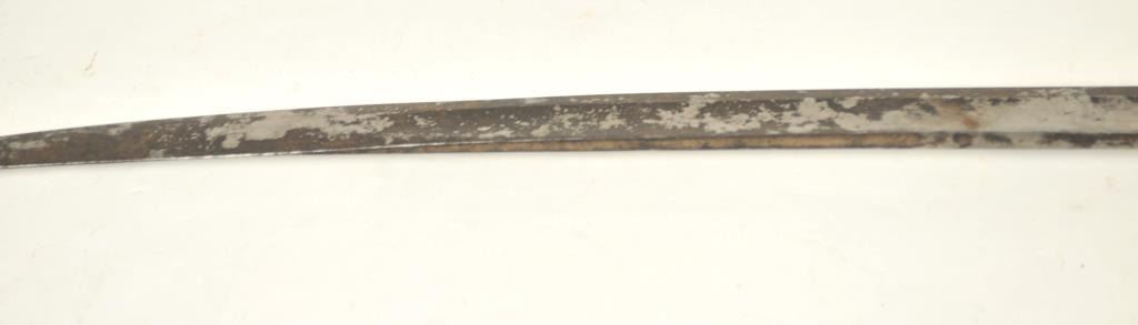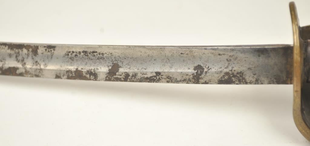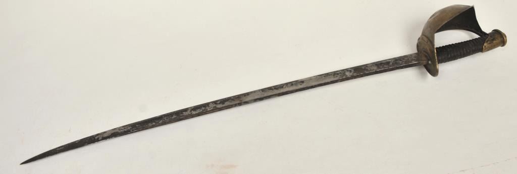 1860 U.S. Naval cutless by Ames in fair condition with no scabbard. Some heavy pitting. Wire removed. Gun shows some dents. Ames mark partially visible. Est.: $200-$400