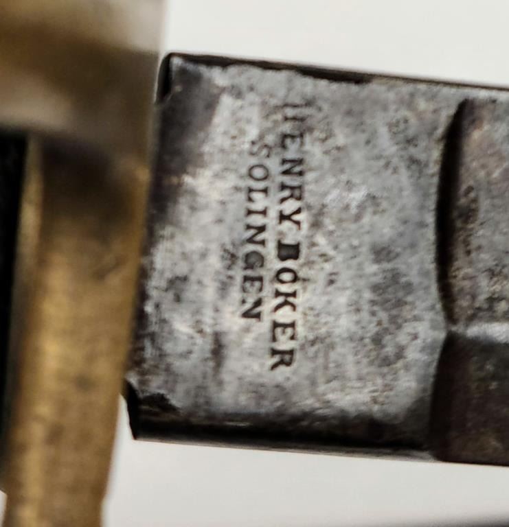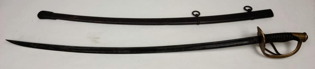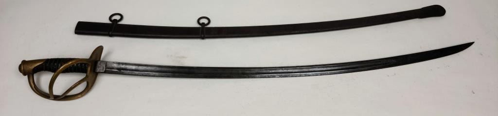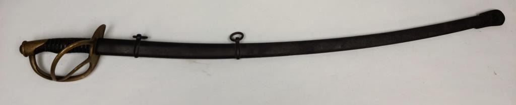 1860 Model Cavalry Sword with scabbard marked  “Henry Boker Solingen” probably imported  during the Civil War. Good wire wrapped  leather grip shows normal aging and some  heavy pitting on the scabbard. About goodoverall. Est.: $350-$700