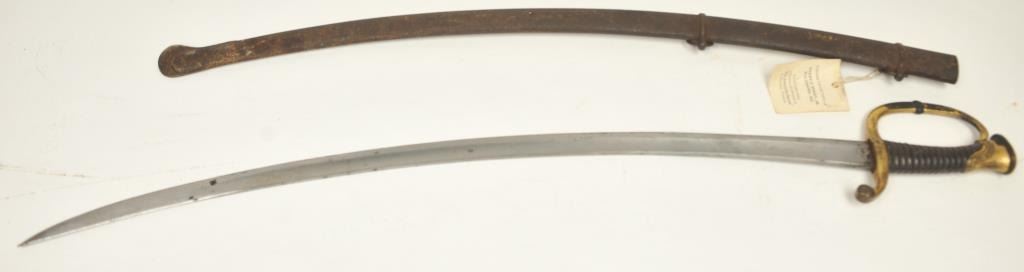 1840 Artillery Officer’s Grade Saber showing gilted and leaf decorated hilt. Tag attached reads “Former Collection of, Harry D. Berry Jr., Baltimore, MD”. Pieces of his noted collection are pictured in “The AmericanSword” by Harold Peterson. Good overall condition with scabbard showing heavy brown patina and rust. About 60%-70% rich gold gilt with balance a dark patina. The grip is very good plus with almost excellent wrap. Theblade is very good showing small foreign proof (French Style). Est.: $700-$1400