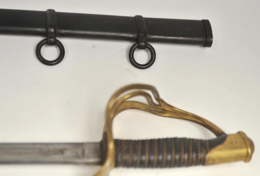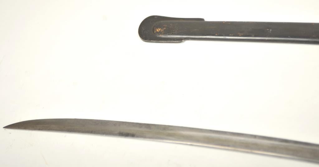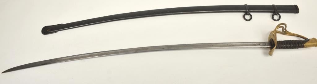 U.S. Model 1860 cavalry Saber with scabbard marked “Mansfield & Lamb, Forestdale, R.I.” and dated “1864” with U.S. mark and “J.M.” inspection. The hilt is stamped “27” on the pommel cap. Slight bend to the guard andmarked “LVIII” by owner. Good to very good overall. Wrap is good on the grip with wire repair using old nail (Period of use). Est.: $300-$600