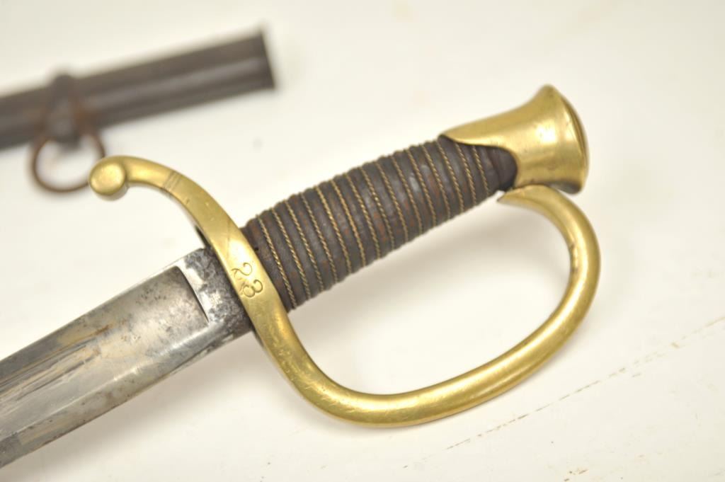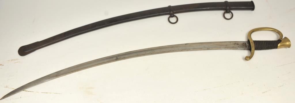 U.S. Model 1840 Artillery Sword with scabbard marked “Ames” and “V.S.”. scabbard shows a deep patina and some pitting on the scabbard and at ricasso where blade meets hilt for about 1/4” and the remainder of the blade isvery good plus. #28 on center of guard. Grip and wrap are also very good. Est.: $350-$700