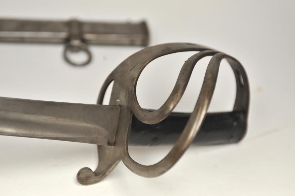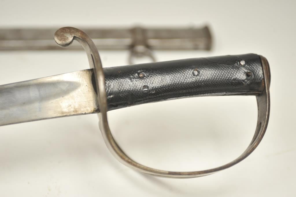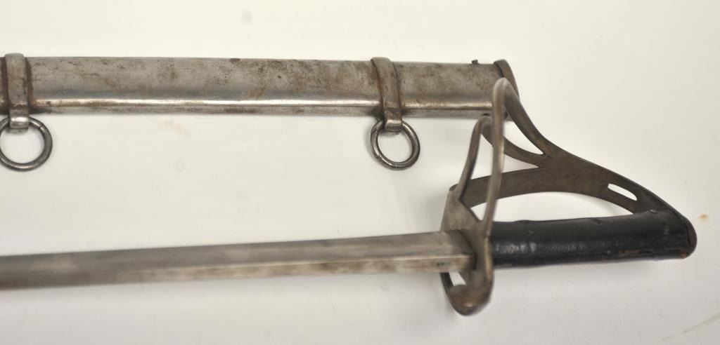 Civil War era English Cavalry style sword marked “Mole” who was a known importer to the confederacy. Iron hilt and mounts with checkered dark stained wood grip. Good to very good overall with some large dents inthe scabbard and wear to the grip. Minor pitting. The blade is lightly cleaned but at least very good. Measures 41” overall with a 35 ½” blade. Est.: $700-$1400