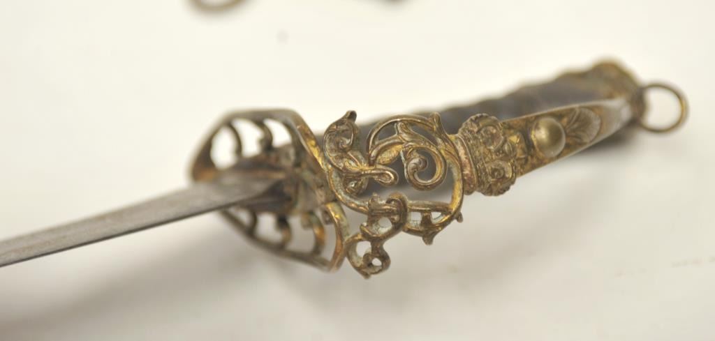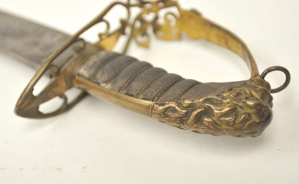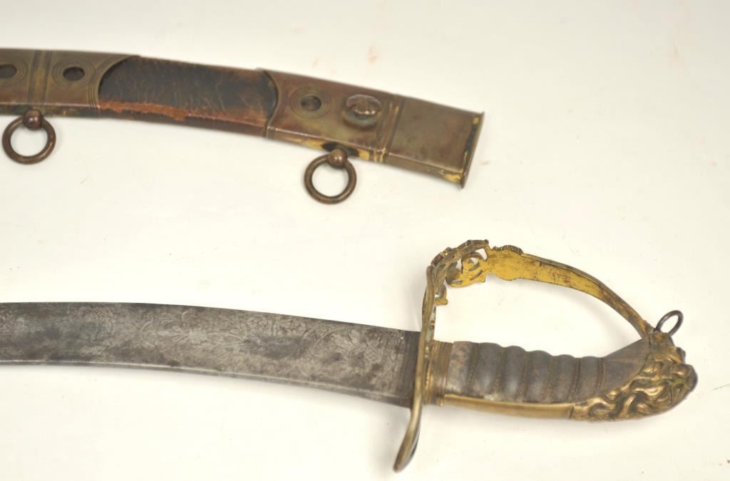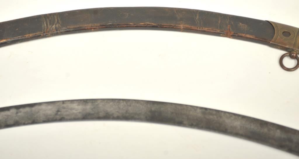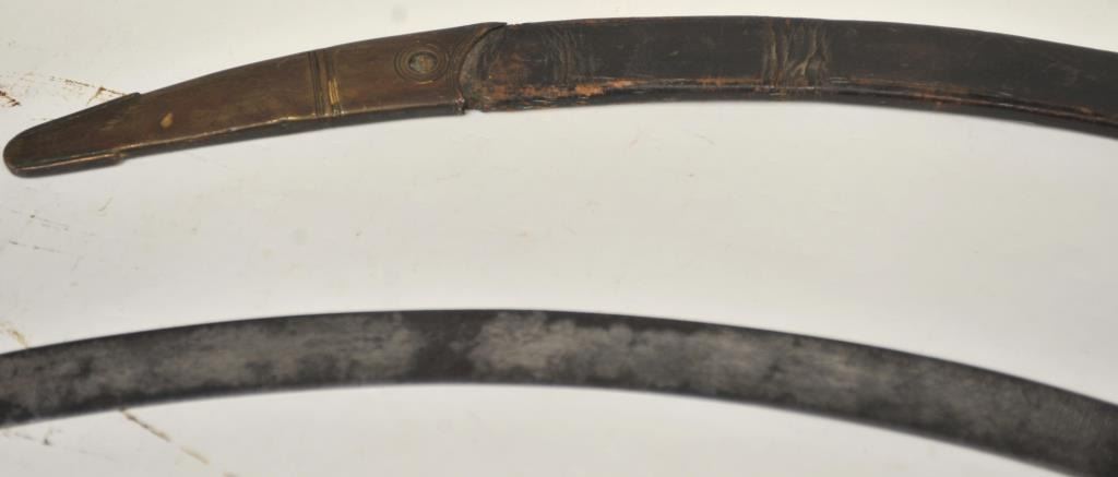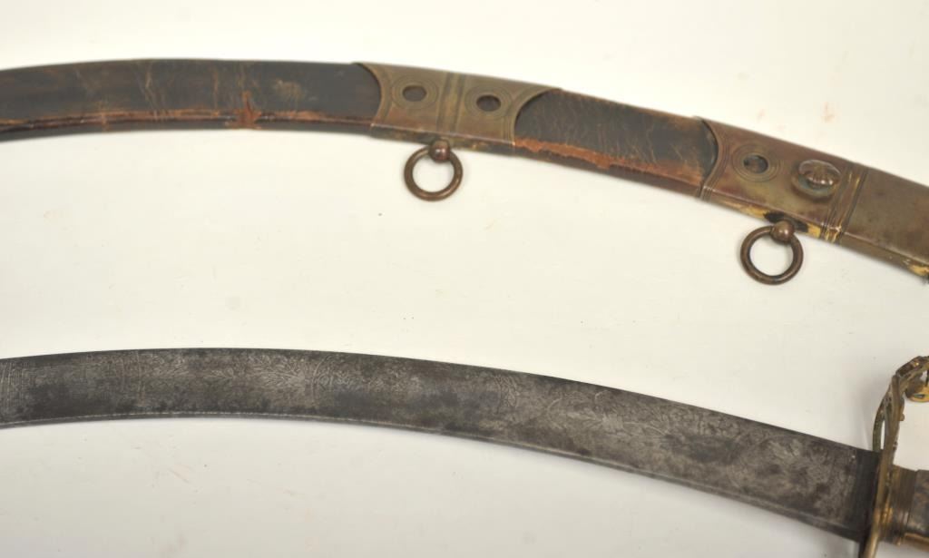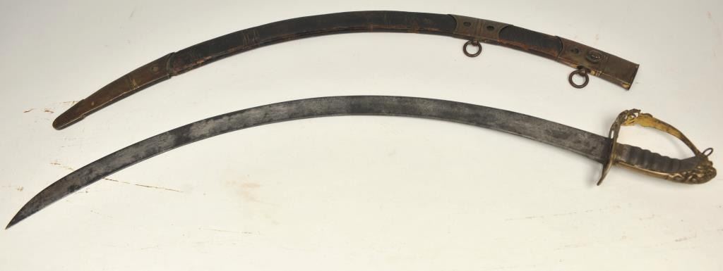 British Cavalry Officer’s Sabre of Georgian era with radically curved blade and original brass mounted leather scabbard. The blade is etched “HMM” and signed “Cyper”. The scabbard is marked in cartouche “Reddell SwordCuttler R.H. Prince of Wales, Duke of Hessen” and his London address. The condition is good with some normal aging to the blade and about half the etching. The sharkskin grips has small tatters and losses. The scabbard is good with normal wear. Early 19th century possibly Napoleonic era. Est.: $800-$1600