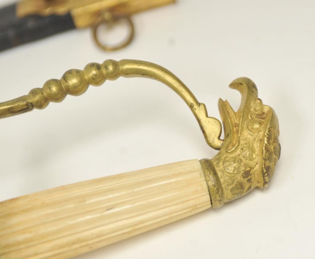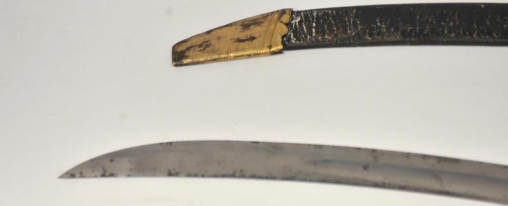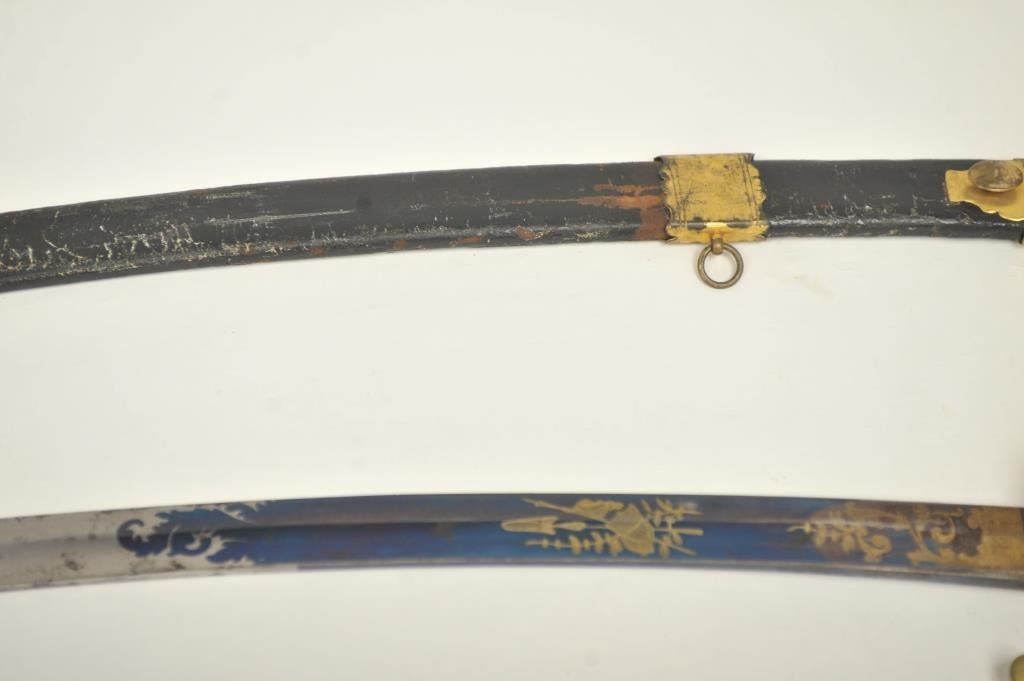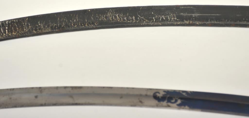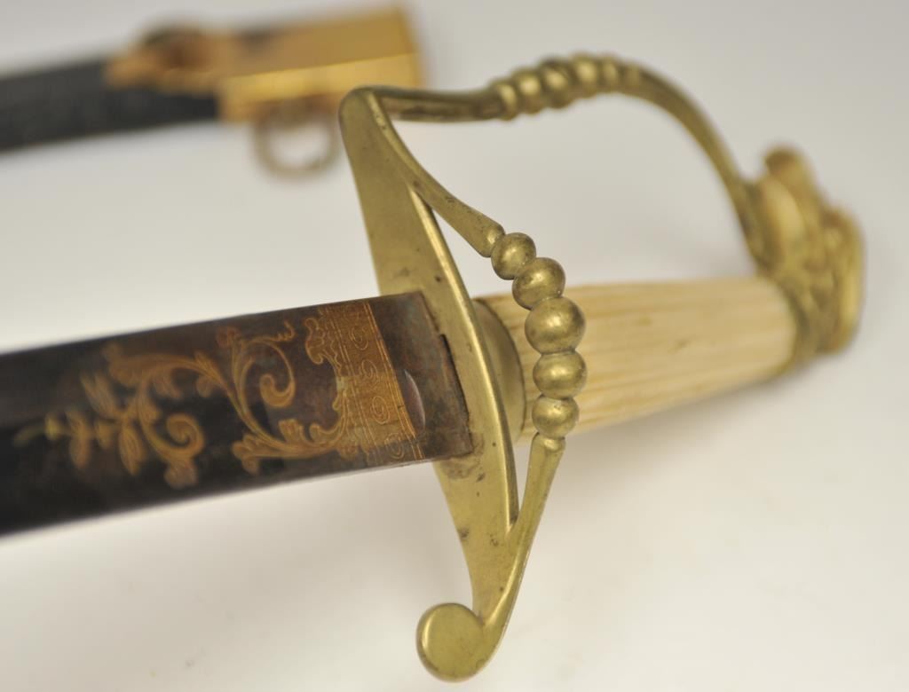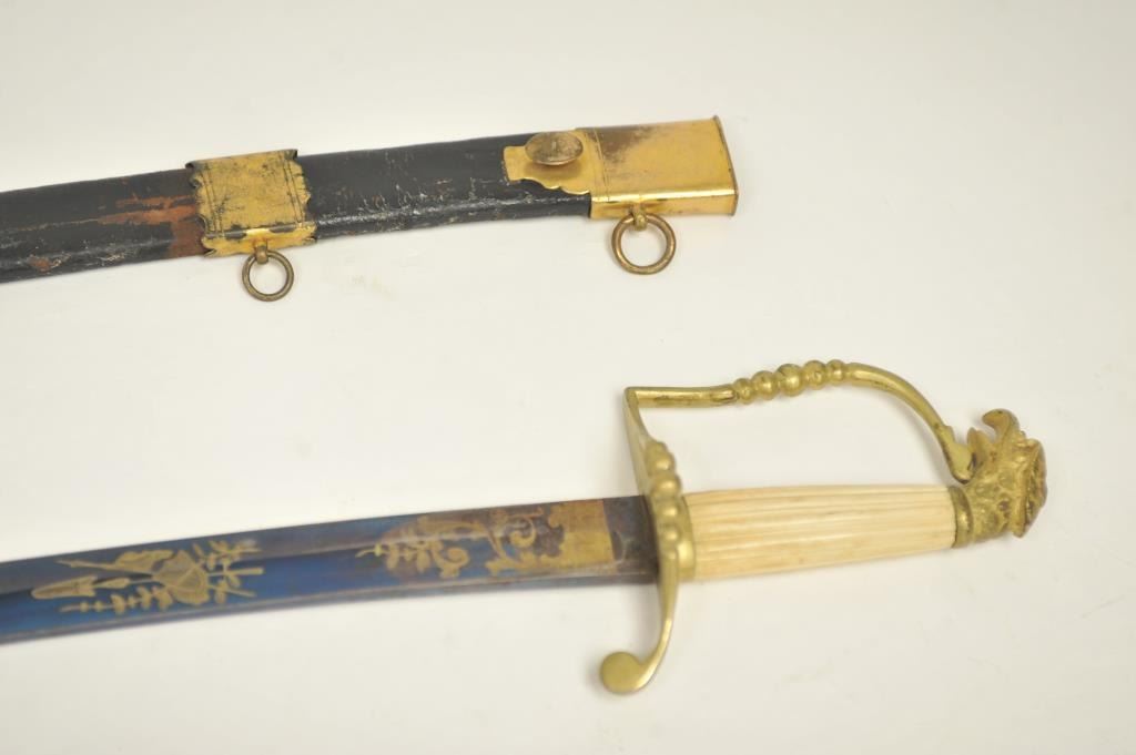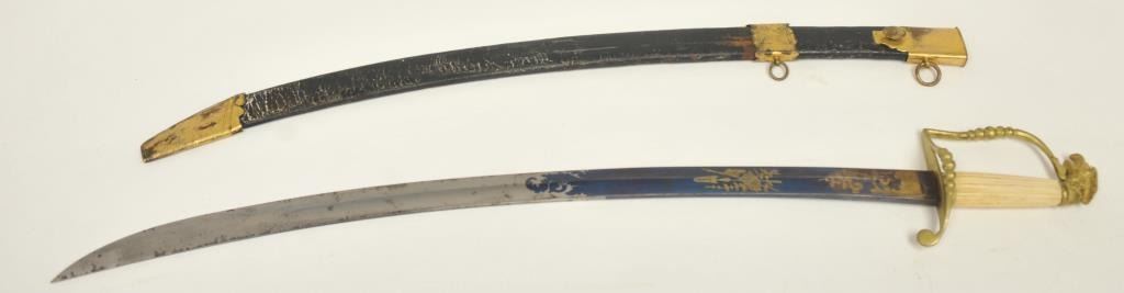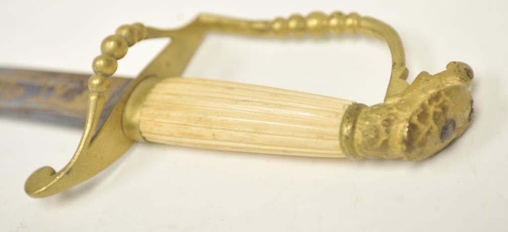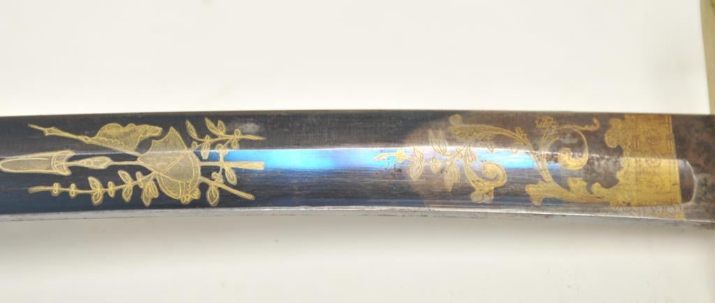 U.S. Eagle Headed Officer’s Sword with bled and gilt blade, fluted bone grip and retaining original scabbard. Very good plus to near fine original condition with 75%-85% bright blue and gilt on blade. The scabbardshows minor cracking and aging with most gold gilt retained on hilt. Almost near fine with minimal aging. A strong 8.5 on a 1-10 scale. Est.: $750-$1500