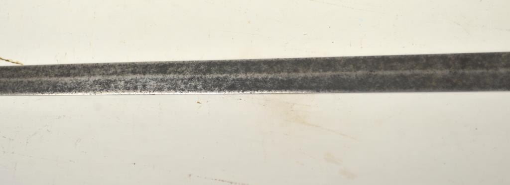 American eagle Headed sword with chain guard, fluted bone grip and measuring 31” overall with a 25 ¼” straight blade. No scabbard retained. The grip and hilt are very good plus but blade is fair to good with somepitting and cleaning long ago. Traces of engravings show under magnification. Est.: $350-$700
