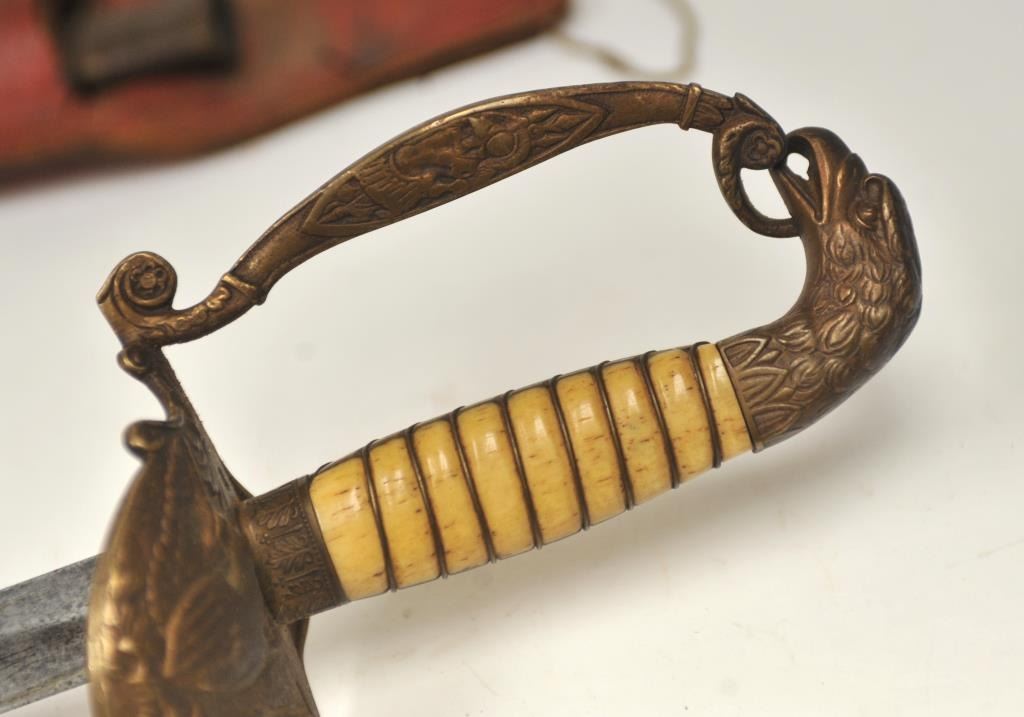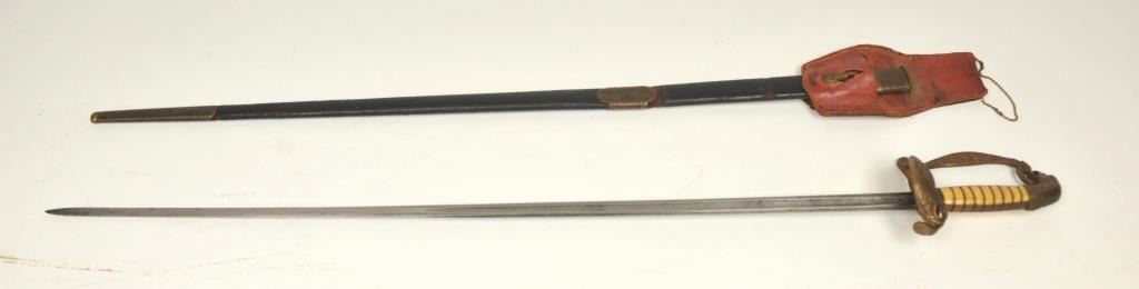 American Eagle headed Officer’s Sword with scabbard and hand stitched Moroccan red leather frog. Good overall condition with deep patina and normal aging. The scabbard shows some distress but still in one pieceand about good. Thin staff officer style blade. Est.: $600-$1200