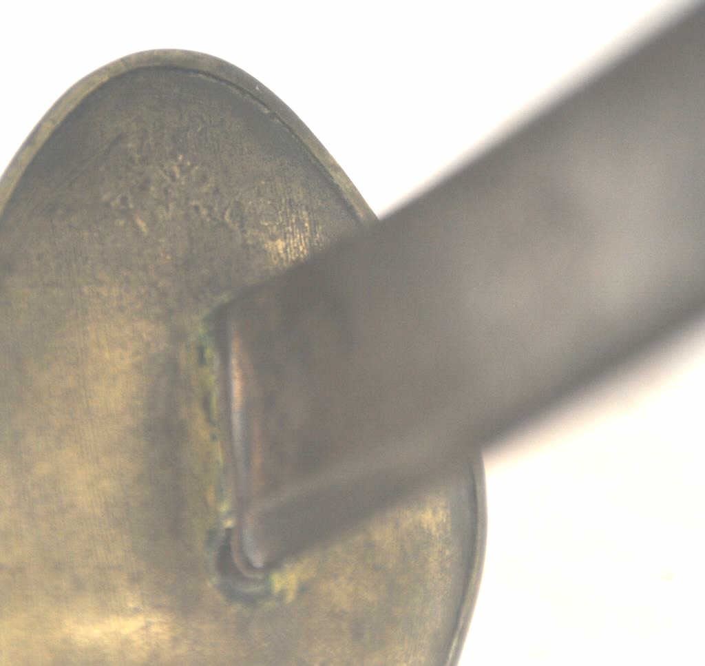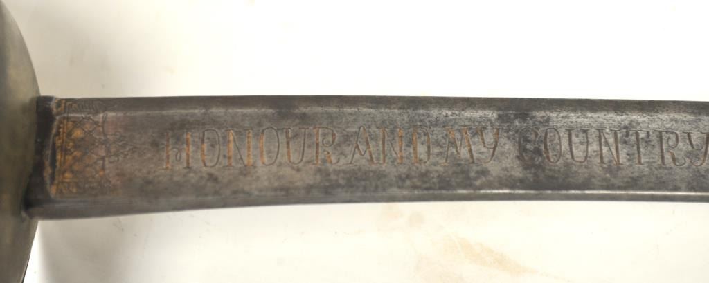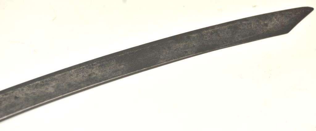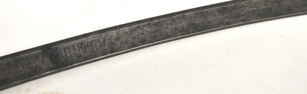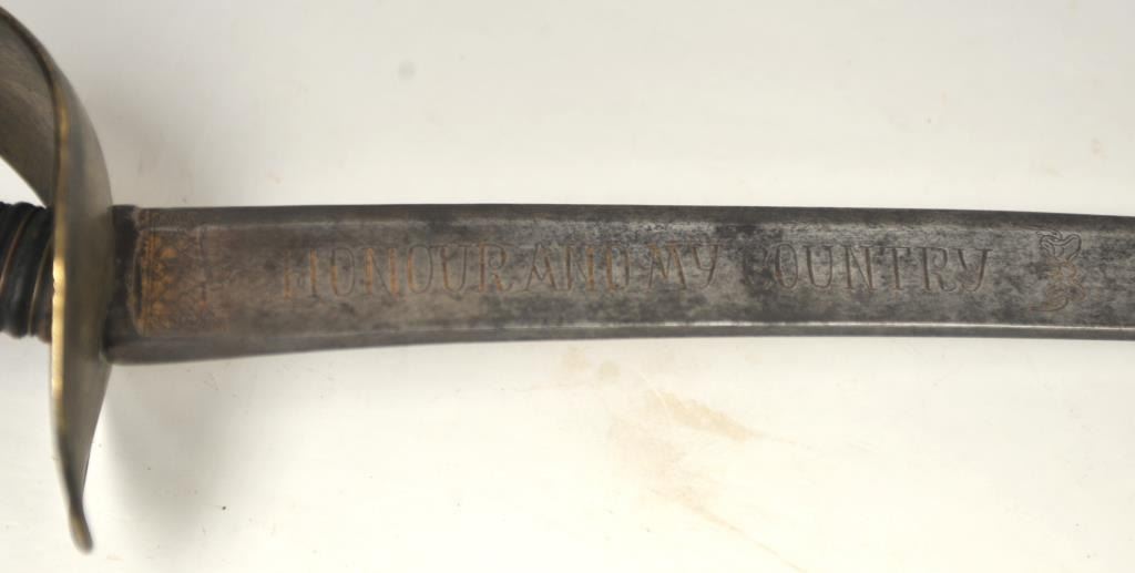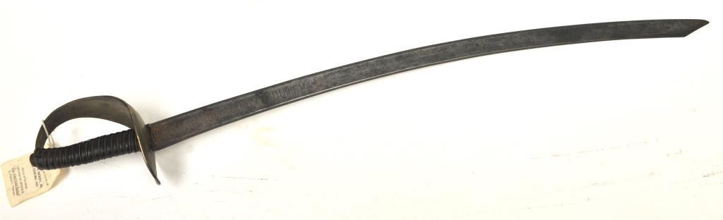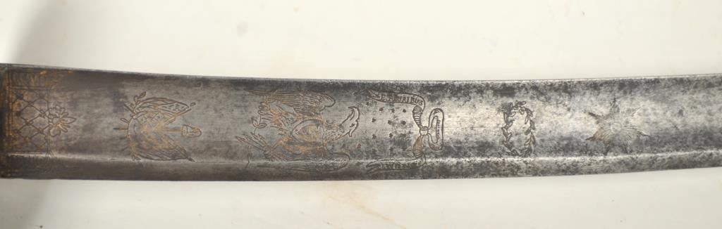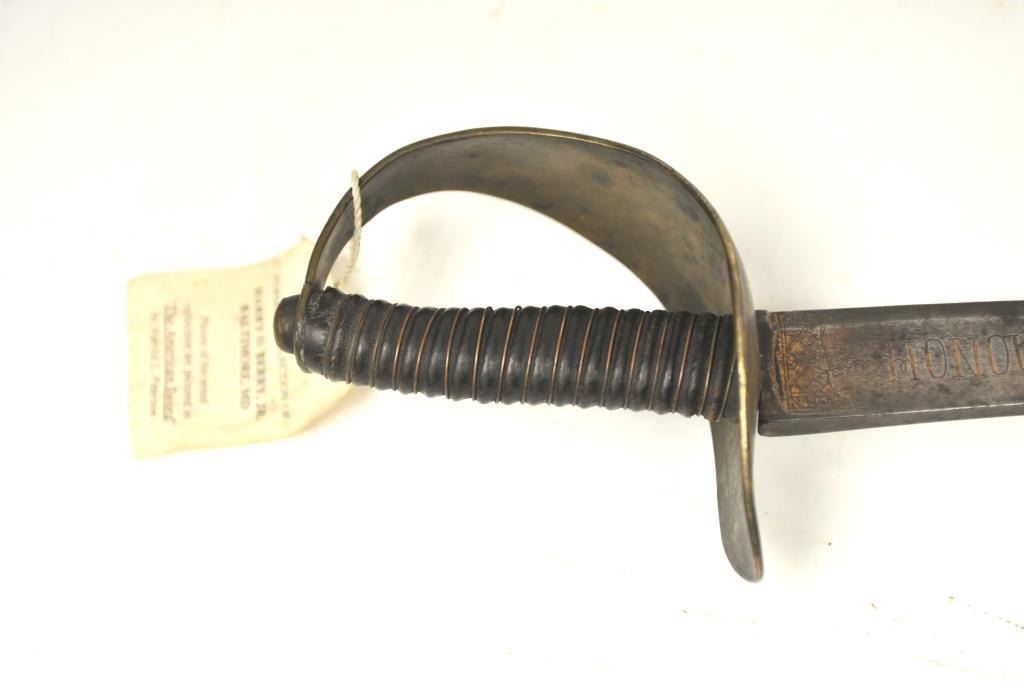 Early American “D” guard cuttless with engraved blade showing American eagle, stand of flags with liberty cap, sun, wreaths and “E Plurbus Unum” in banner along with “Honor and My Country” in large block letter onreverse. Measures 34” overall with a 29” blade. Single wire wrapped leather grip in very good condition. Brass alloy guard with deep patina. The blade shows some light gold remnants and hints of blue. The tag reads“Harry D. Berry Jr. BaltO MD” and pieces from this collection featured in “The American Sword” by Harold Peterson. Est.: $1500-$3000