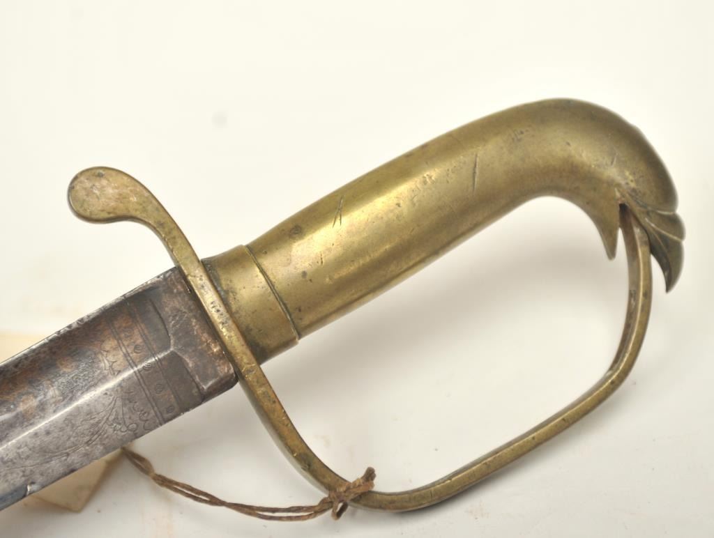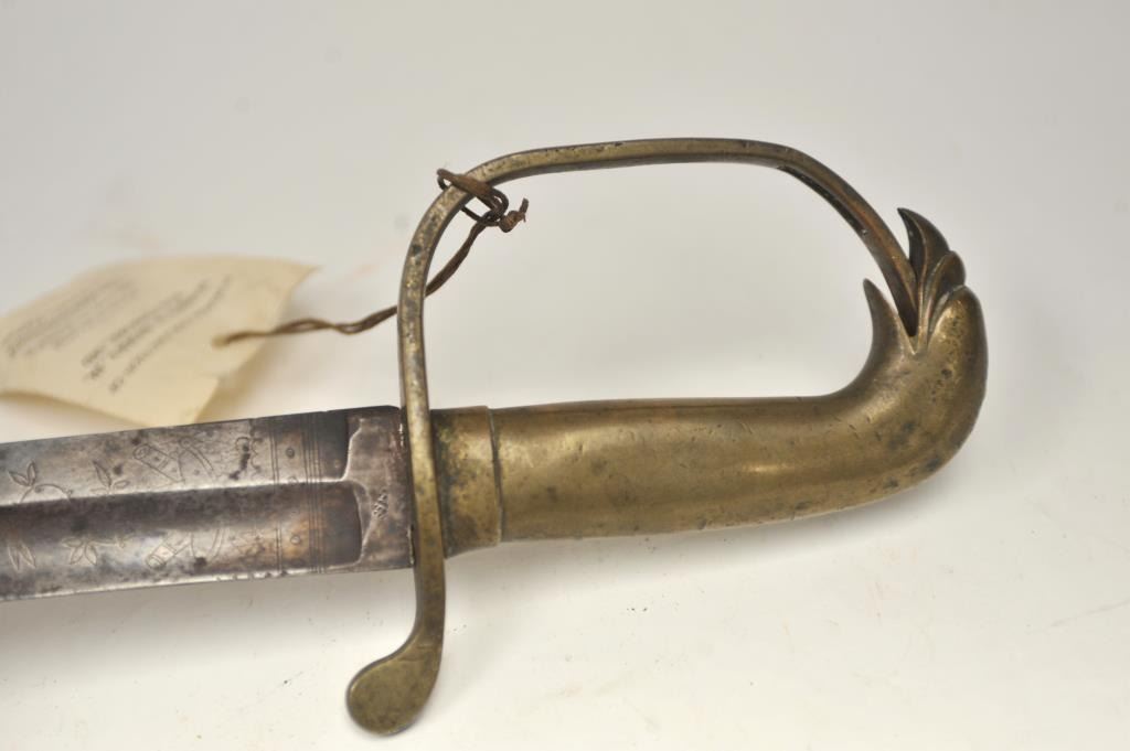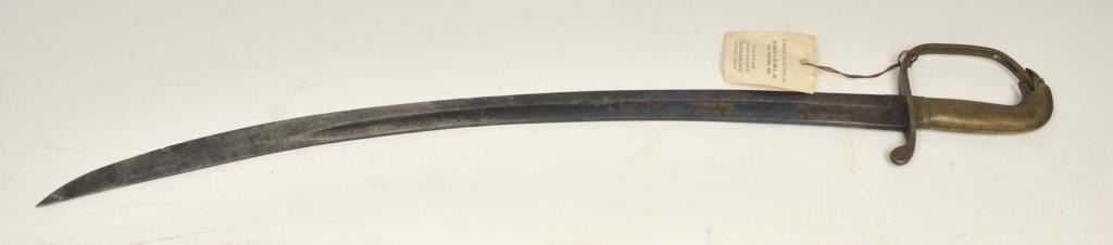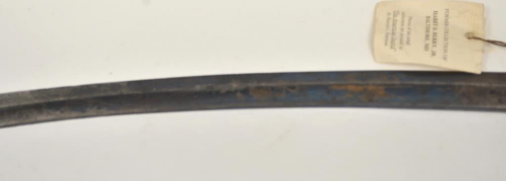 American Federal era sword with cast brass eagle head grip and “D” guard. Measures 32 ½” overall with a 27 ½” blued and gilt blade. Very good condition with 30%-50% original toning blue remaining and some originalbright polish. Minor pitting and normal aging with great patina on hilt and brass. Tag attached reads Tag attached reads “Former Collection of, Harry D. Berry Jr., Baltimore, MD”. Pieces of his noted collection arepictured in “The American Sword” by Harold Peterson. Nearly 1 ½” wide at the widest part. Rarely encountered and no scabbard remains. Est.: $700-$1400